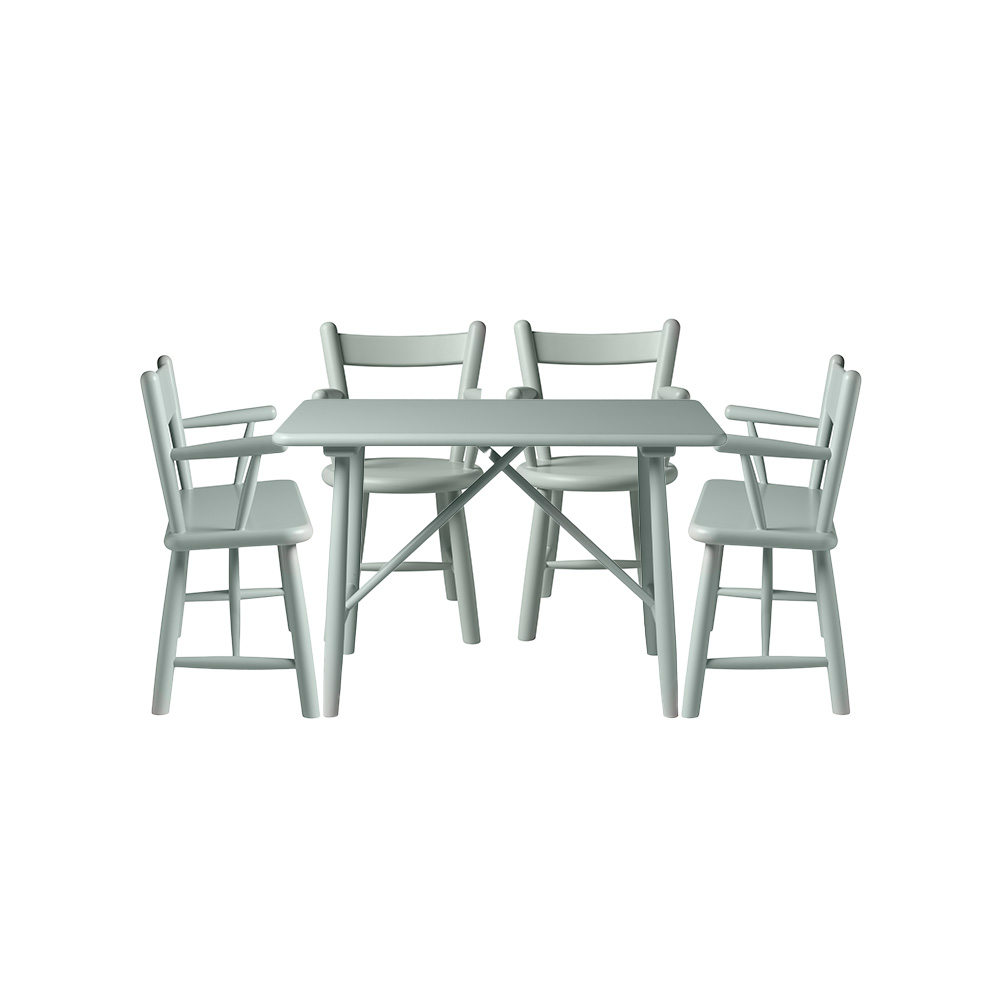 Die Möbel sind aus lackierter Buche gefertigt und erfordern nur minimale Pflege. Sie lassen sich mit einem feuchten Tuch abwischen.