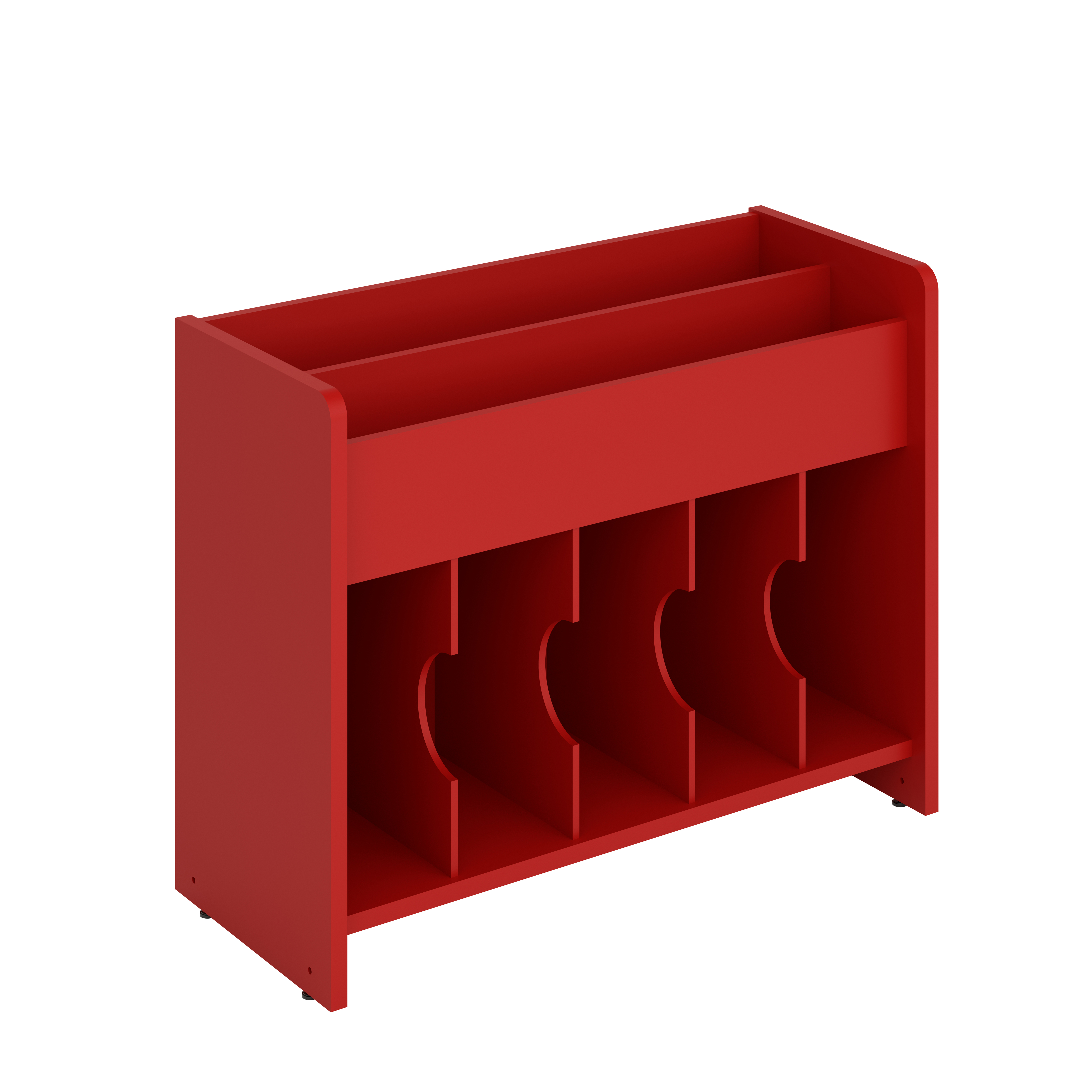 Bilderbuchtrog mit zwei Präsentationsfächern oben und funf Aufbewahrungsfächern unten.