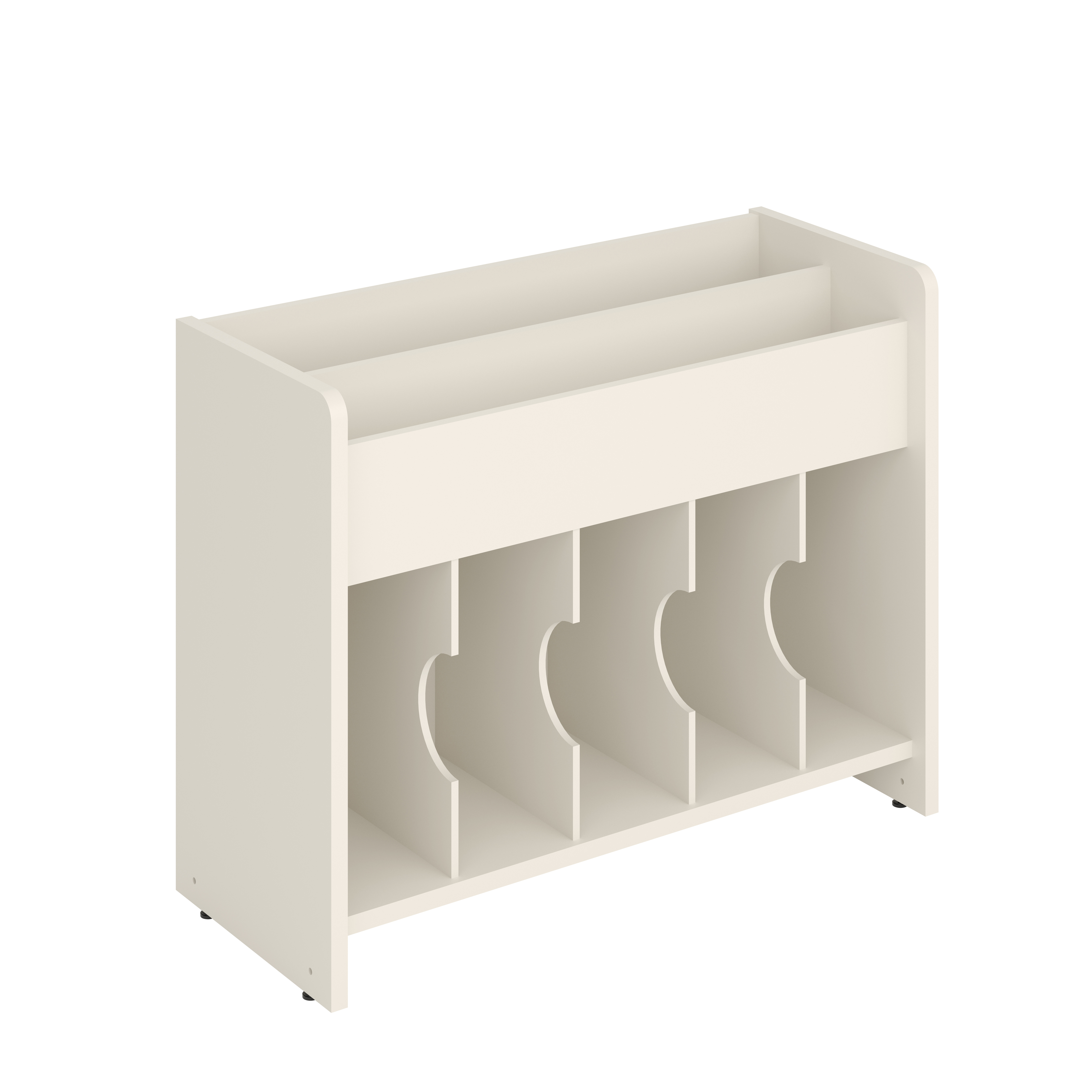 Bilderbuchtrog mit zwei Präsentationsfächern oben und funf Aufbewahrungsfächern unten.
