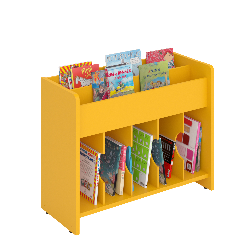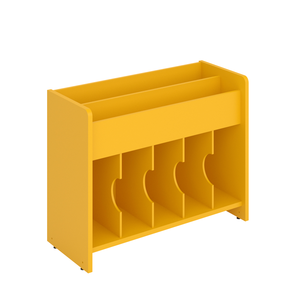 Bilderbuchtrog mit zwei Präsentationsfächern oben und funf Aufbewahrungsfächern unten.