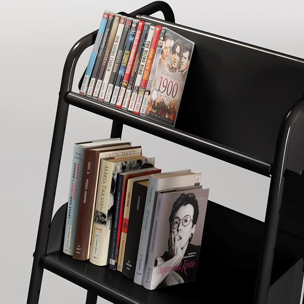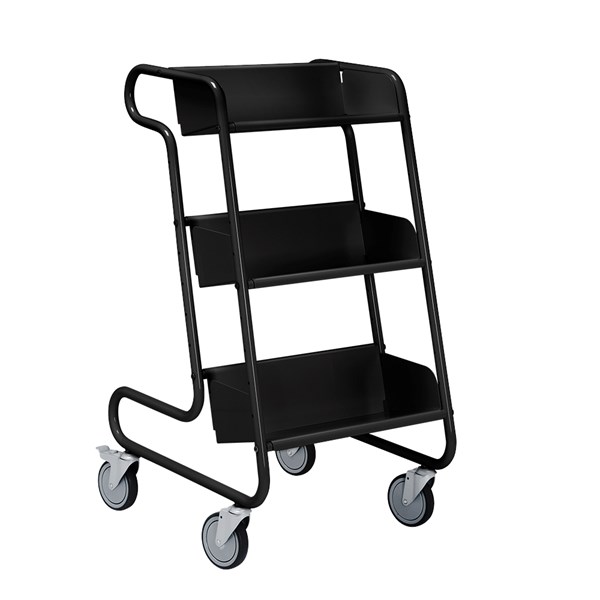 Einseitiger Bücherwagen mit drei geneigten Fachböden die entfernt und für verschiedene Arten von Büchern und CD/DVD Medien verwendet können.