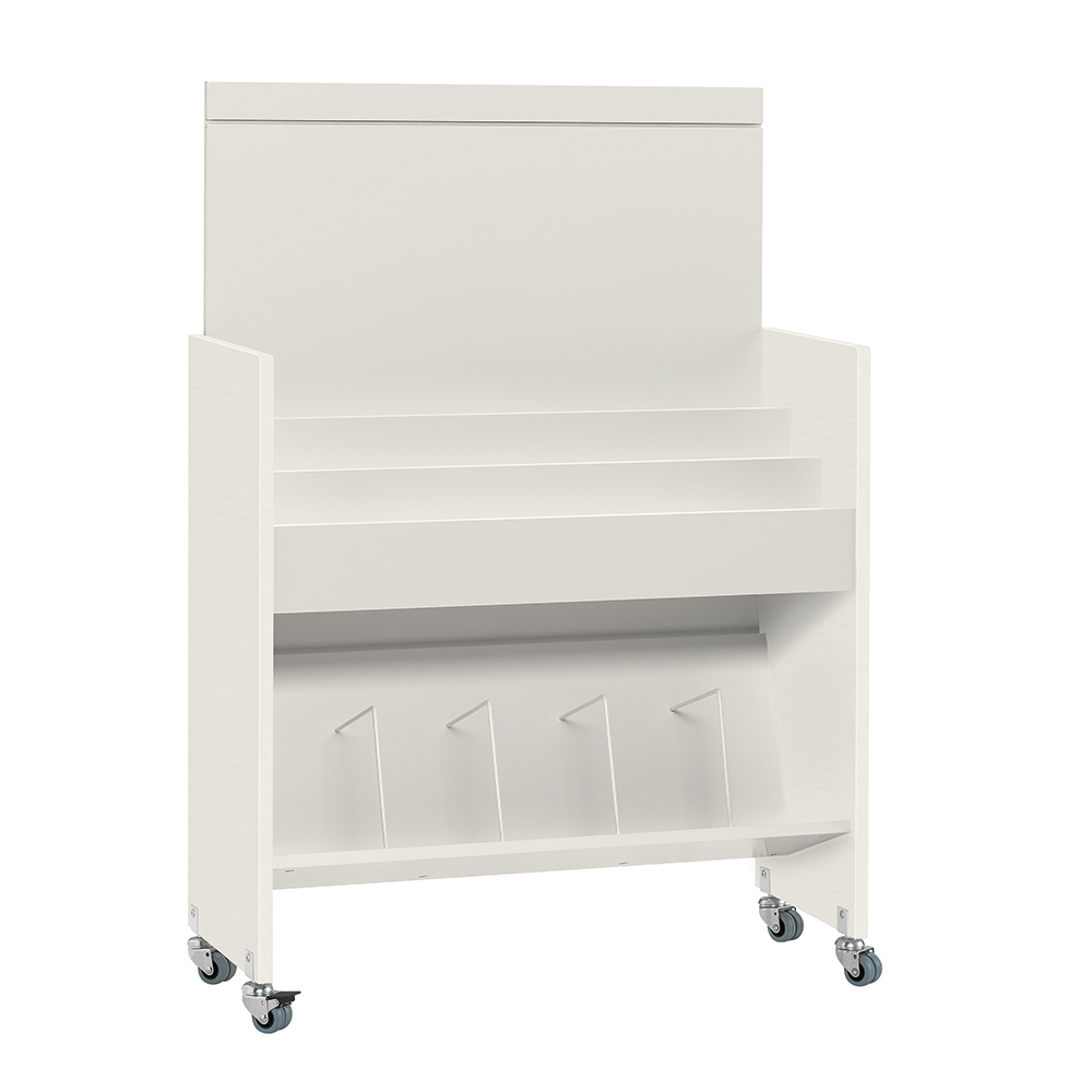 Bilderbuchtrog mit drei Präsentationsfächern oben und Aufbewahrungsfach unten.