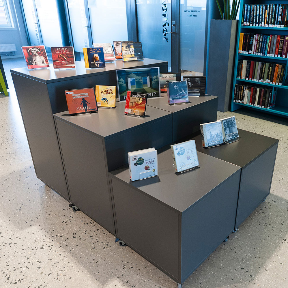 Maria ist eine Serie von Podien mit Trog erhältlich in zwei Größen (50 cm und XL 64 cm) und drei Höhen (Mini, Midi und Maxi) für flexible Bibliothekseinrichtungen.