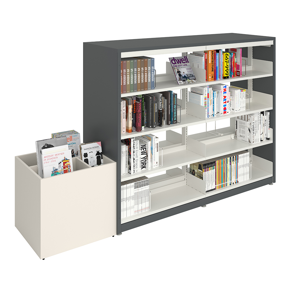 Maria ist eine Serie von Podien mit Trog erhältlich in zwei Größen (50 cm und XL 64 cm) und drei Höhen (Mini, Midi und Maxi) für flexible Bibliothekseinrichtungen.