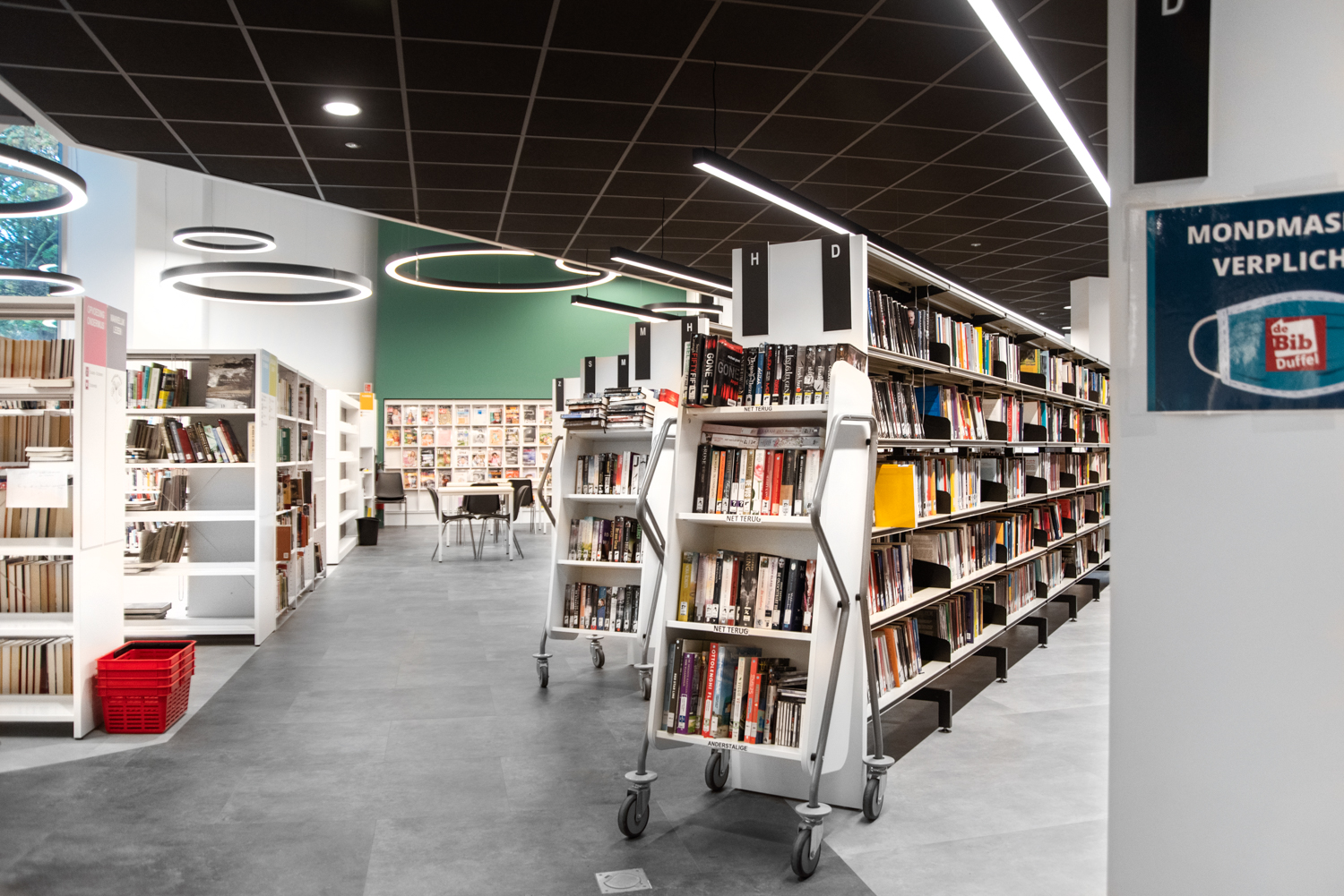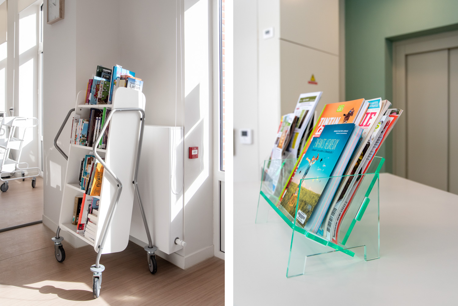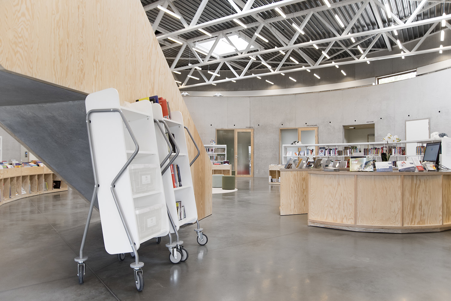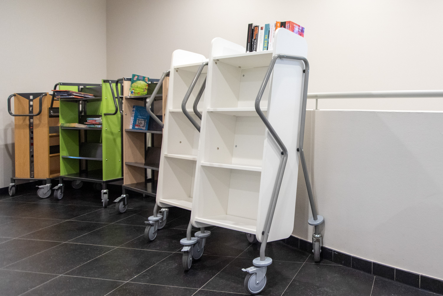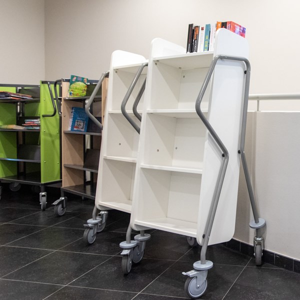 Die Neigung des Bücherwagens sorgt für eine sichere Medienunterbringung und bietet eine gute Übersicht über die jeweiligen Bücher.