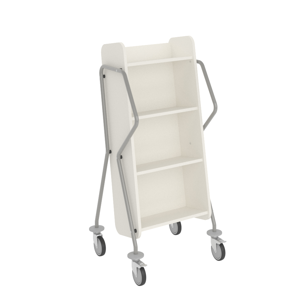 Einseitiger, abgeschrägter Bücherwagen mit vier Fachböden. Großzügiger Platz zwischen den Fachböden um größere Medien untzerzubringen.