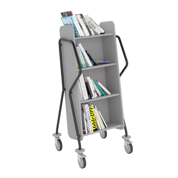 Einseitiger, abgeschrägter Bücherwagen mit vier Fachböden. Großzügiger Platz zwischen den Fachböden um größere Medien untzerzubringen.