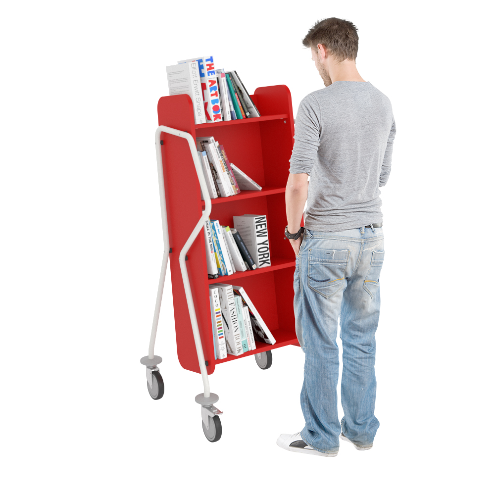 Die Neigung des Bücherwagens sorgt für eine sichere Medienunterbringung und bietet eine gute Übersicht über die jeweiligen Bücher.