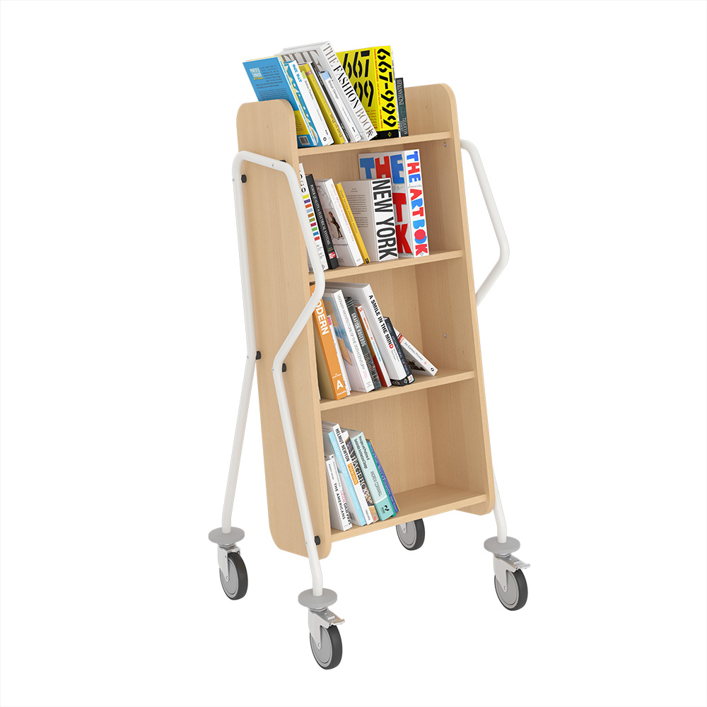 Einseitiger, abgeschrägter Bücherwagen mit vier Fachböden. Großzügiger Platz zwischen den Fachböden um größere Medien untzerzubringen.