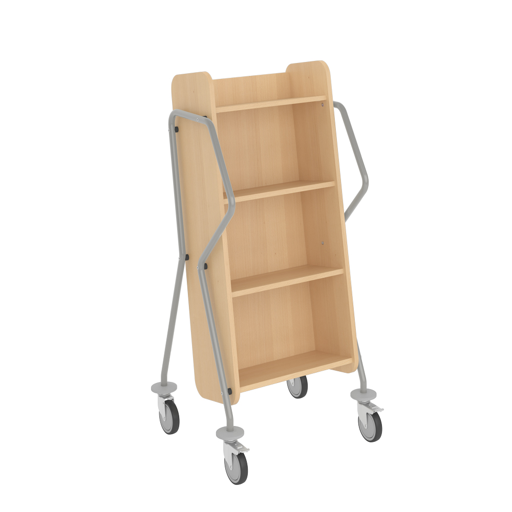 Einseitiger, abgeschrägter Bücherwagen mit vier Fachböden. Großzügiger Platz zwischen den Fachböden um größere Medien untzerzubringen.