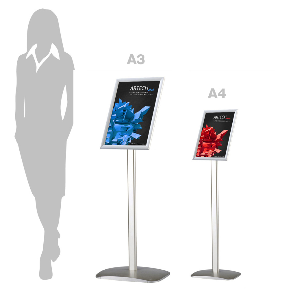 Klemmrahmenständer mit 25 mm Profil. Ein stabiler Fuß und eine nichtreflektierende Folie machen diesen Ständer unabdingbar in der ganzen Bibliothek und im Eingangsbereich.