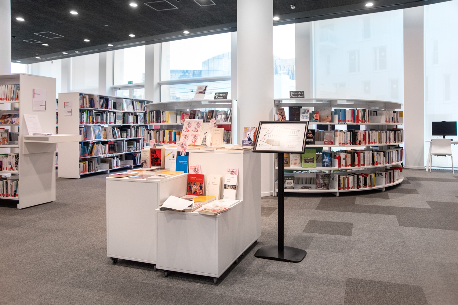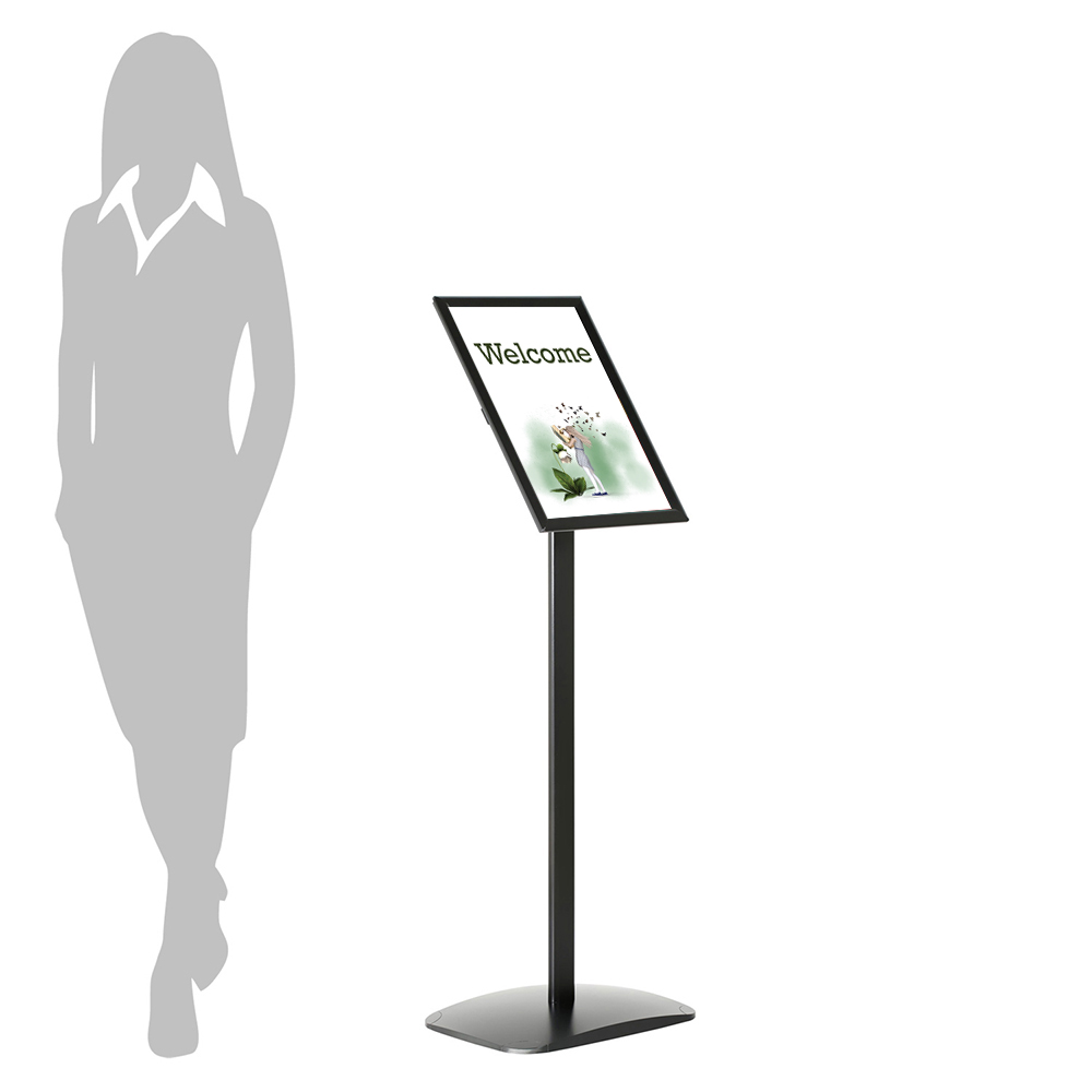 Klemmrahmenständer mit 25 mm Profil. Ein stabiler Fuß und eine nichtreflektierende Folie machen diesen Ständer unabdingbar in der ganzen Bibliothek und im Eingangsbereich.