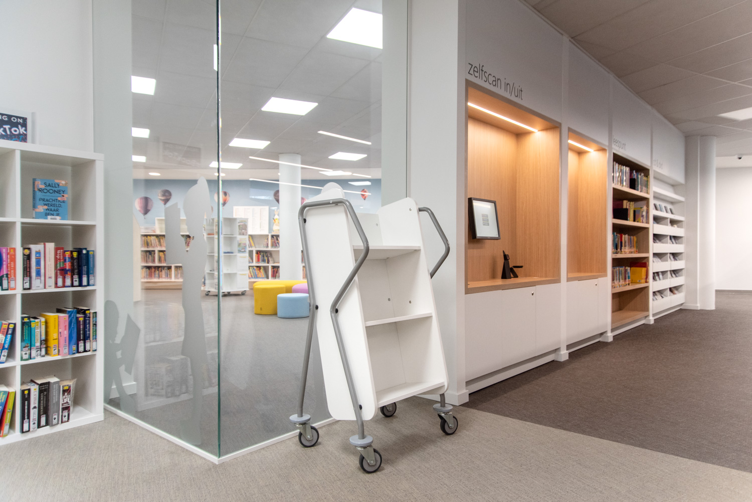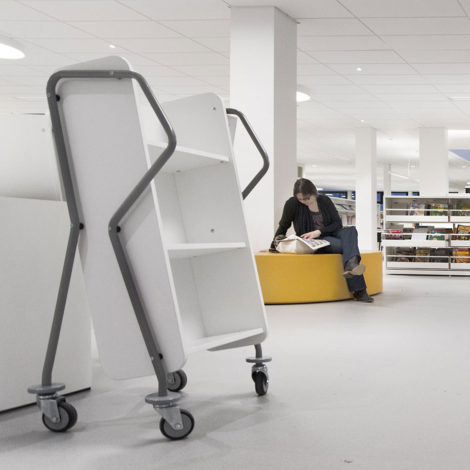 Die Neigung des Bücherwagens sorgt für eine sichere Medienunterbringung und bietet eine gute Übersicht über die jeweiligen Bücher.