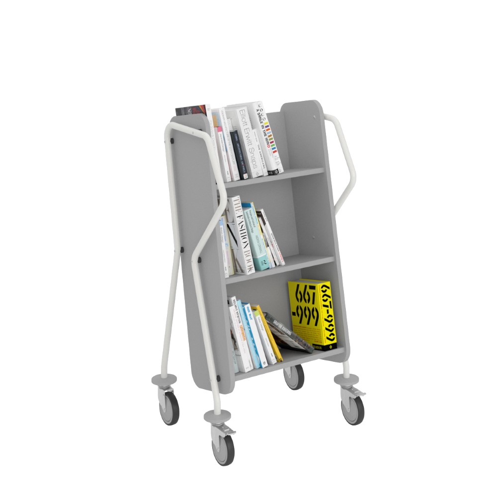 Einseitiger, abgeschrägter Bücherwagen mit drei Fachböden. Großzügiger Platz zwischen den Fachböden um größere Medien untzerzubringen.