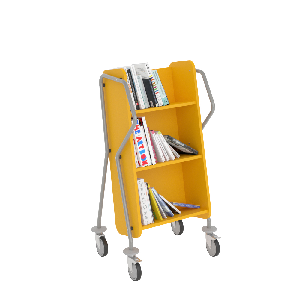 Einseitiger, abgeschrägter Bücherwagen mit drei Fachböden. Großzügiger Platz zwischen den Fachböden um größere Medien untzerzubringen.