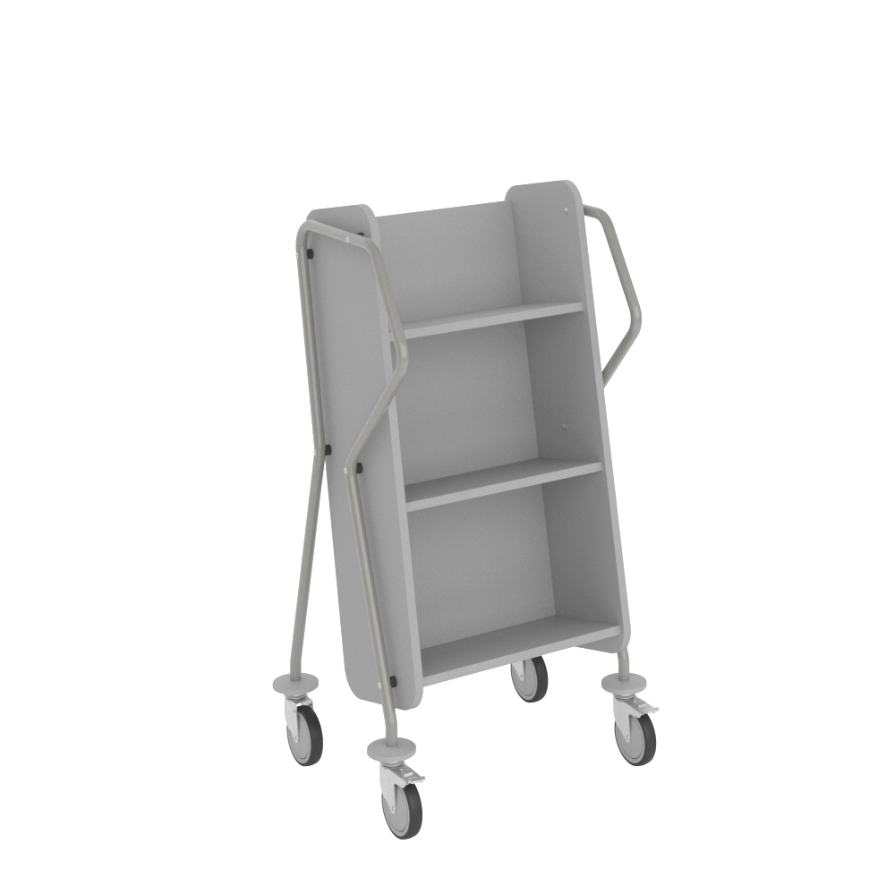Einseitiger, abgeschrägter Bücherwagen mit drei Fachböden. Großzügiger Platz zwischen den Fachböden um größere Medien untzerzubringen.