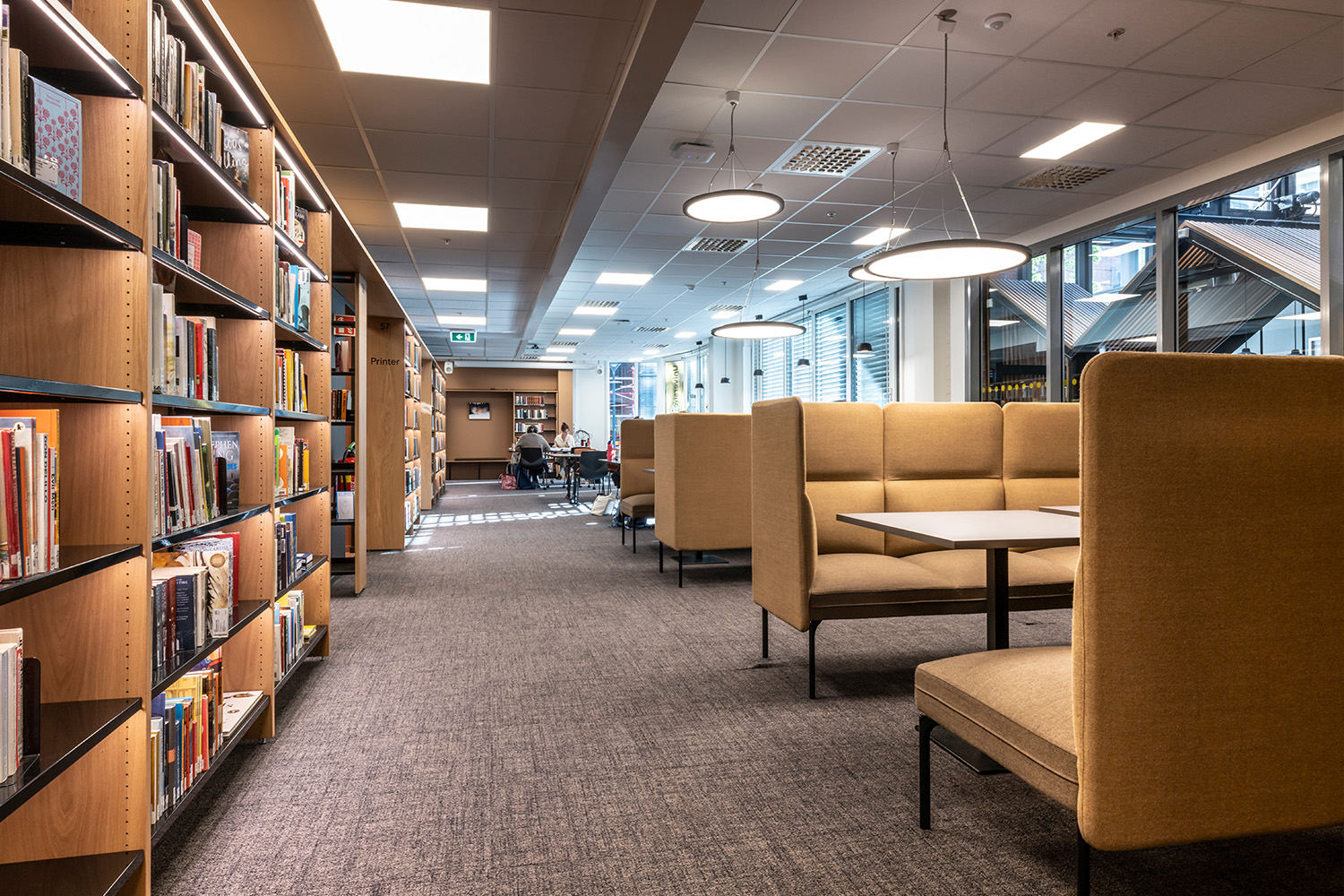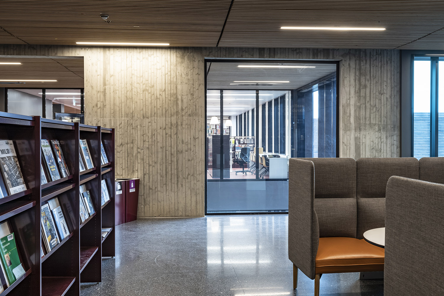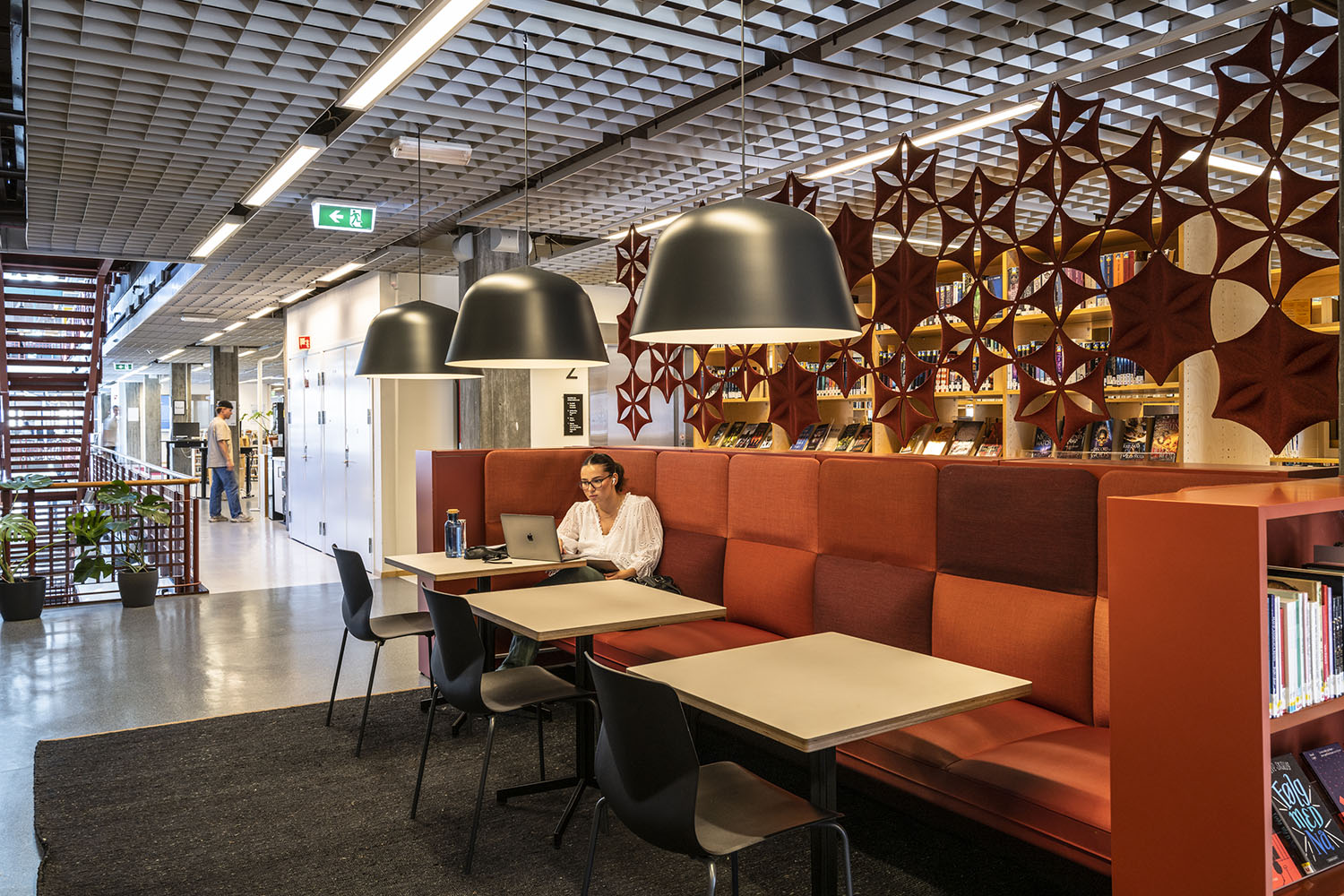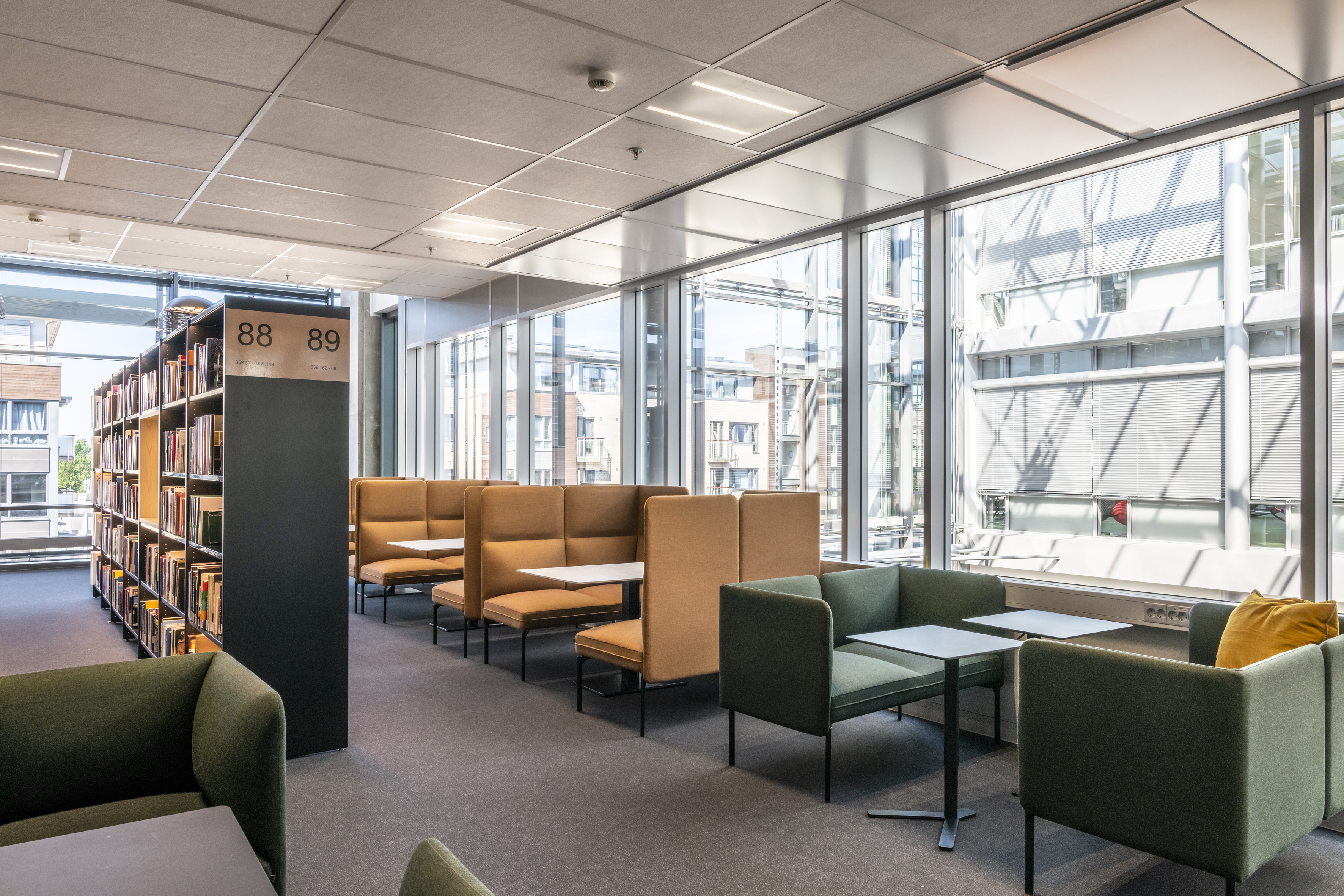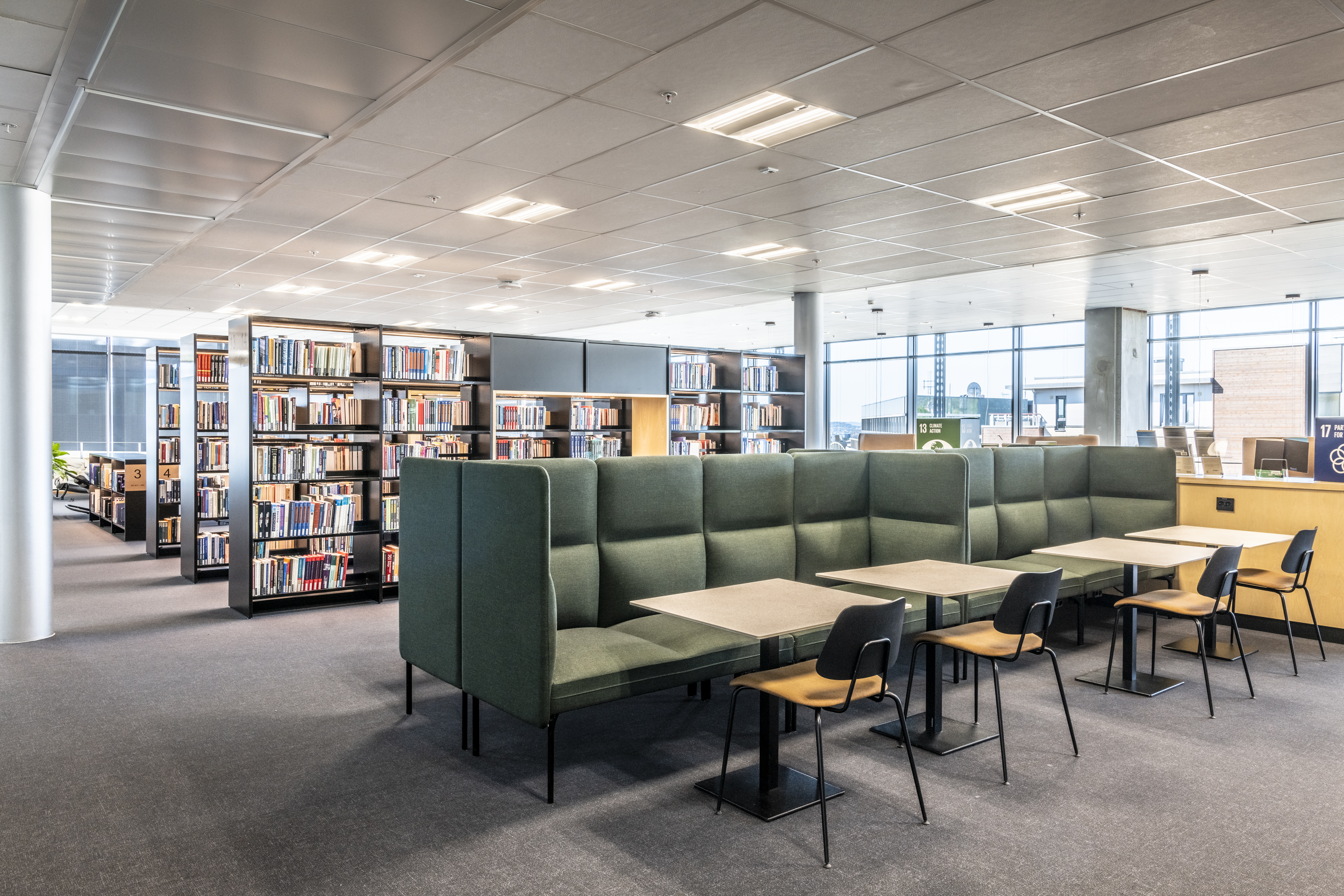 Die Serie berücksichtigt die akustischen Herausforderungen, denen Sie in der Bibliothek mit ihren unterschiedlichen Rückenlehnenhöhen begegnen können, welche Lärm ausblenden. Es ist möglich, einen Rahmen mit Eichenplatten zu wählen, die helfen, den Raum in ruhige Zonen für Entspannung und tolle Gespräche zu unterteilen.
