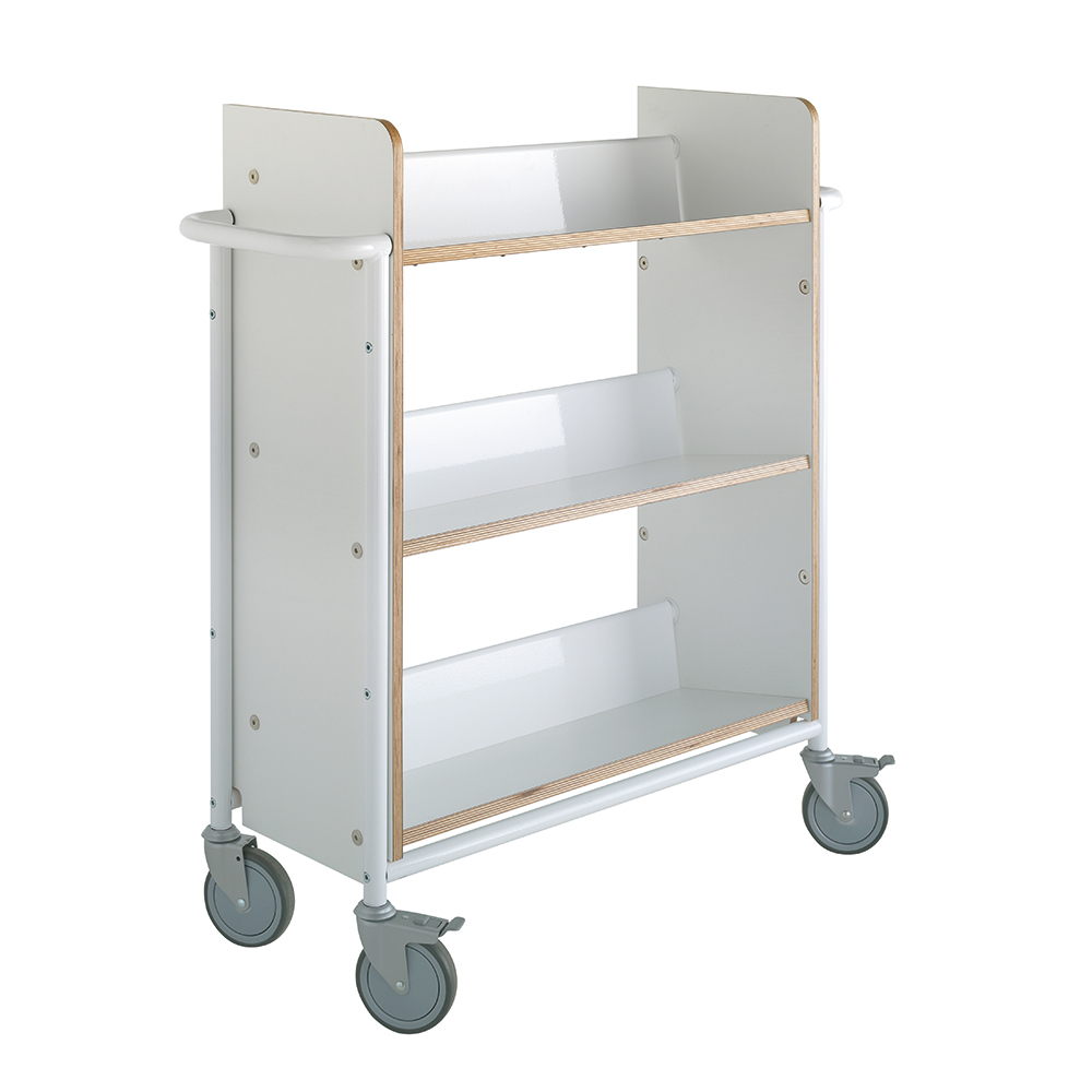 Einseitiger Wagen mit drei festen, rückwärts geneigten Fachböden. Die Neigung sorgt für eine sichere Medienunterbringung.