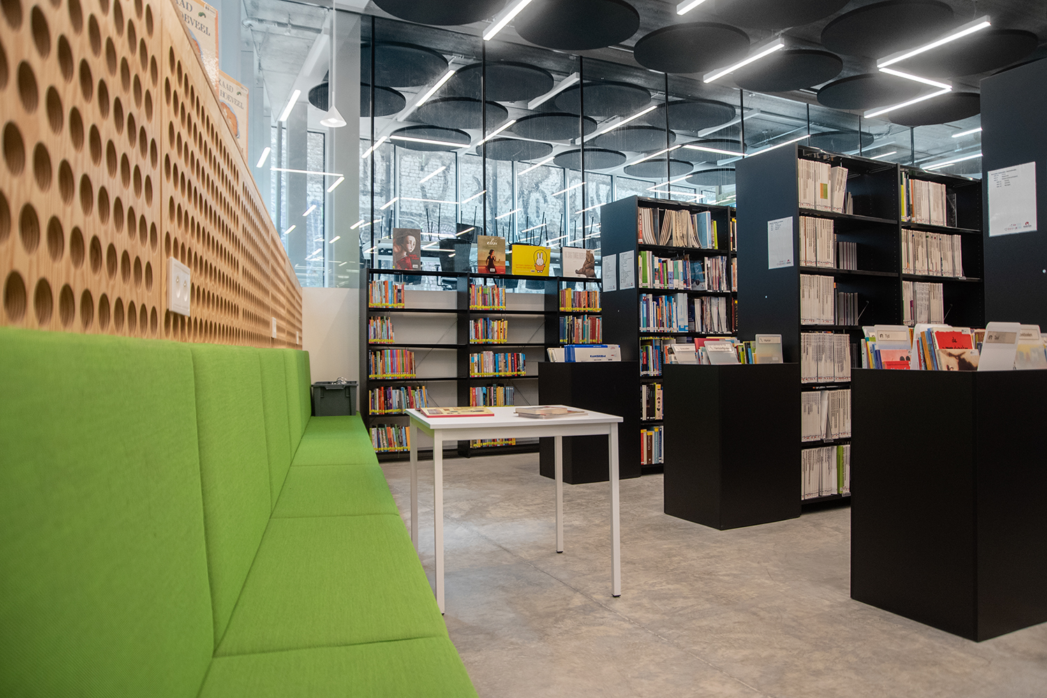 Hier geht es um laminiertes Birkensperrholz, auf dem Foto mit sichtbaren Kanten. Damit lassen sich eine strapazierfähige Oberfläche und eine langlebige Konstruktion erzielen. Ideal für die meisten stark beanspruchten Bibliotheksumgebungen!