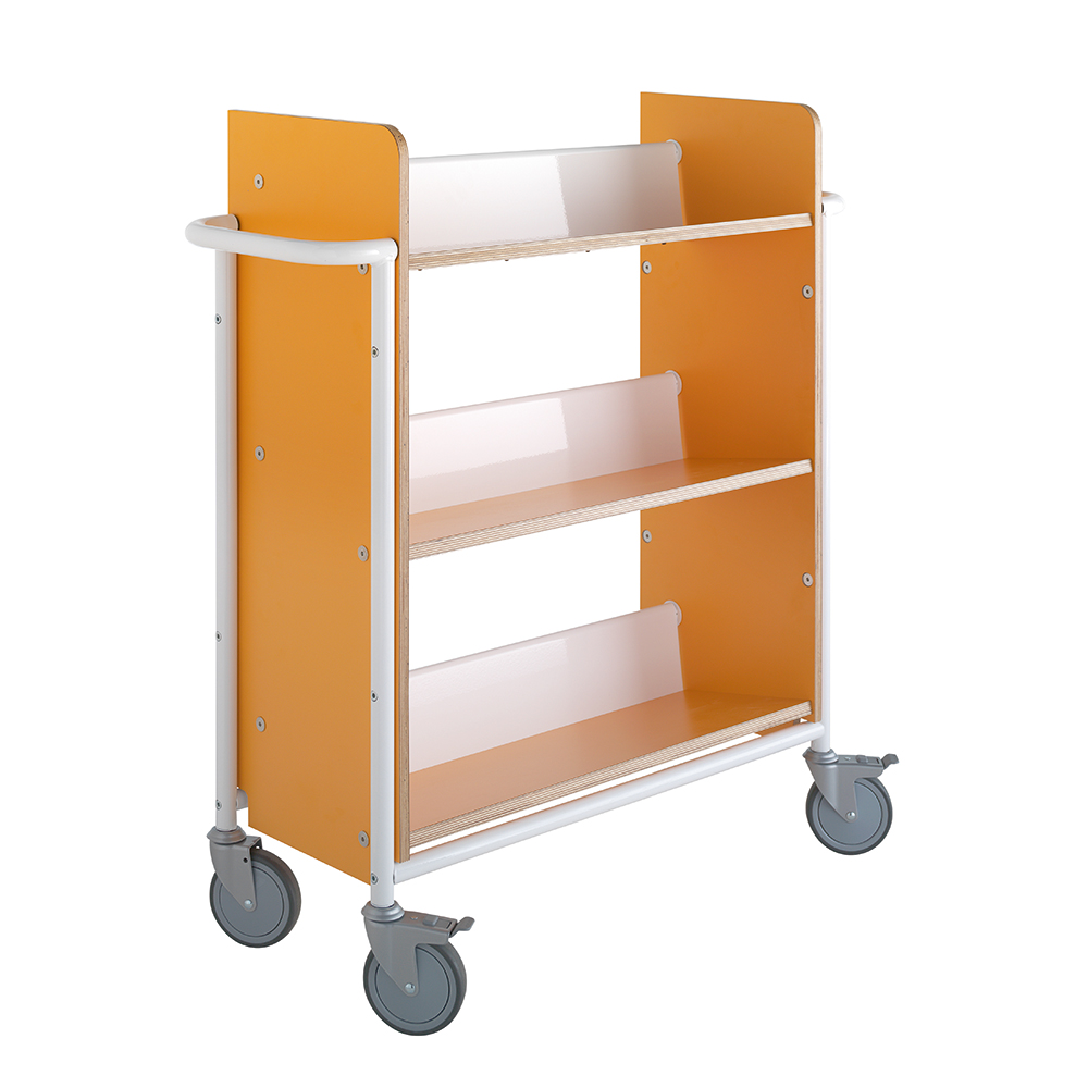 Einseitiger Wagen mit drei festen, rückwärts geneigten Fachböden. Die Neigung sorgt für eine sichere Medienunterbringung.