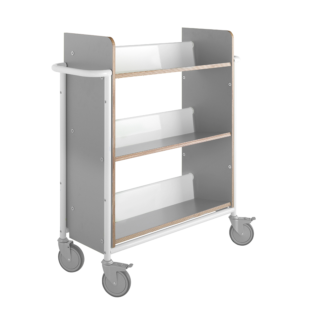 Einseitiger Wagen mit drei festen, rückwärts geneigten Fachböden. Die Neigung sorgt für eine sichere Medienunterbringung.