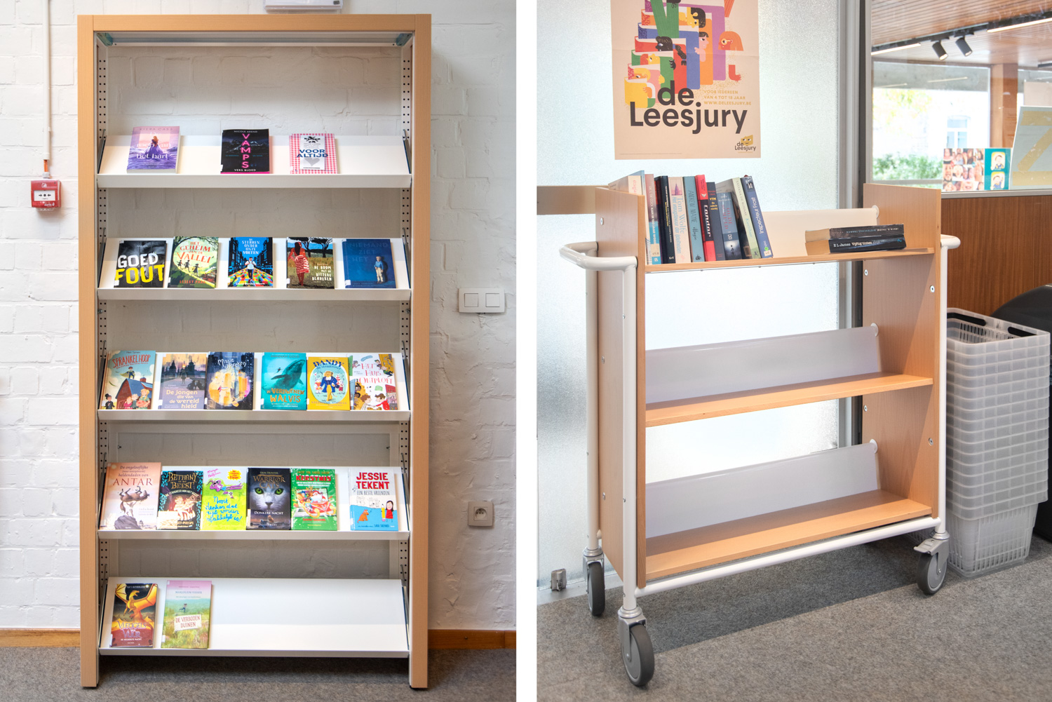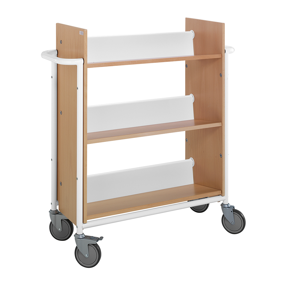 Einseitiger Wagen mit drei festen, rückwärts geneigten Fachböden. Die Neigung sorgt für eine sichere Medienunterbringung.
