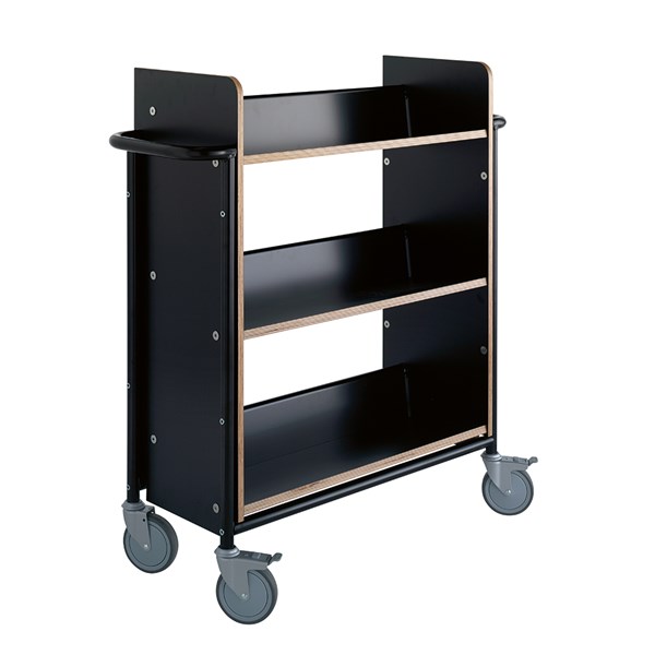 Einseitiger Wagen mit drei festen, rückwärts geneigten Fachböden. Die Neigung sorgt für eine sichere Medienunterbringung.