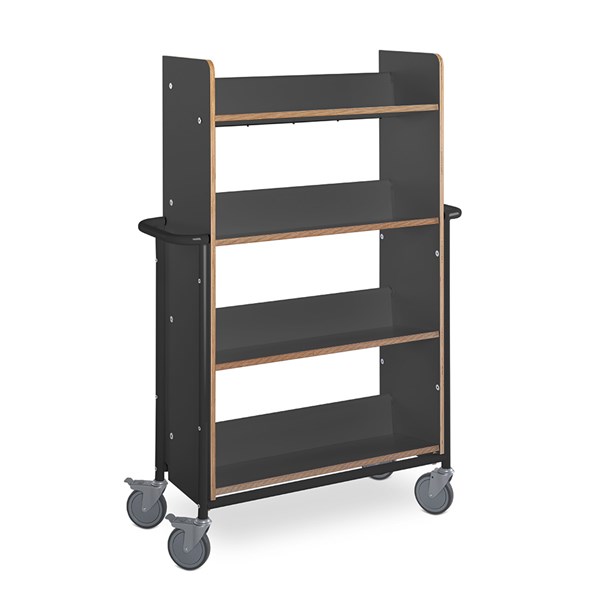 Einseitiger Wagen mit vier festen, rückwärts geneigten Fachböden. Die Neigung sorgt für eine sichere Medienunterbringung.