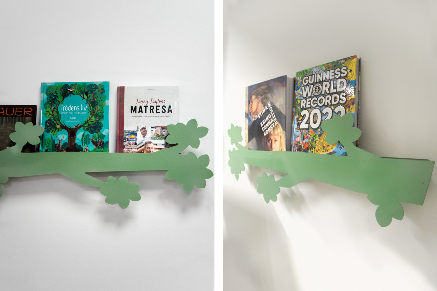 Ebenso dekorative wie praktische Präsentationsleisten für Bücher und andere Medien.Die Besucher ernten die Früchte in Form der neu eingetroffenen Titel, die Appetit auf mehr machen.