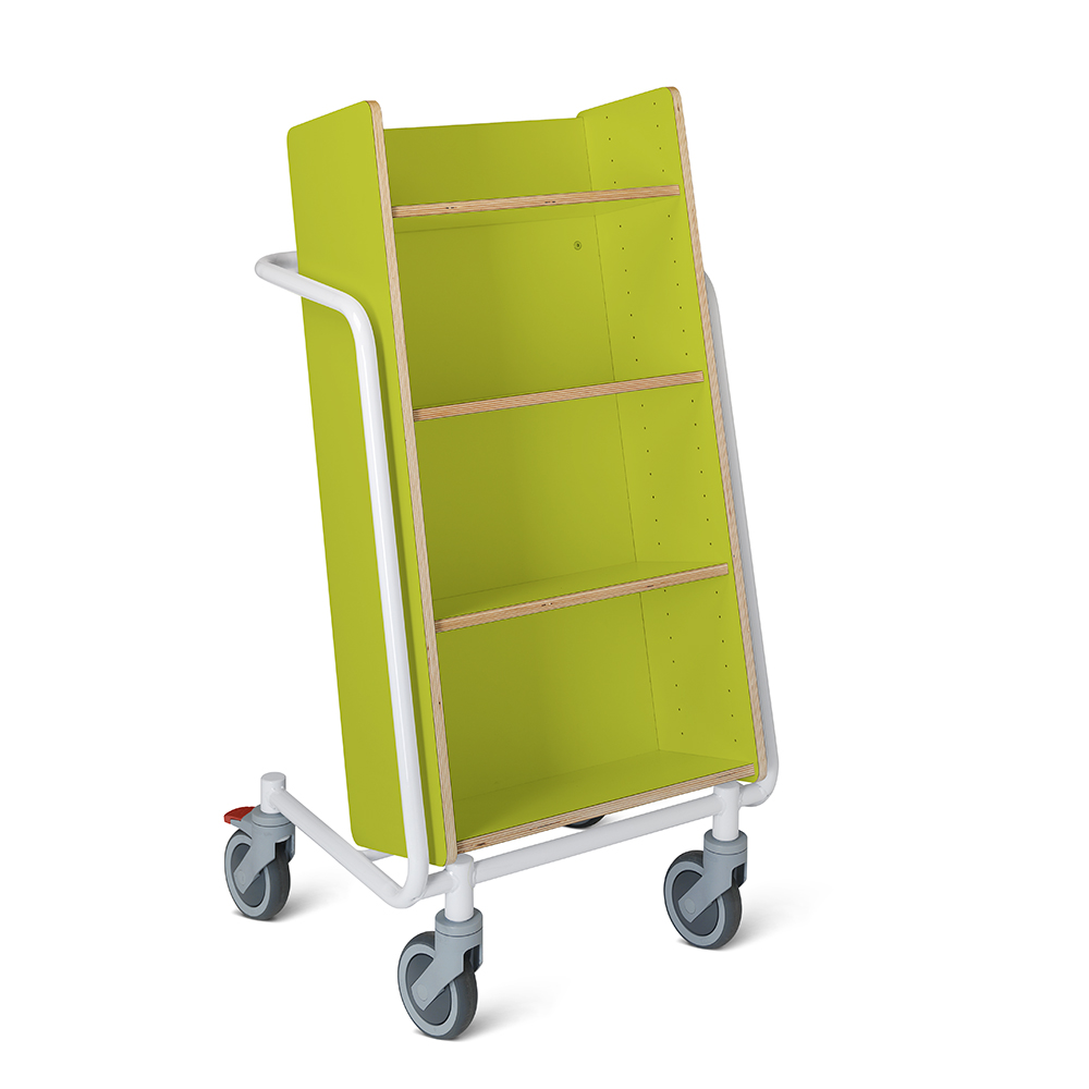 Die Neigung des Bücherwagens sorgt für eine sichere Medienunterbringung und bietet eine gute Übersicht über die jeweiligen Bücher.