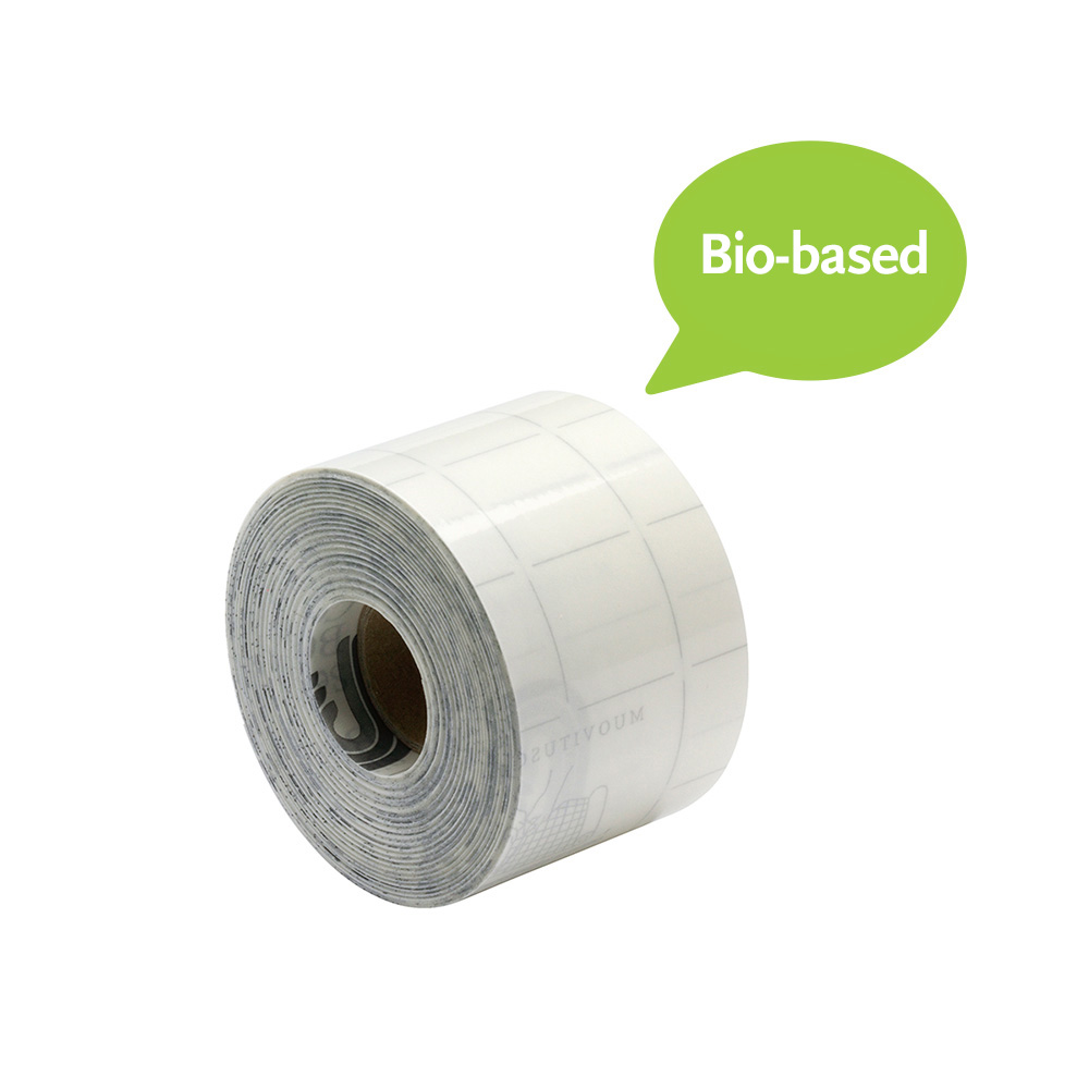 Der selbstklebende, glänzende Klebeband besteht aus Kunststoff auf biologischer Basis (75% Zuckerrohr) und Acrylkleber auf Wasserbasis.