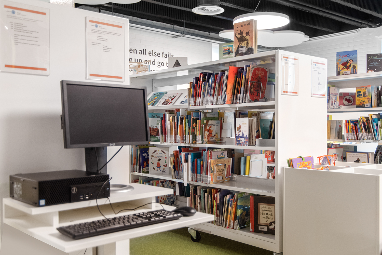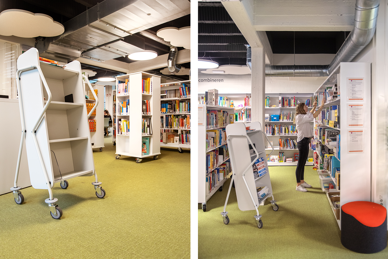 Die renovierte Mediathek verfügt über ein warmes und einladendes Interieur und bietet ausreichend Platz für Meetings und längere Aufenthalte. Die Regalsysteme bestehen aus niedrigen, weißen Regalen, die die Bibliothek leicht und überschaubar machen. Gleichzeitig ermöglicht das mobile Regal eine austauschbare Inneneinrichtung, die es einfach macht, die Platzierung der Bücher und das allgemeine Erscheinungsbild zu ändern.
