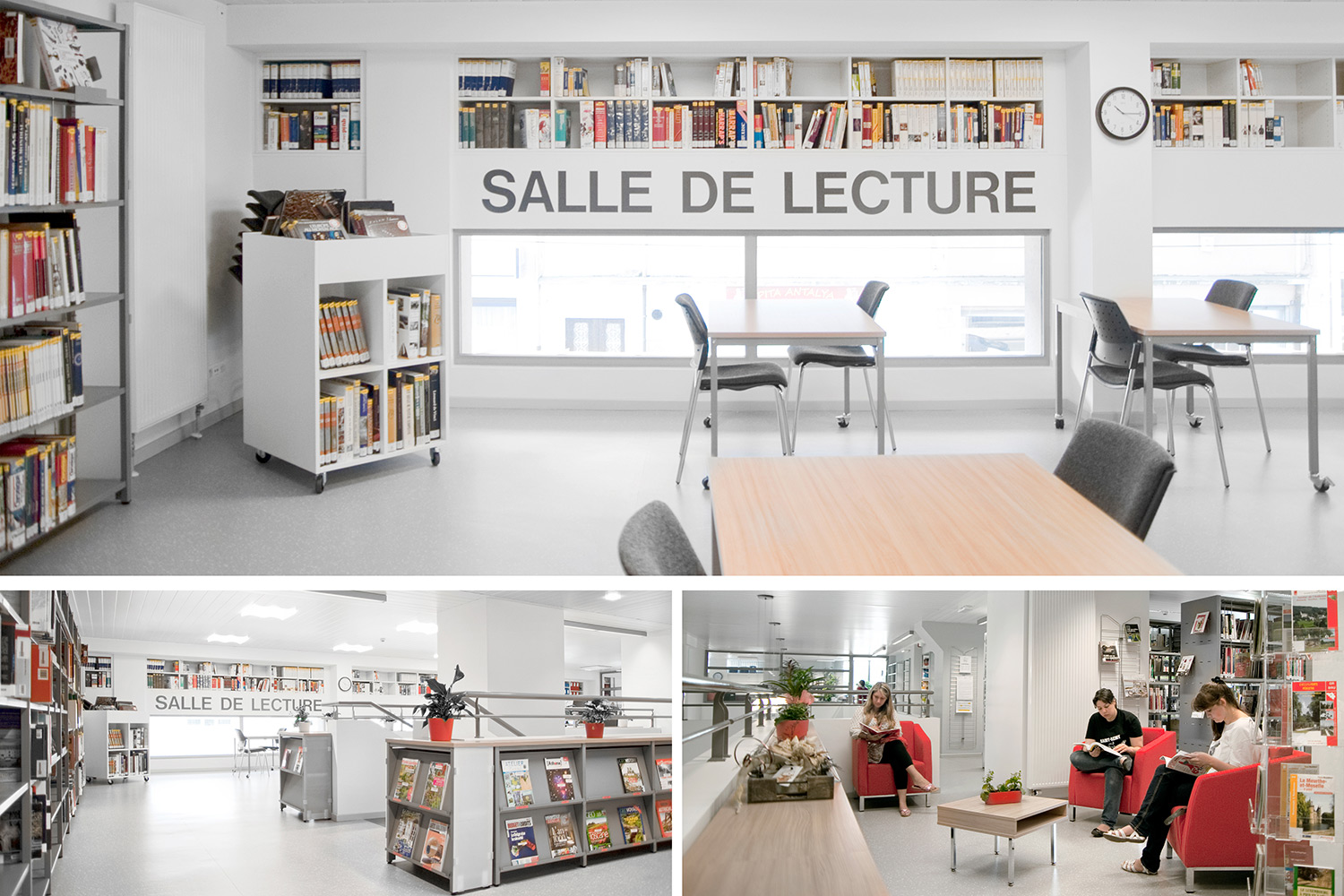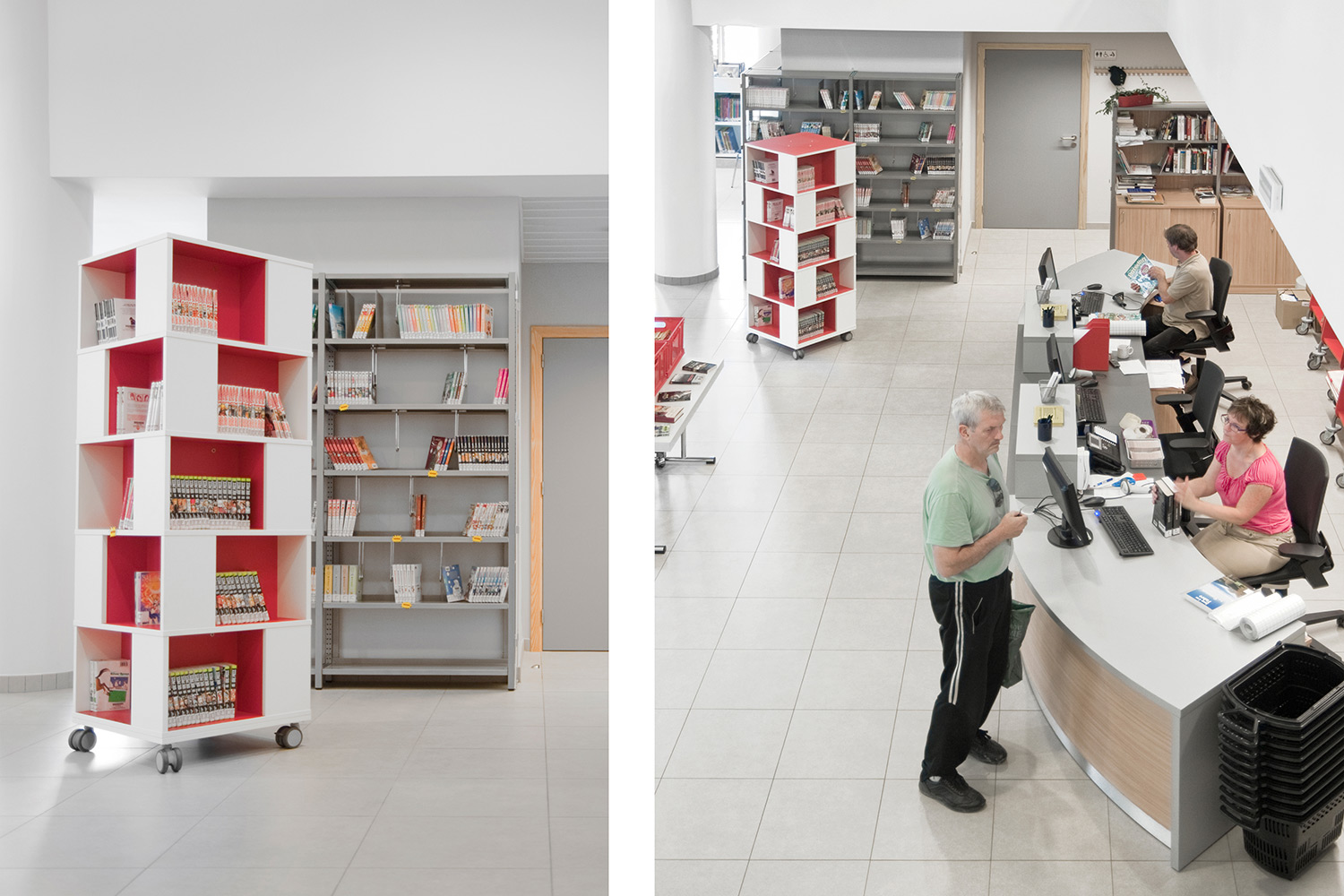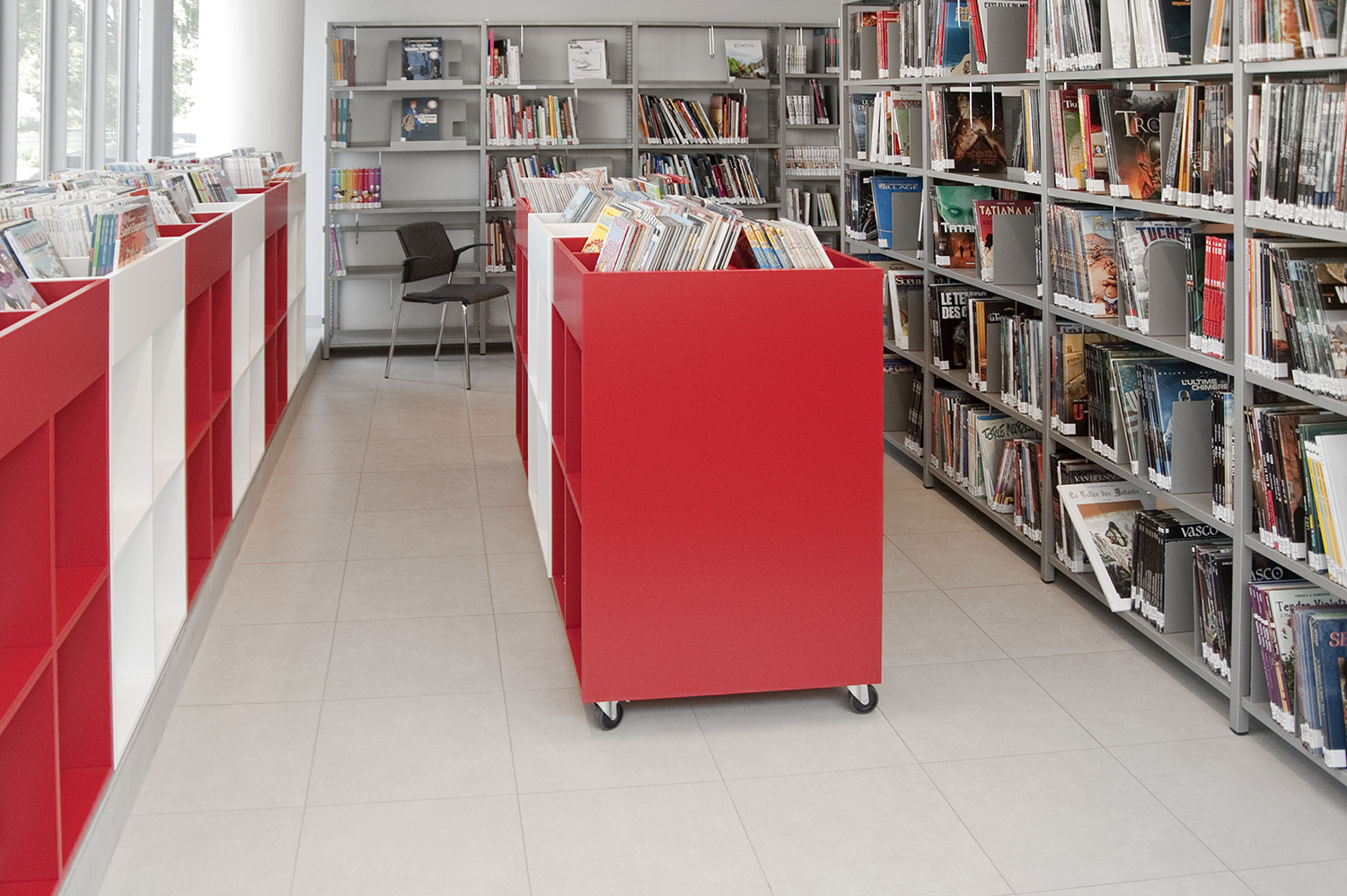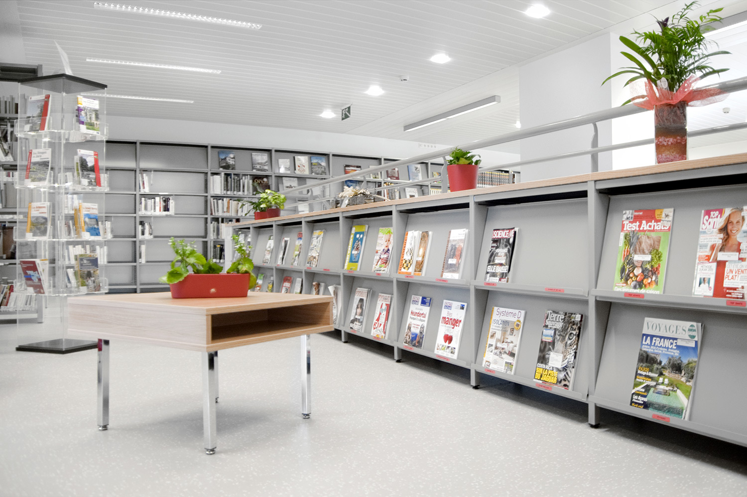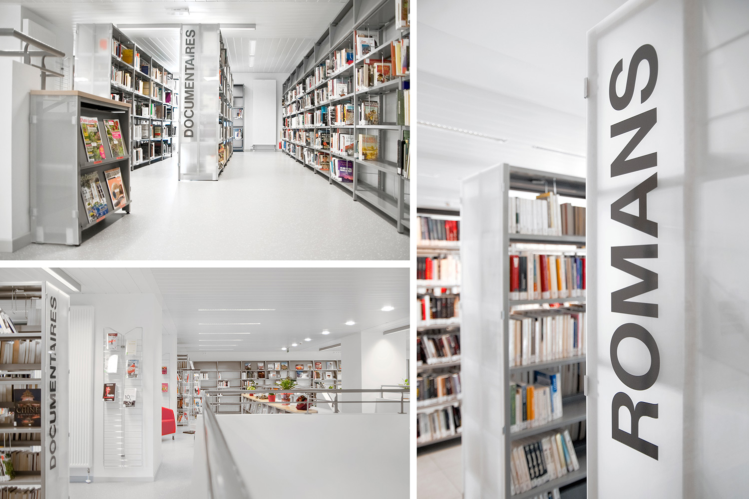 Das UNIFLEX-Regalsystem, mit variierenden Acryl-Seitenverkleidungen ausgestattet, eine Kinderspielecke und eine Ludothek, ergänzt mit komfortablen Sitzmöbeln sowie Lese- und Arbeitsplätzen, machen aus dieser Bibliothek einen einladenden Ort für ihre Benutzer und Angestellten.