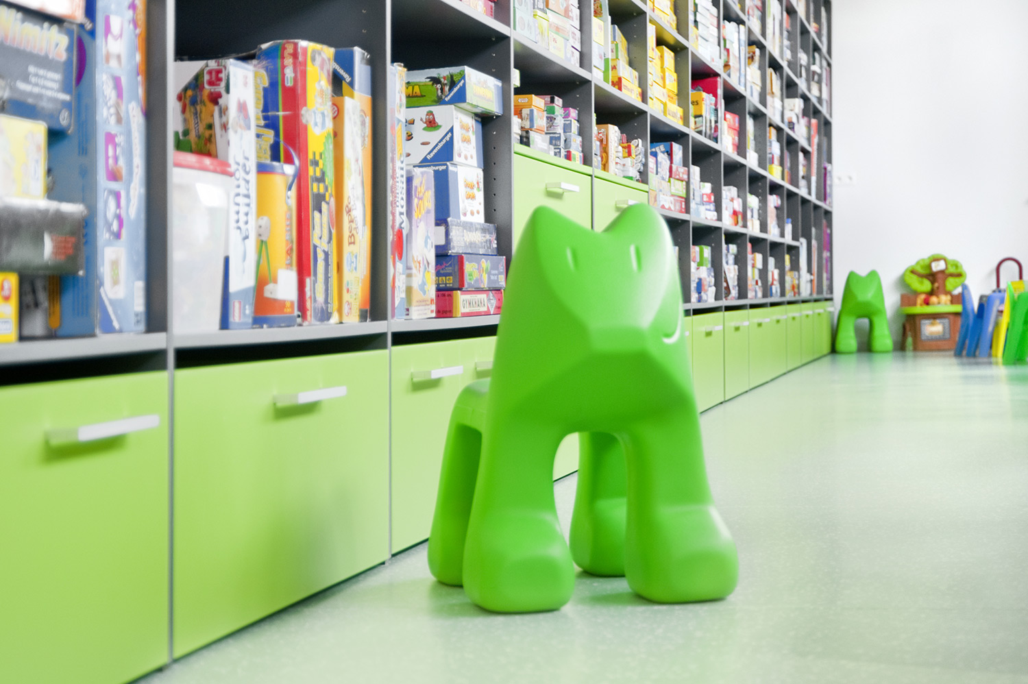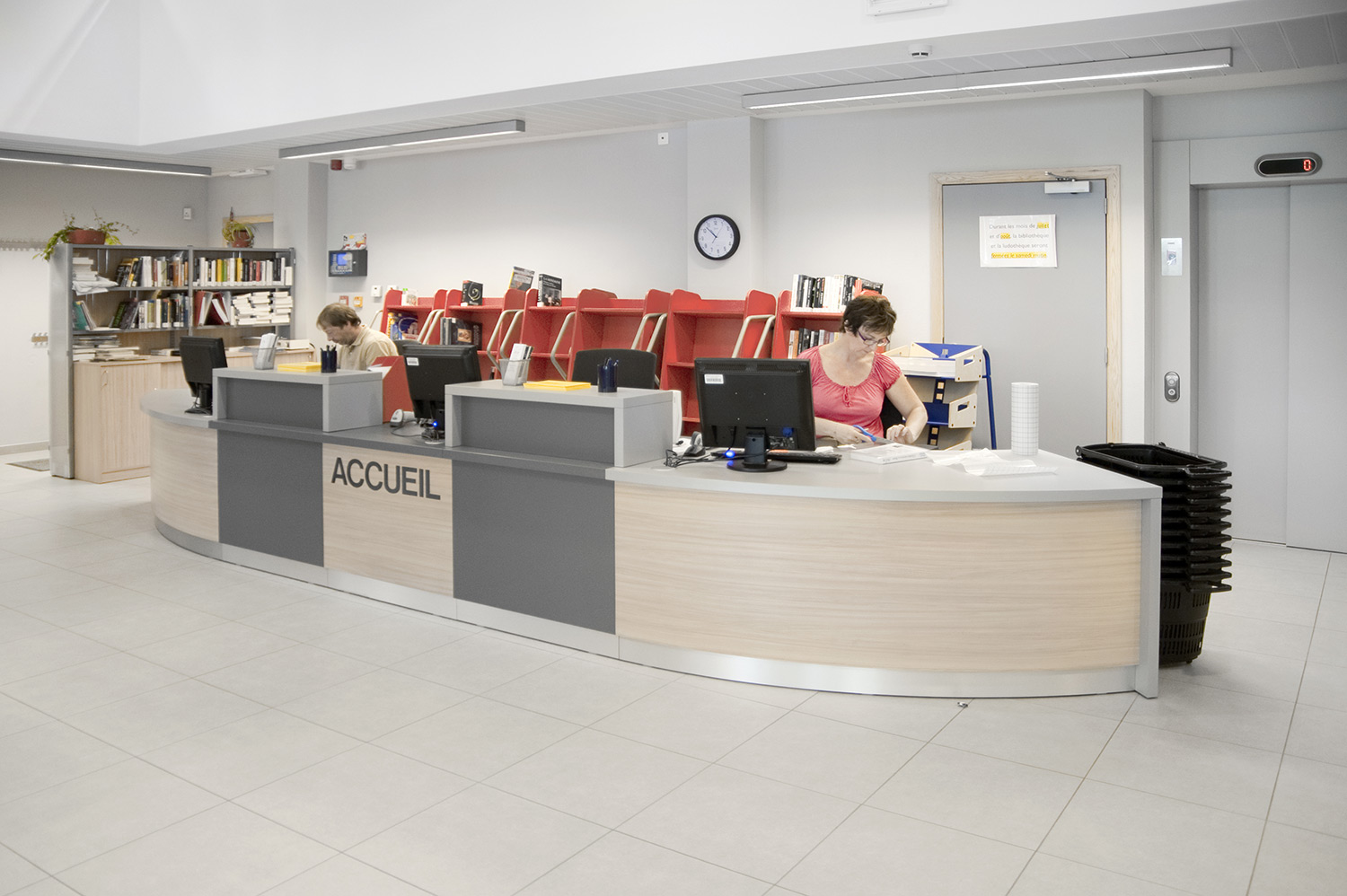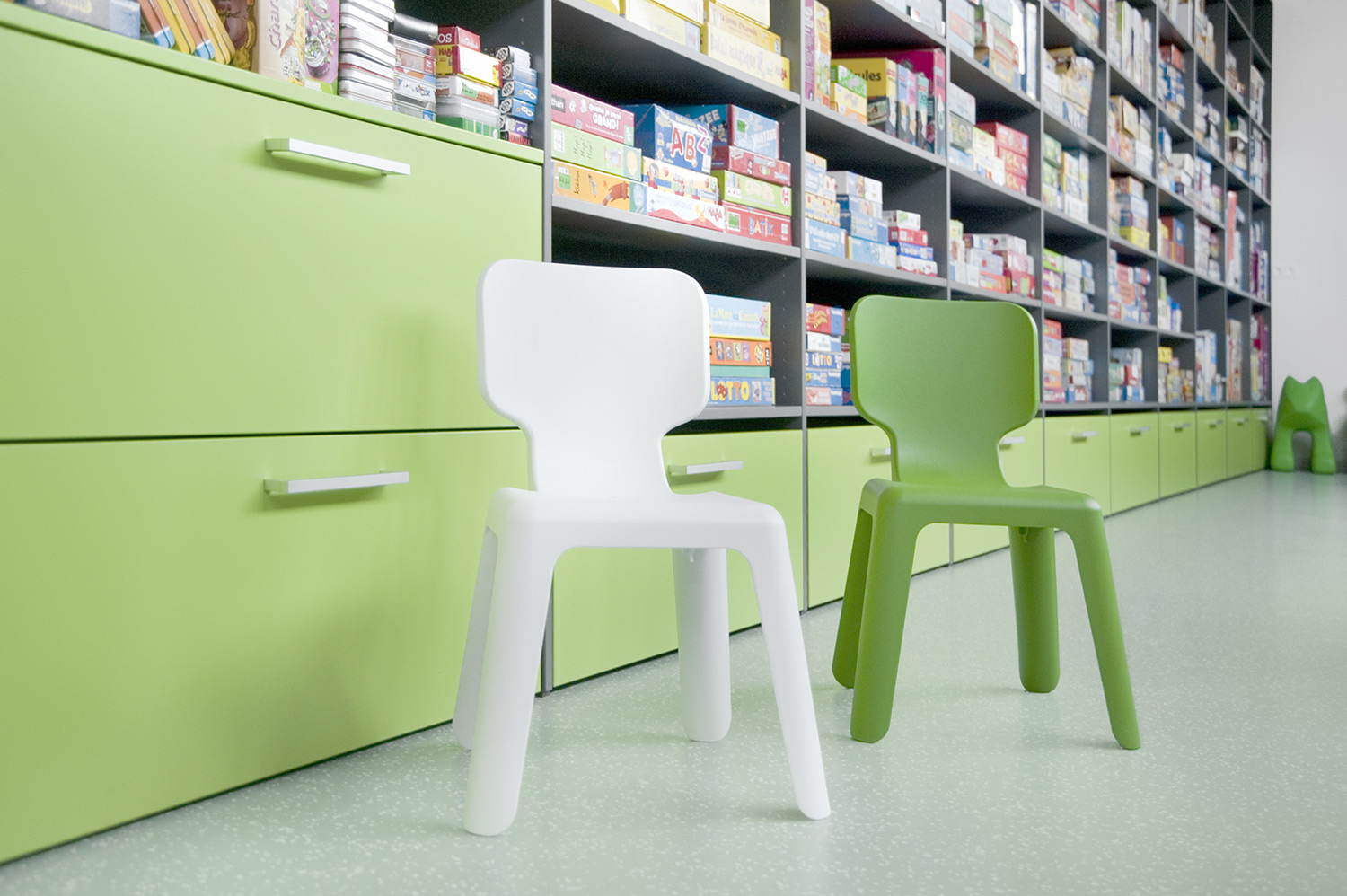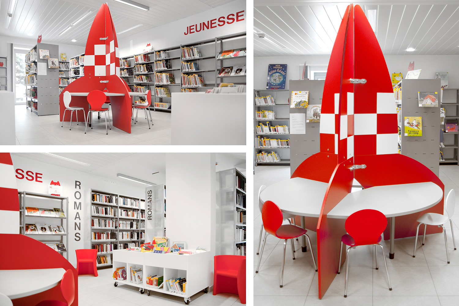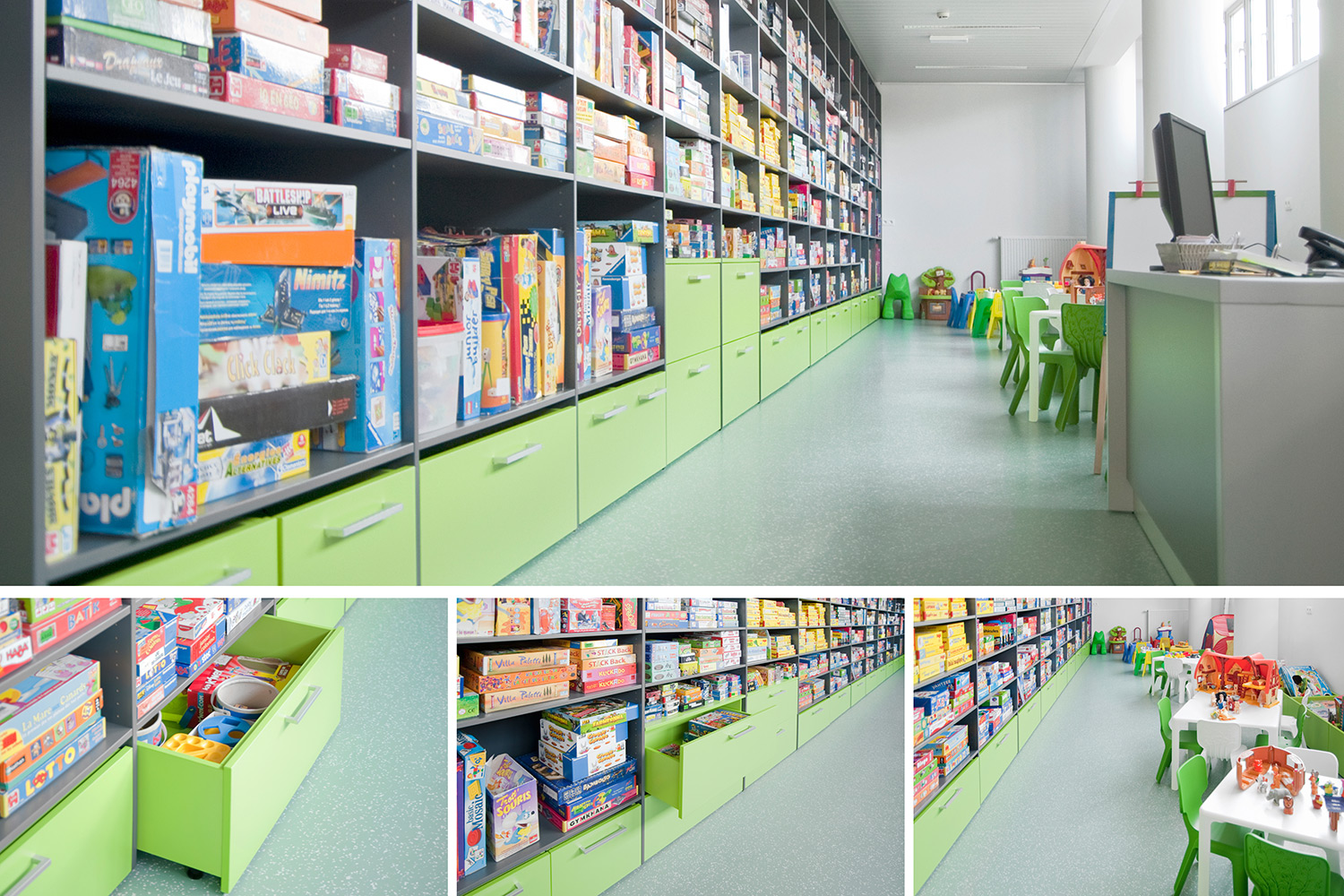 Das UNIFLEX-Regalsystem, mit variierenden Acryl-Seitenverkleidungen ausgestattet, eine Kinderspielecke und eine Ludothek, ergänzt mit komfortablen Sitzmöbeln sowie Lese- und Arbeitsplätzen, machen aus dieser Bibliothek einen einladenden Ort für ihre Benutzer und Angestellten.
