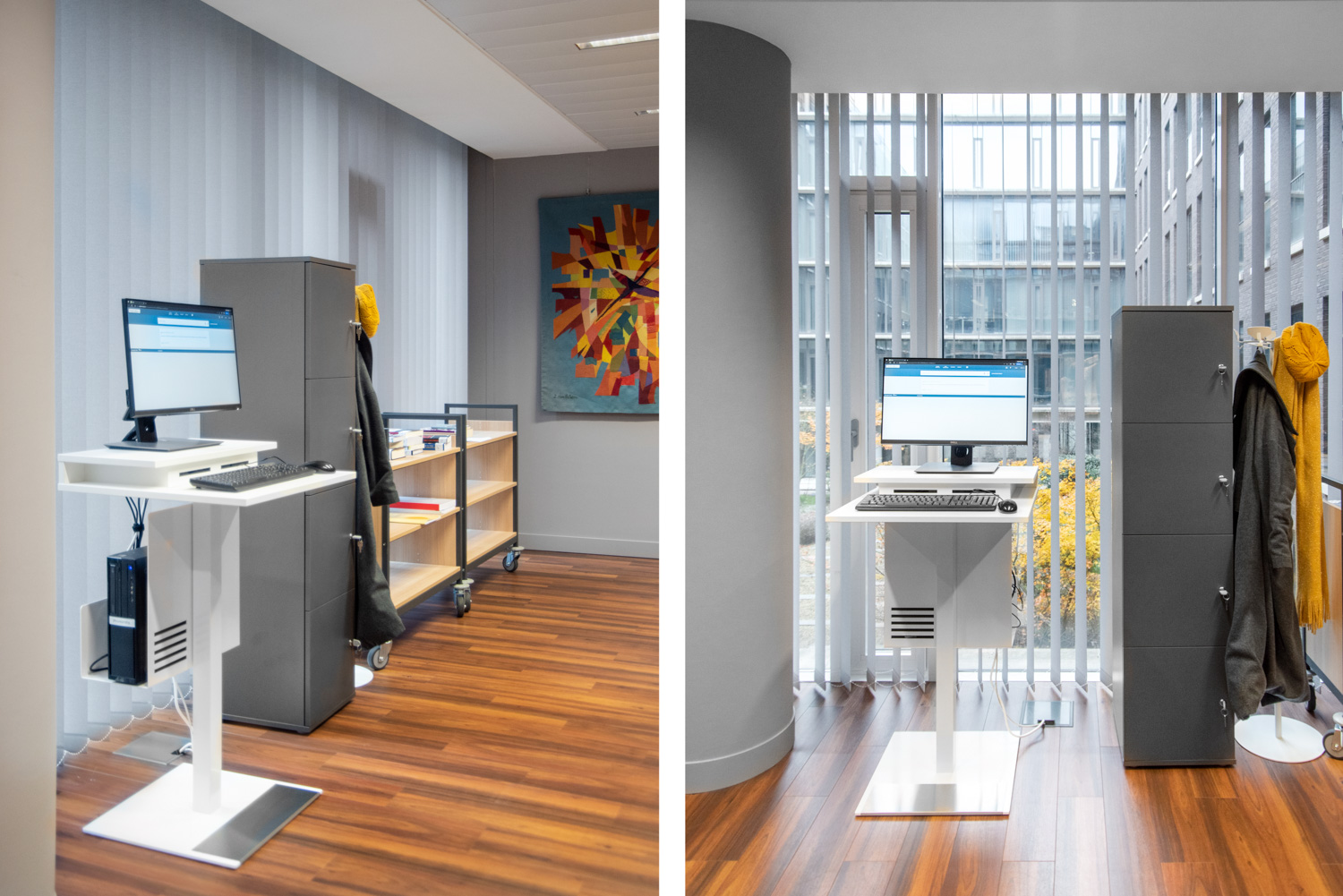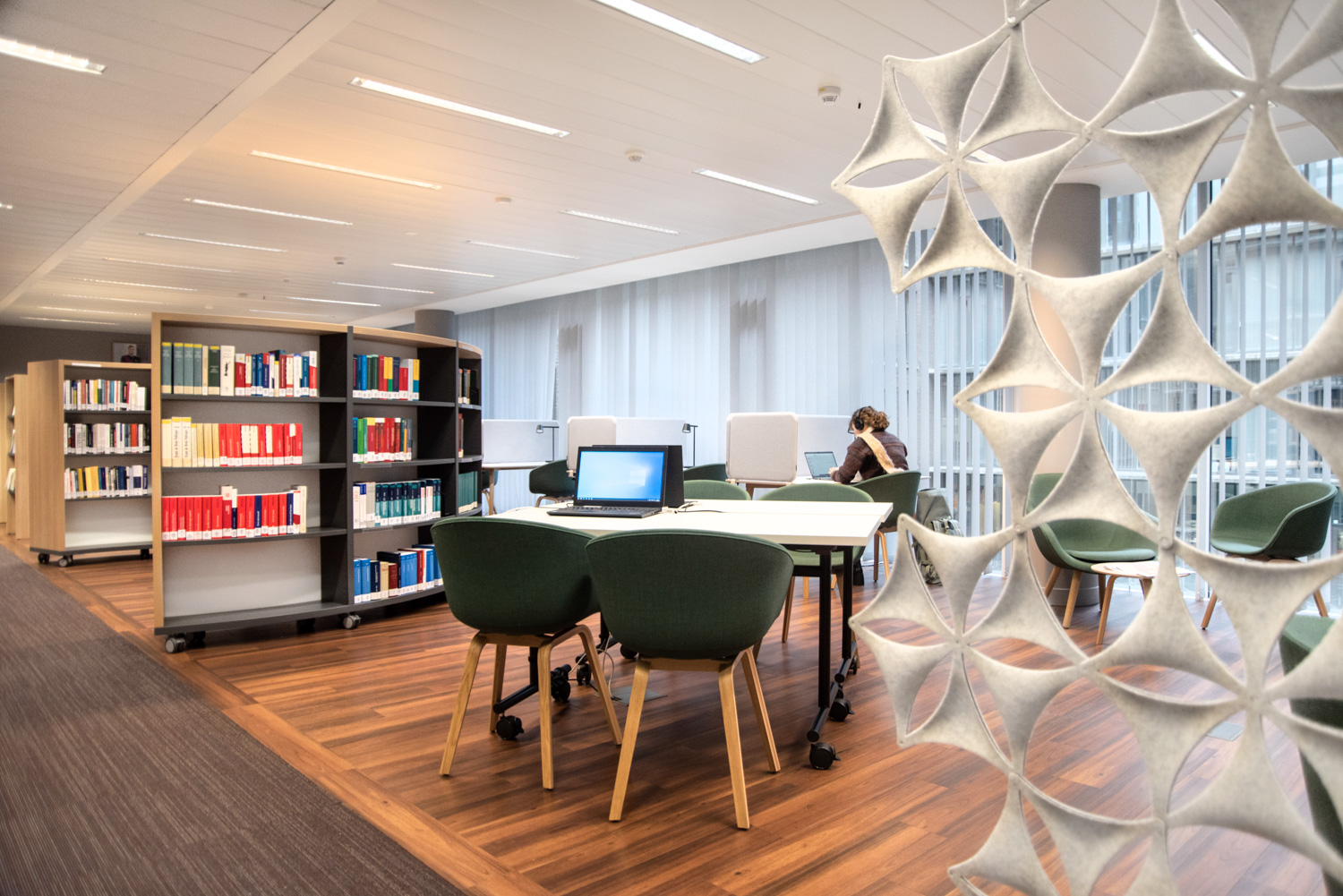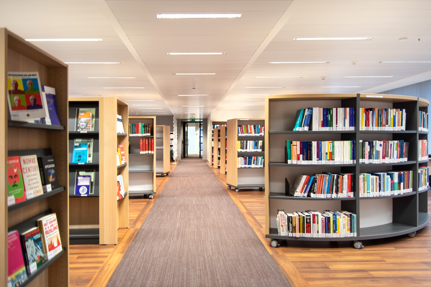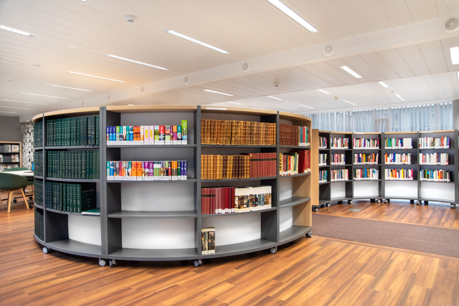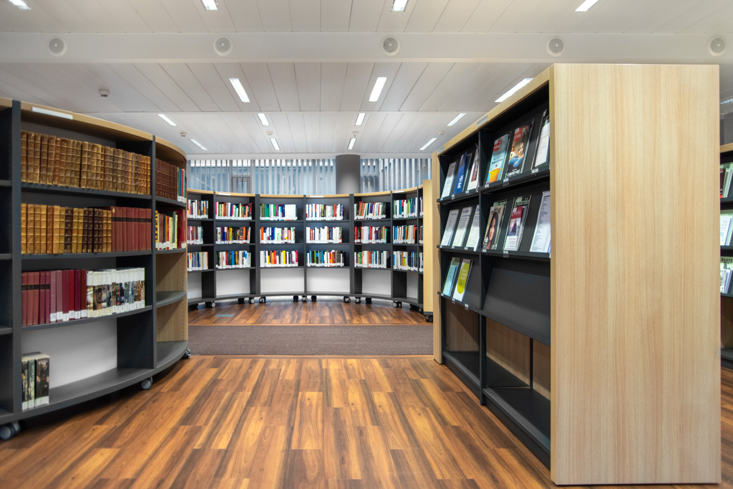 Die runden Regalsysteme verleihen der Inneneinrichtung einen weichen und lässigen Charakter. Verschiedene Arten von Stühlen und Sesseln ermöglichen es dem Leser, seinen Lieblingsplatz zu wählen. Die Farbe des Interieurs ist schön warm. Die Kombination der gewählten Bibliotheksmöbel und Farben macht den Lesesaal zu einem komfortablen Ruhepunkt inmitten der geschäftigen, umliegenden Umgebung.