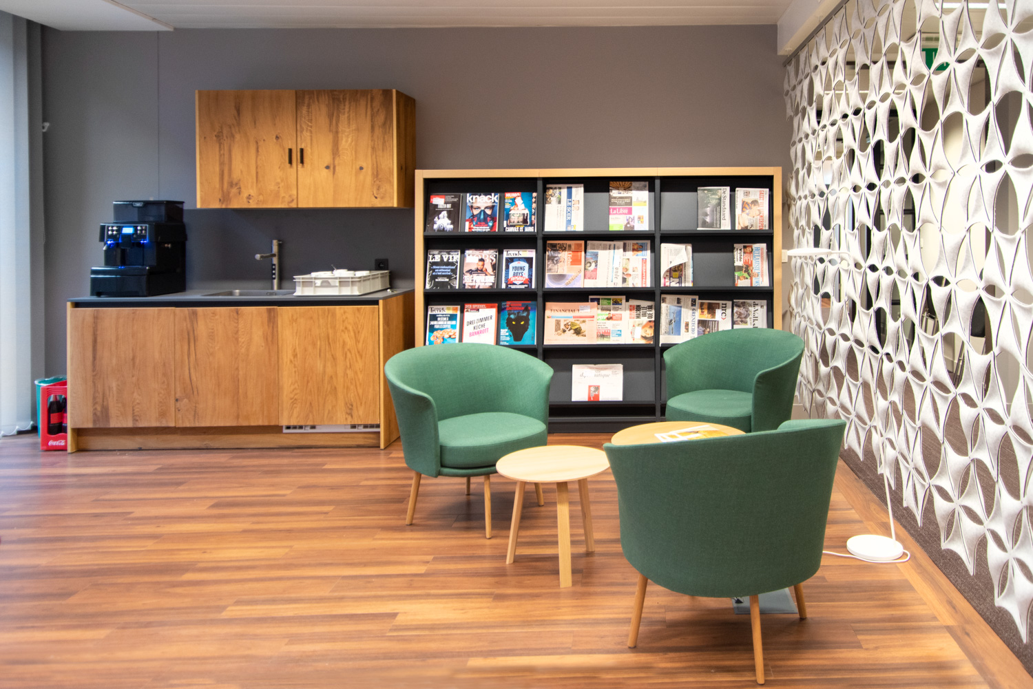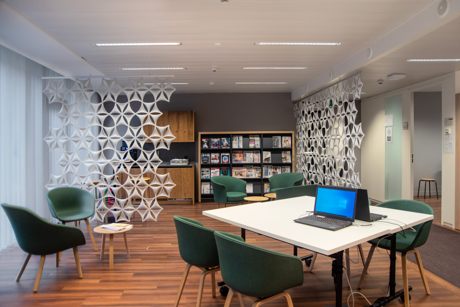 Der neue Lesesaal wurde entworfen, um mehr Besucher anzuziehen und die Möglichkeit zu bieten, in der Bibliothek zu arbeiten oder eine Zeitung bei einer Tasse Kaffee zu genießen.