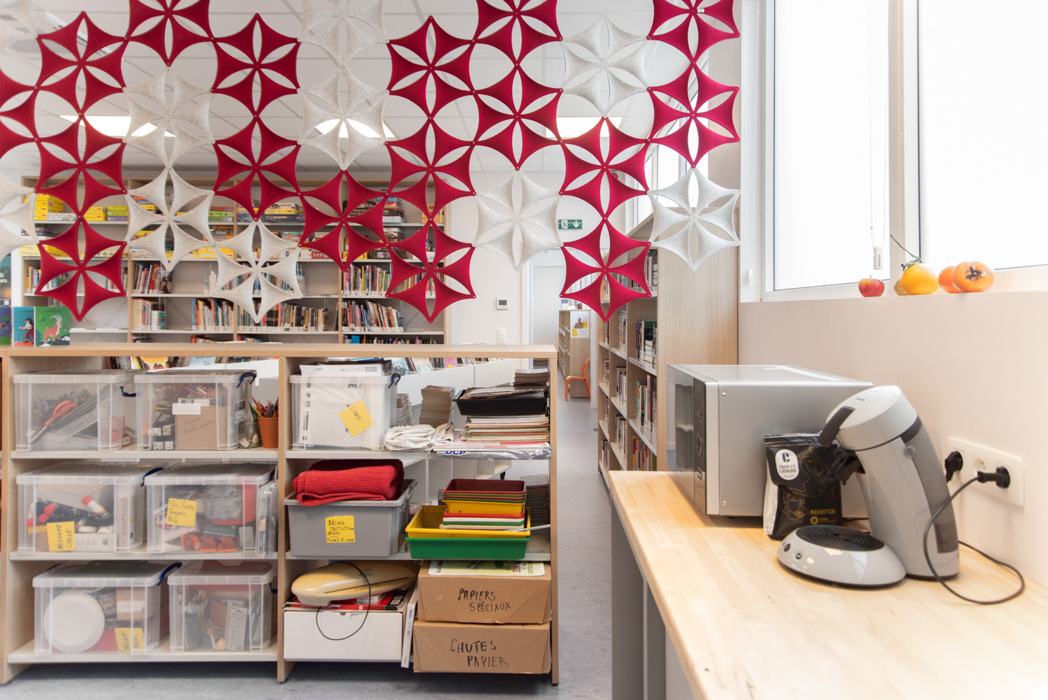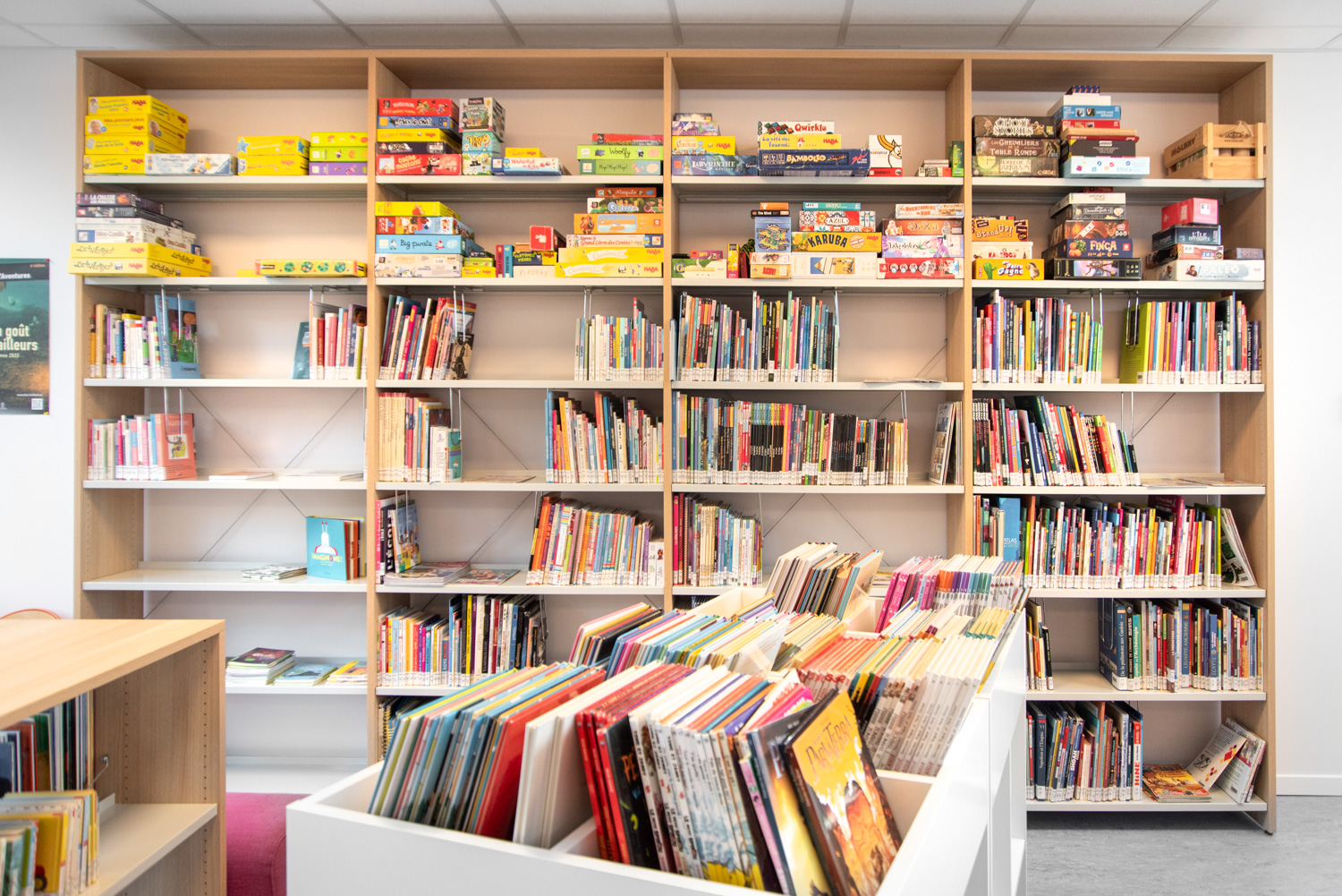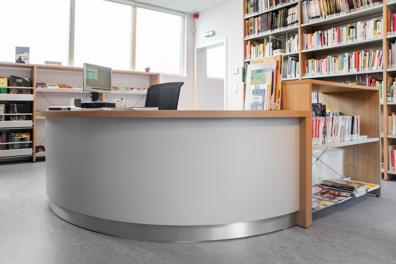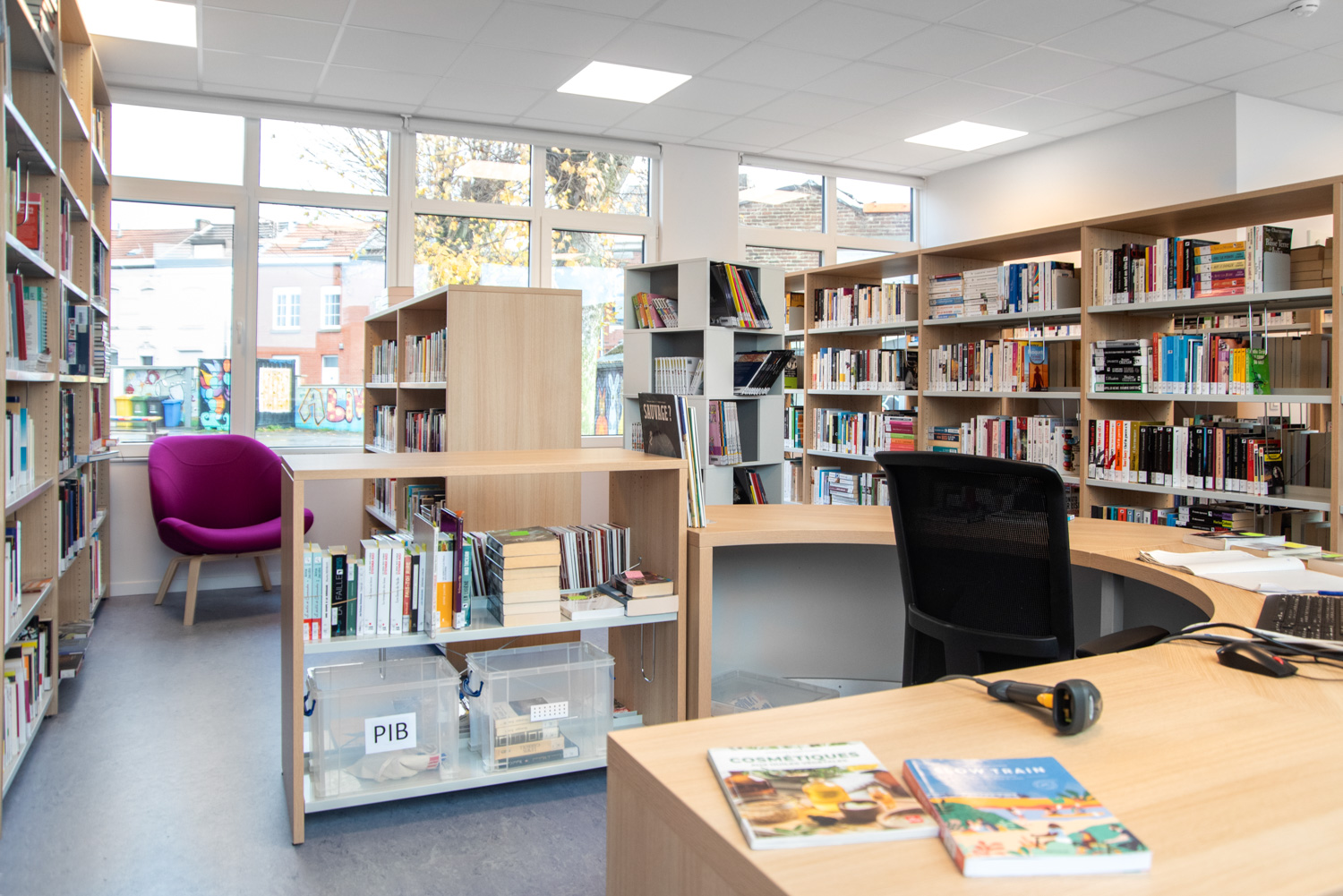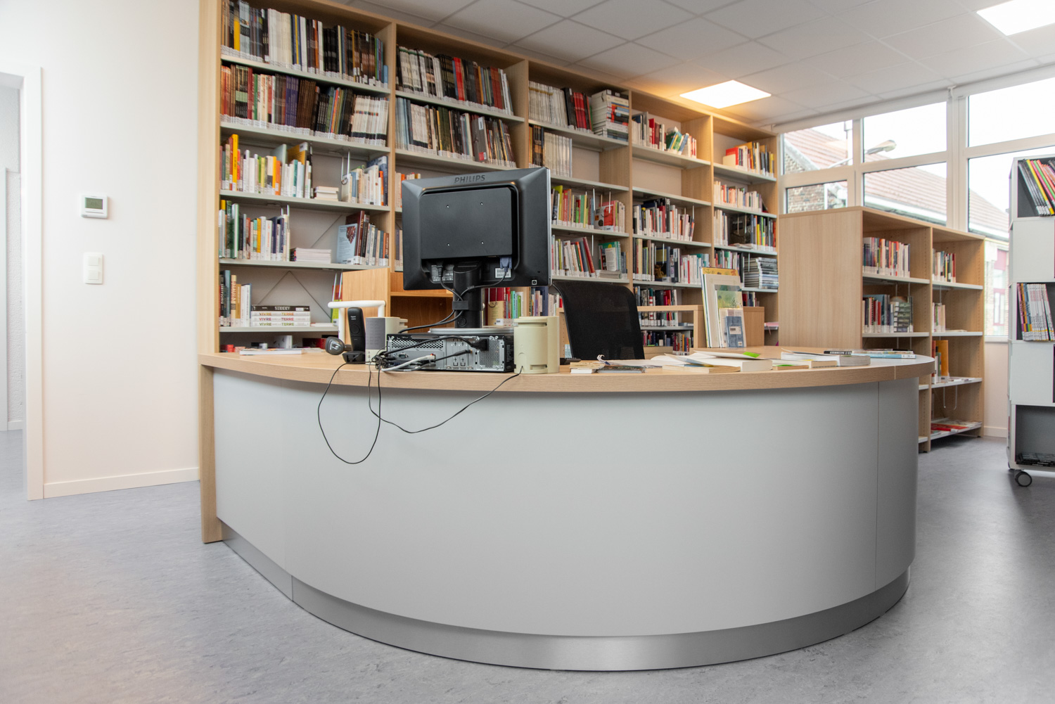 Eine Gelegenheit zur Neugestaltung der Bibliothek, um sie angenehmer und funktioneller zu machen, ergab sich, als Asbest aus dem Gebäude entfernt werden musste. Es gibt nun weniger Regale als zuvor, was eine bessere Zirkulation im Raum ermöglicht. Die Bibliothek ist in zwei verschiedene Bereiche unterteilt, die durch eine Eingangszone getrennt sind: eine Seite für Jugendliche und eine Seite für Erwachsene. Die Räume sind durch die gleiche Verwendung von Farben und Materialien optisch miteinander verbunden.
