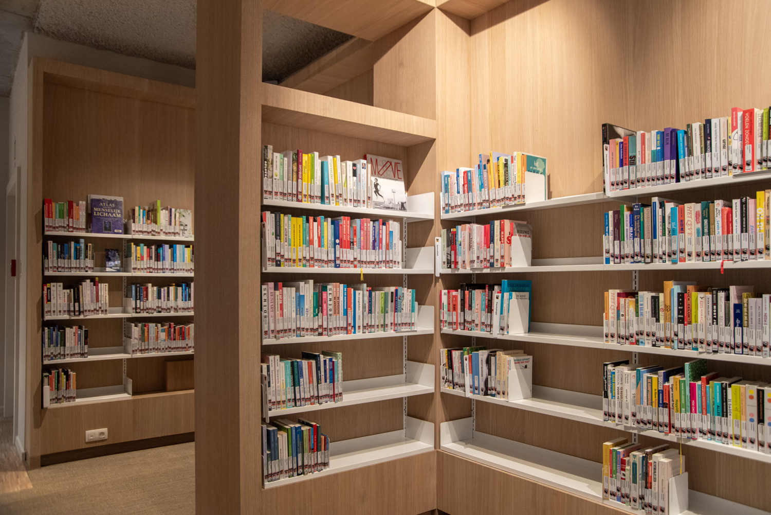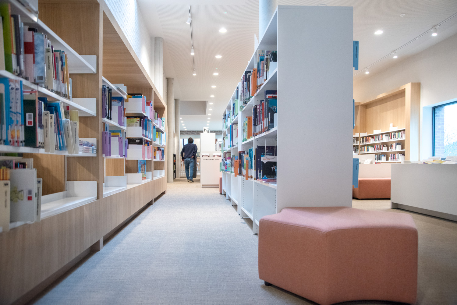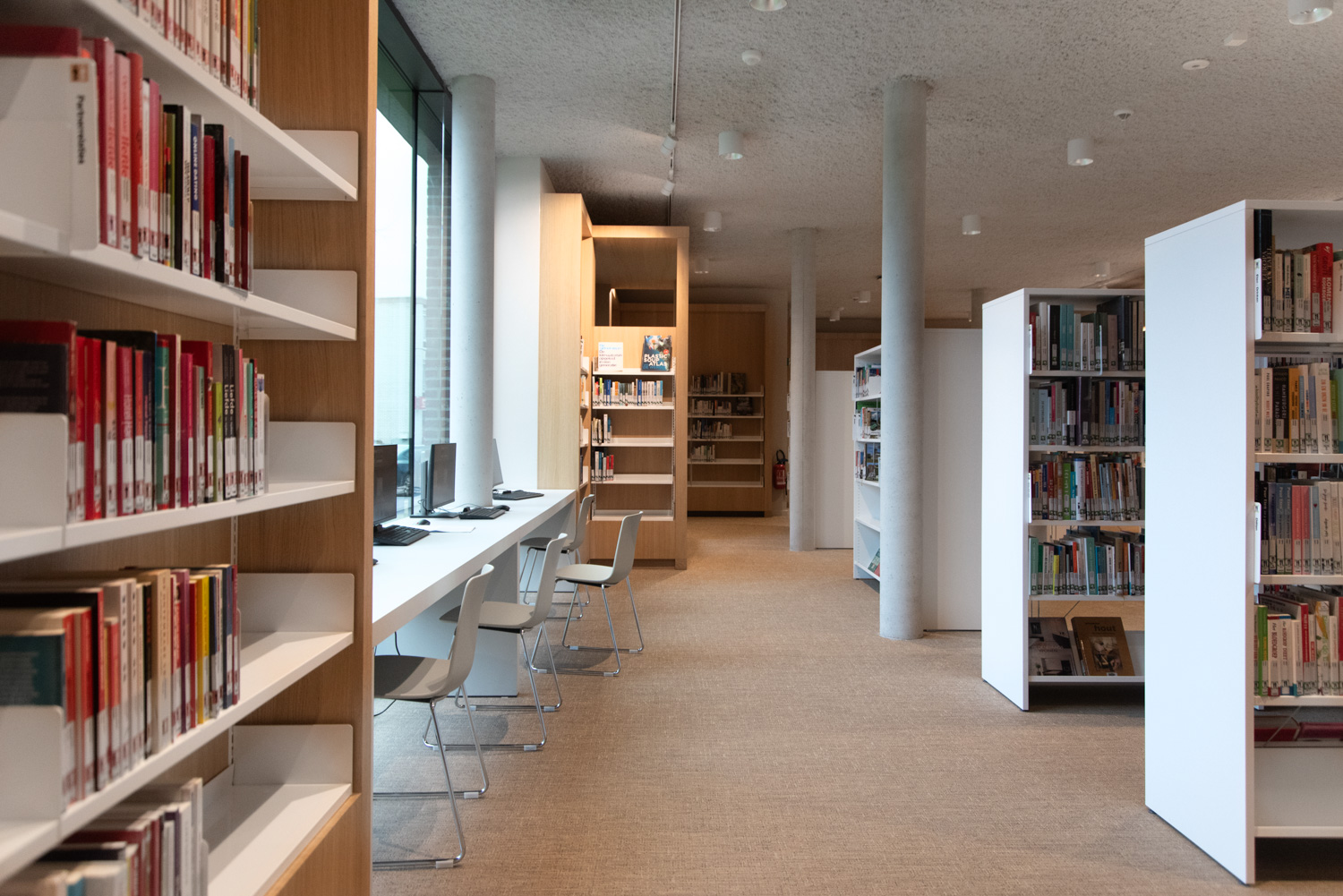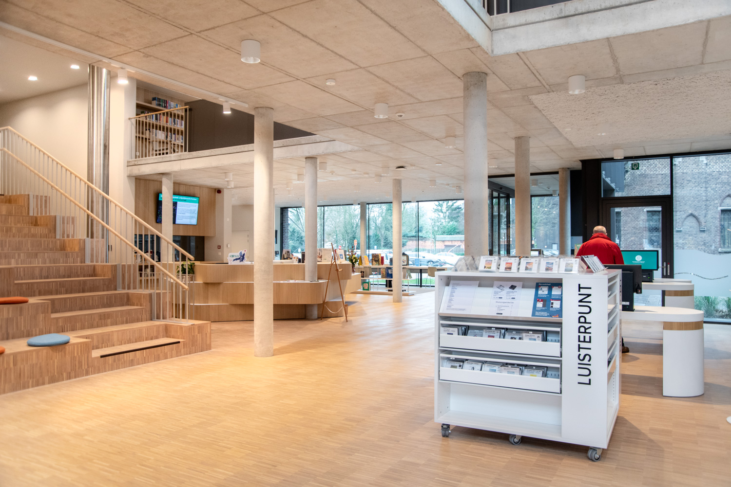 Betreten Sie die Bibliothek, die sich im vielseitigen und modernen Stroming-Zentrum befindet. Sofort fällt Ihnen die großzügige und helle Atmosphäre auf, die den Innenraum prägt. Die Verwendung von Holzparkett und sichtbarem Beton schafft eine moderne und einladende Ästhetik. Maßgefertigte Möbel und Lingo-Regale in strahlendem Weiß bilden einen neutralen Hintergrund, der die Büchersammlung hervorhebt.