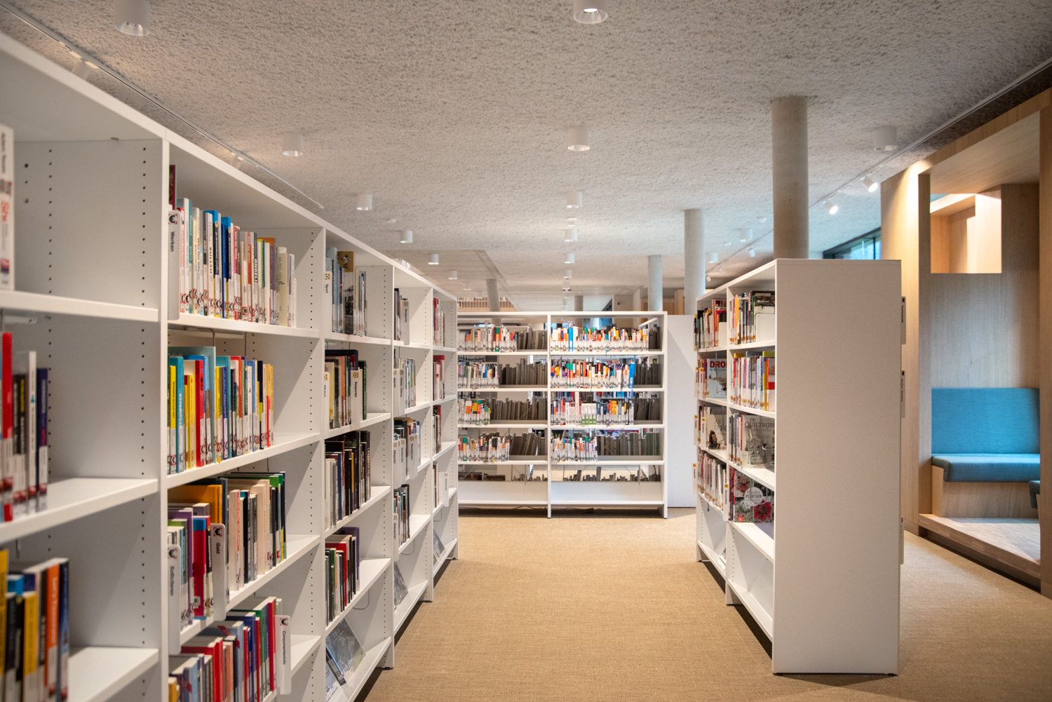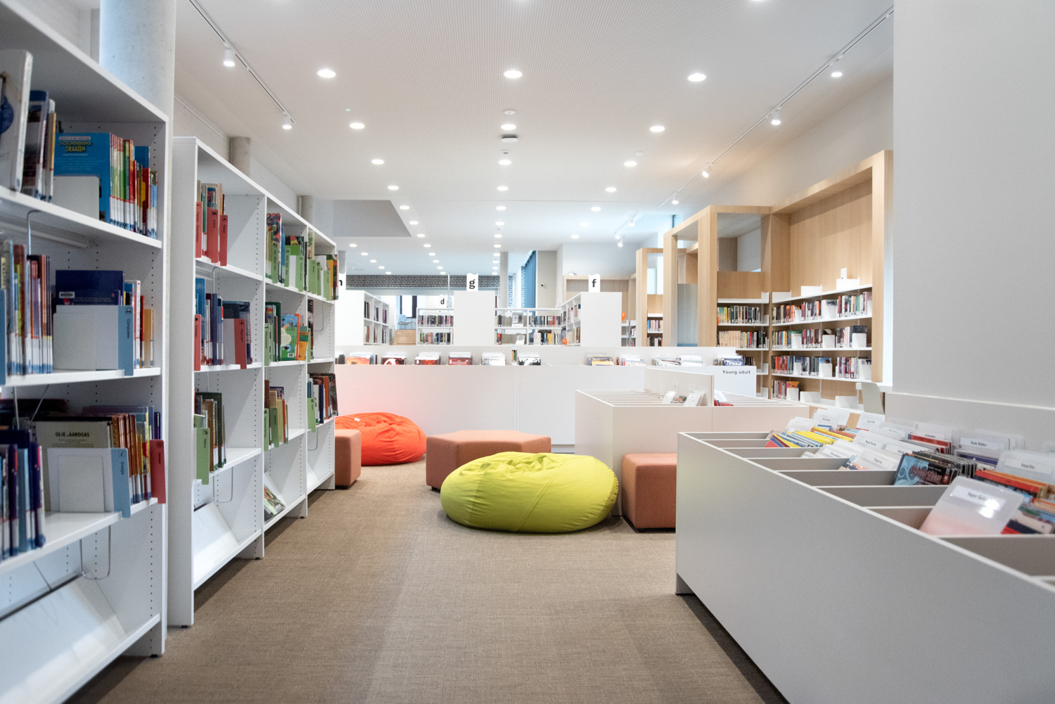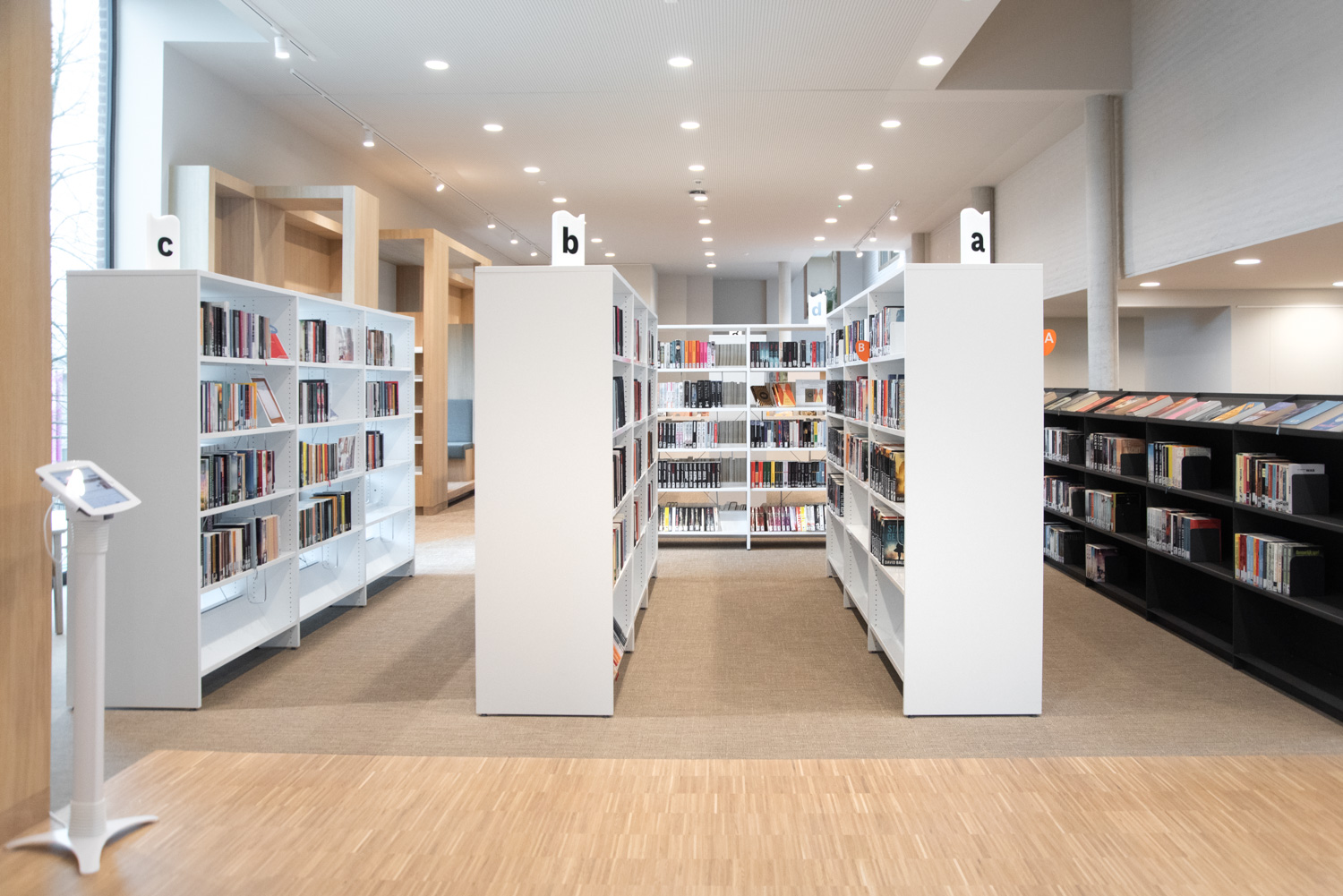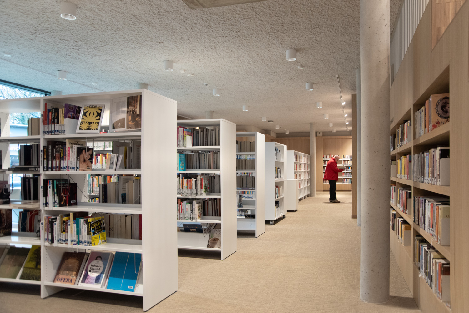 Betreten Sie die Bibliothek, die sich im vielseitigen und modernen Stroming-Zentrum befindet. Sofort fällt Ihnen die großzügige und helle Atmosphäre auf, die den Innenraum prägt. Die Verwendung von Holzparkett und sichtbarem Beton schafft eine moderne und einladende Ästhetik. Maßgefertigte Möbel und Lingo-Regale in strahlendem Weiß bilden einen neutralen Hintergrund, der die Büchersammlung hervorhebt.