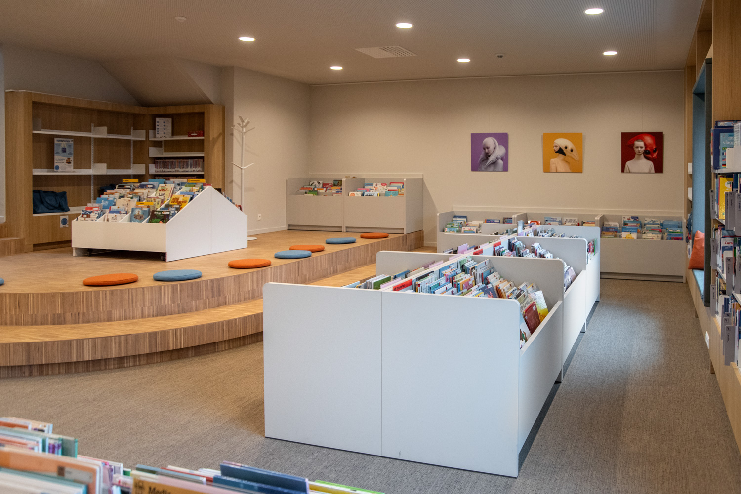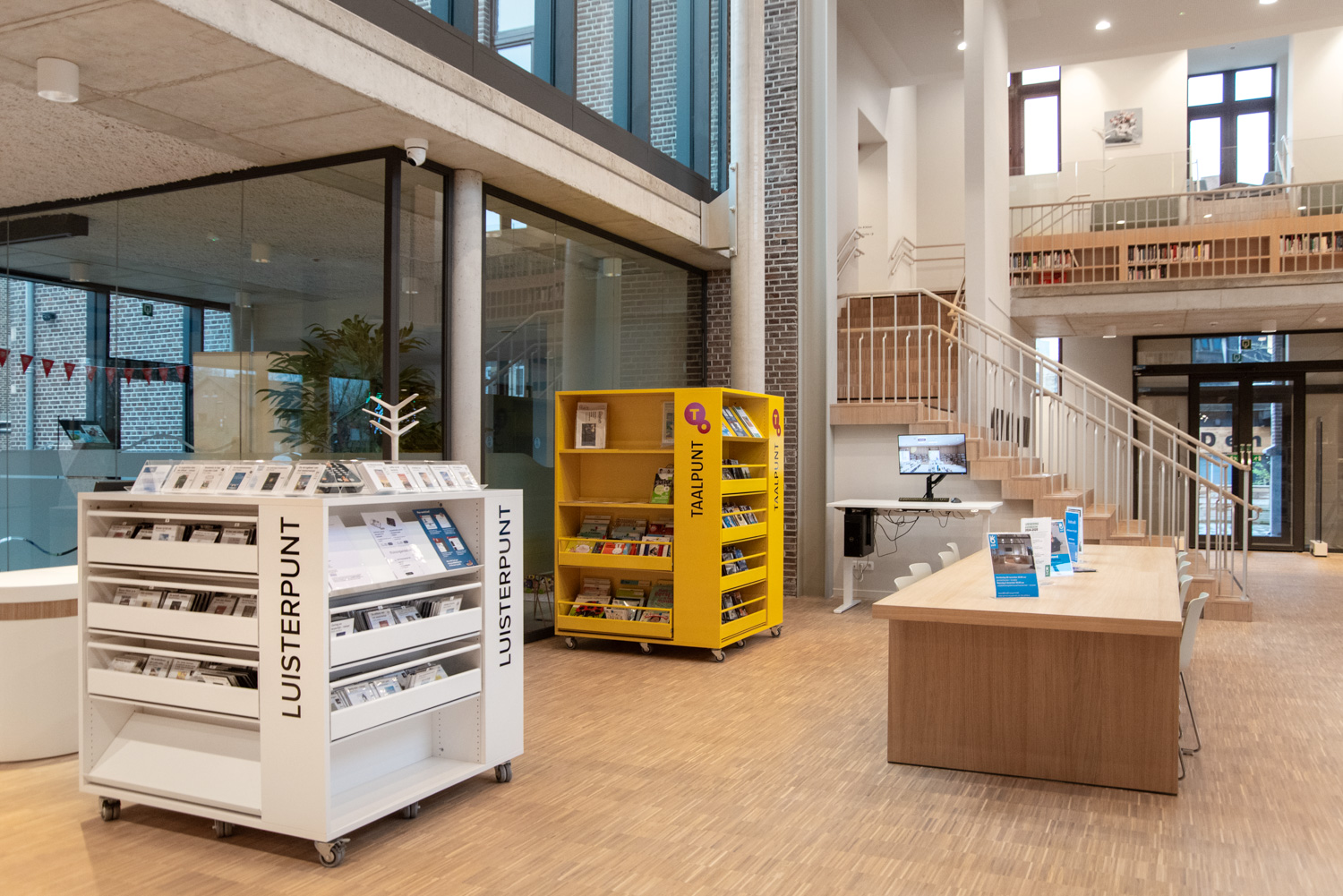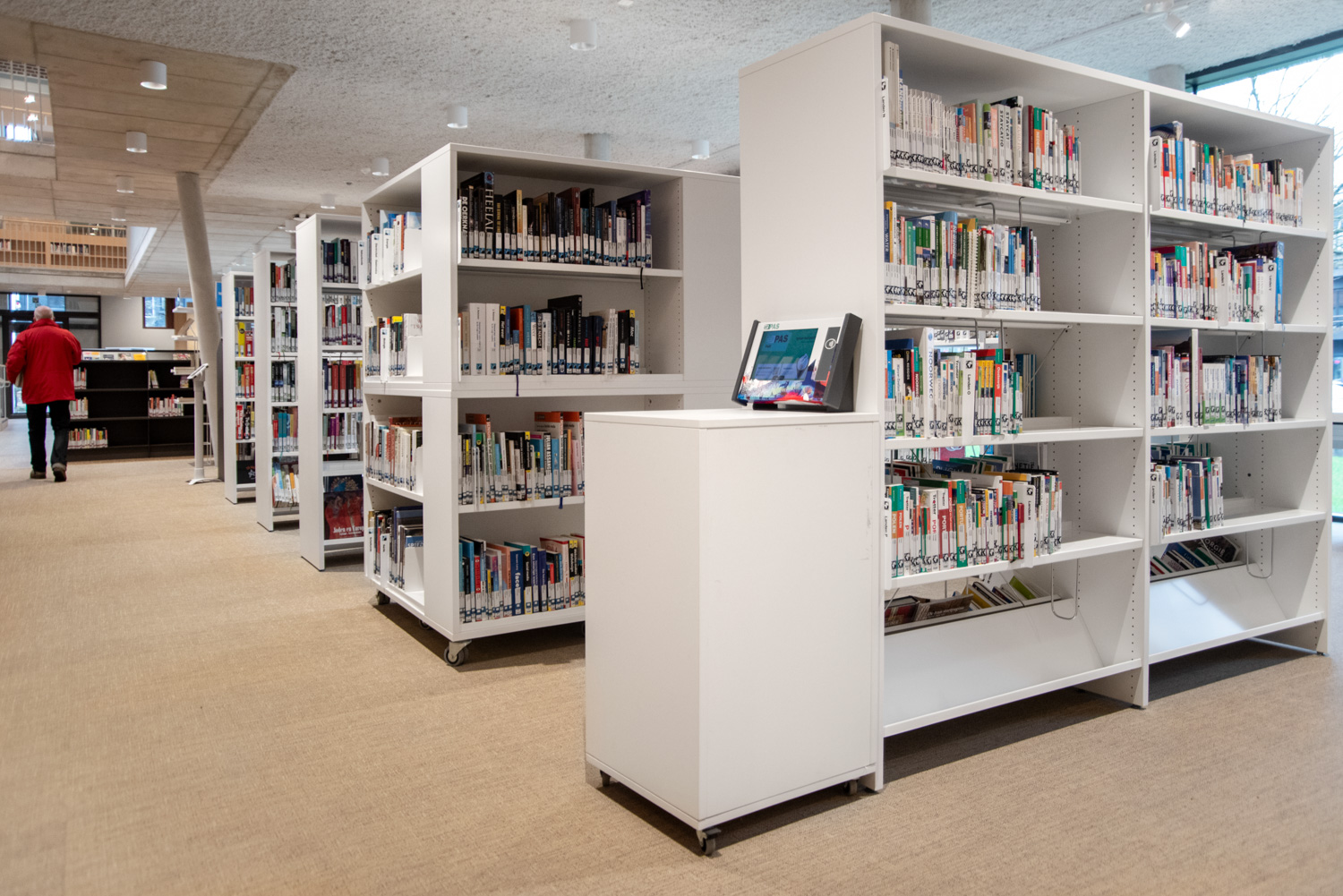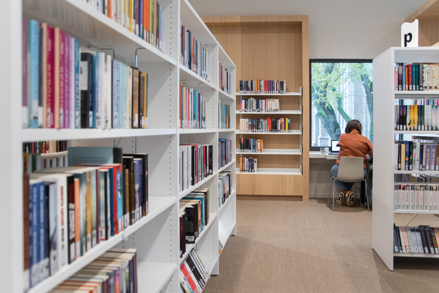 Betreten Sie die Bibliothek, die sich im vielseitigen und modernen Stroming-Zentrum befindet. Sofort fällt Ihnen die großzügige und helle Atmosphäre auf, die den Innenraum prägt. Die Verwendung von Holzparkett und sichtbarem Beton schafft eine moderne und einladende Ästhetik. Maßgefertigte Möbel und Lingo-Regale in strahlendem Weiß bilden einen neutralen Hintergrund, der die Büchersammlung hervorhebt.