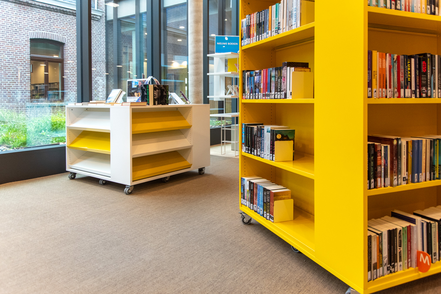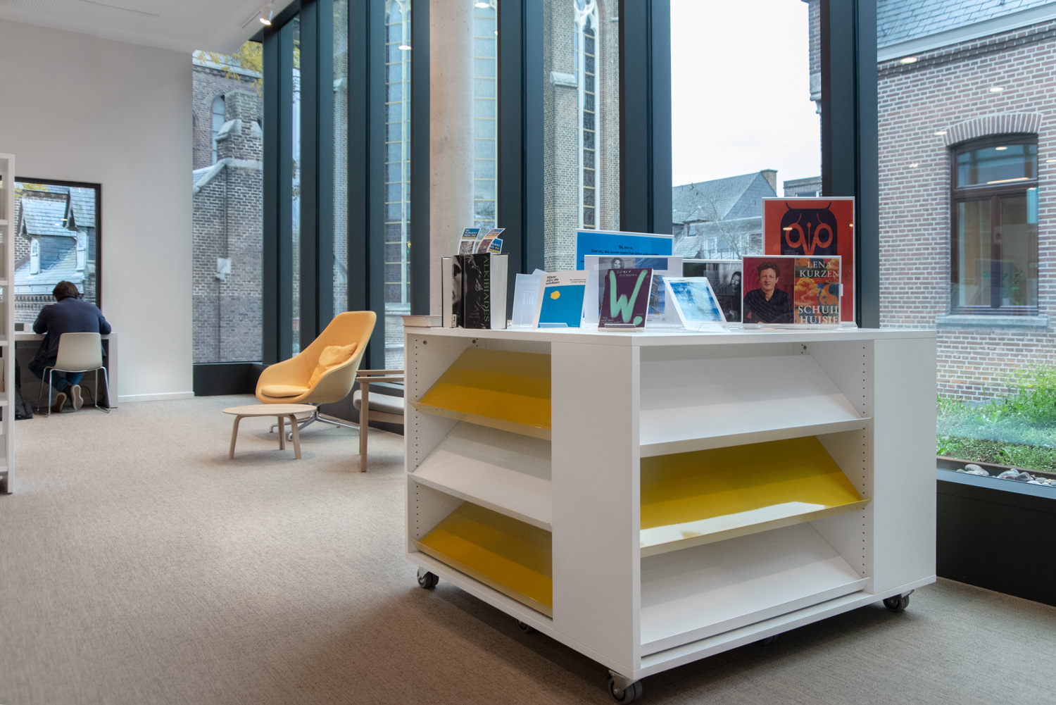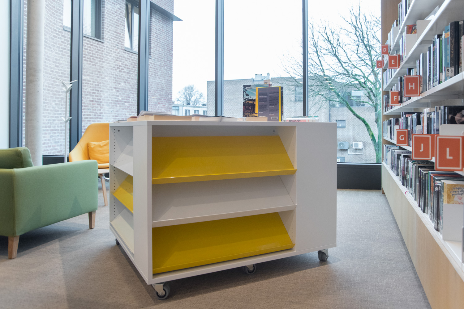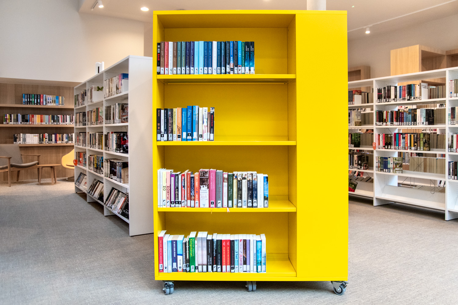 Die Sitzgelegenheiten neben den lebhaften, auffällig gelben Lingo Square-Türmen verleihen dem eleganten Design der Bibliothek eine verspielte und dynamische Note. Das gesamte Ambiente strahlt moderne Wärme aus und lädt Besucher zum Entdecken und Entspannen ein.