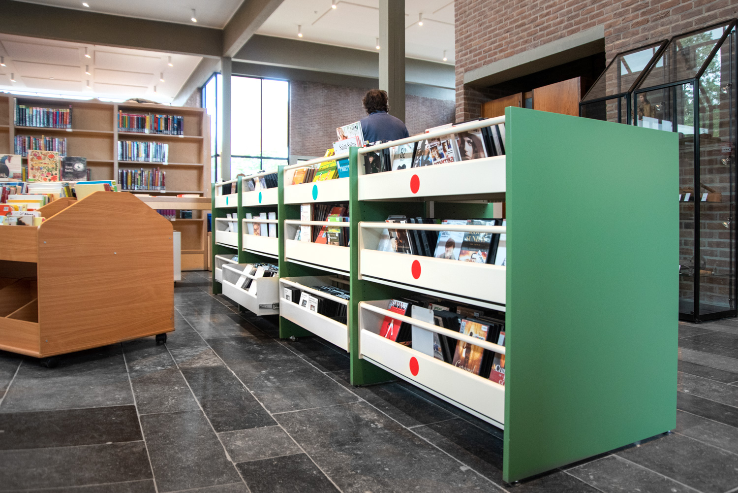 Beim Betreten der Bibliothek trifft der Besucher zunächst auf einen gemütlichen Lesesaal. Im Rest der Bibliothek finden Sie eine Mischung aus Bibliotheksregalsystemen und maßgeschneiderten Möbeln in einer vernünftigen Auswahl an Materialien, die gut zum ursprünglichen Interieur passen.