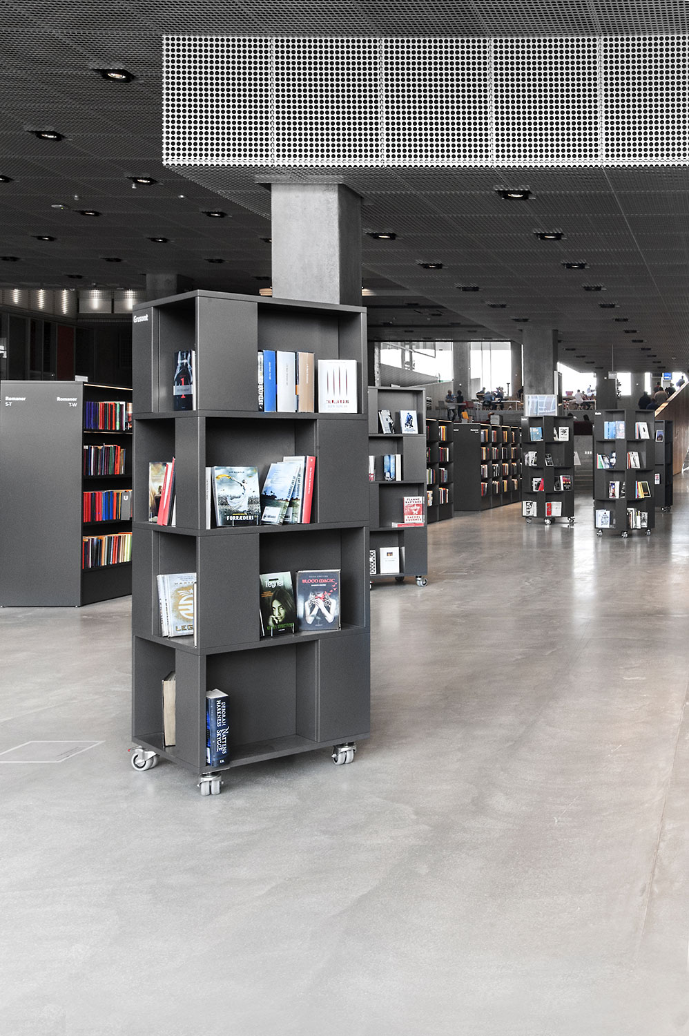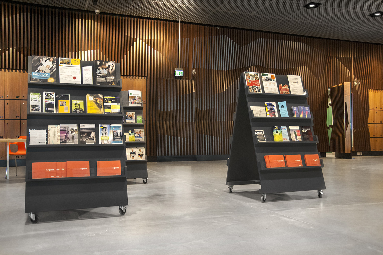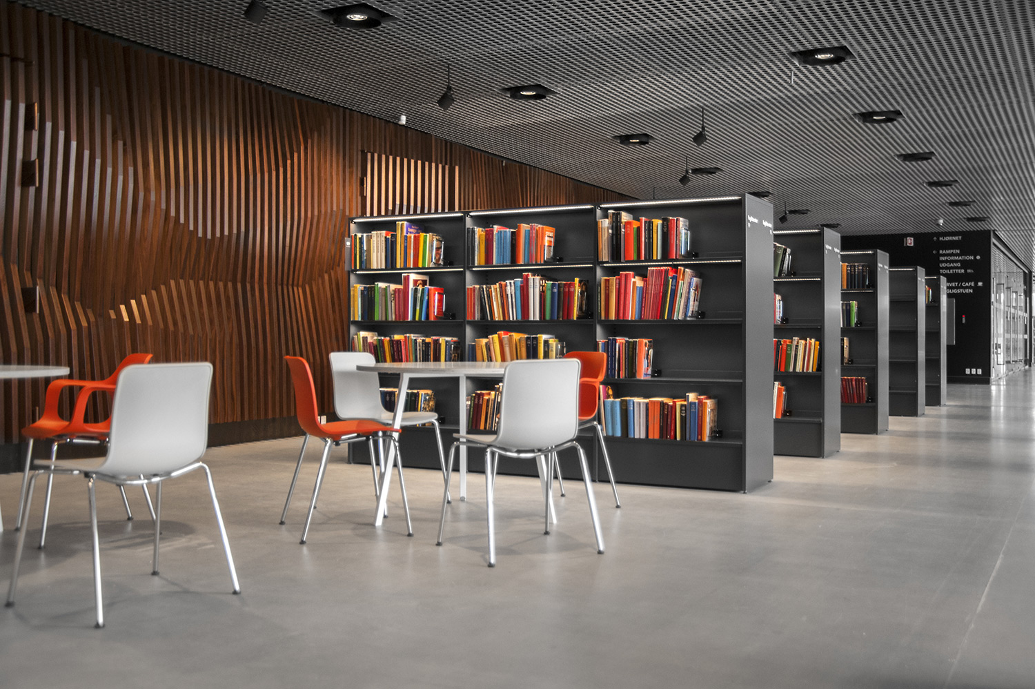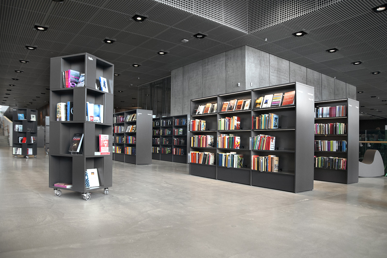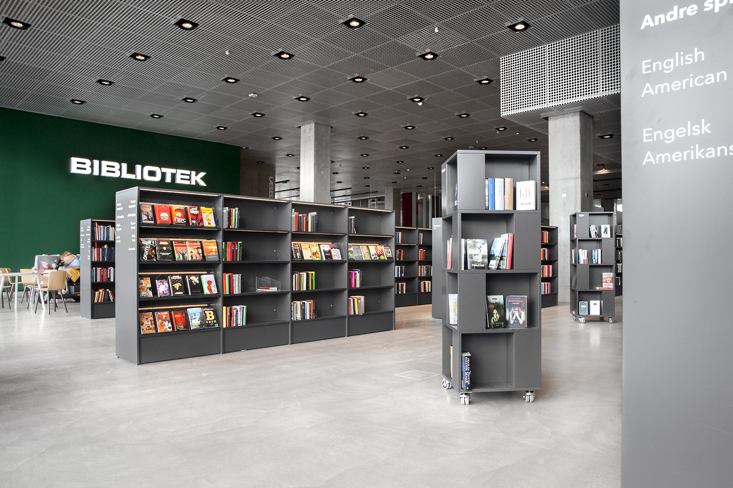 Unsere Schwestergesellschaft Lammhults Biblioteksdesign A/S hat den Großteil des Mobiliars für die Bibliothek im Dokk1 geliefert, sowohl Standard- als auch Sonderlösungen. Die Architektur des Gebäudes ist innen und außen als Kreuzfahrtschiff gestaltet. Dieses Design findet sich in der Innenarchitektur, Ausstattung und Möblierung wieder. Da es die Anforderung gab, so wenig Möbeltypen wie möglich in der Bibliothek einzusetzen, fand eine Fusion unserer bekannten Systeme Ordrup und Frontline Square statt – und Ordrup Square war geboren.