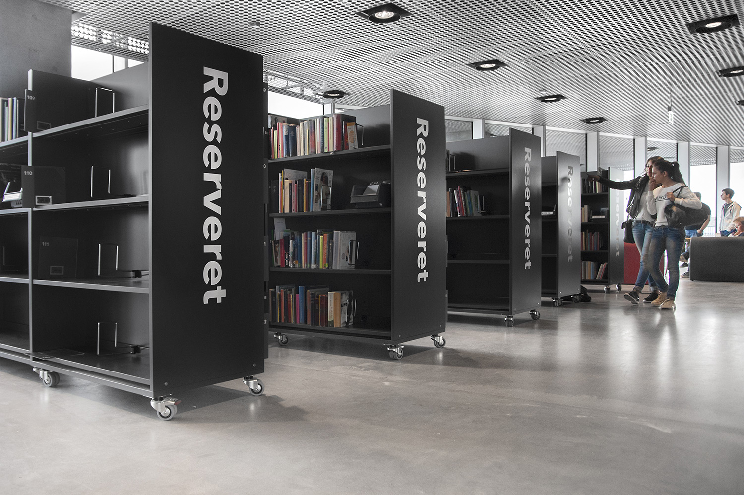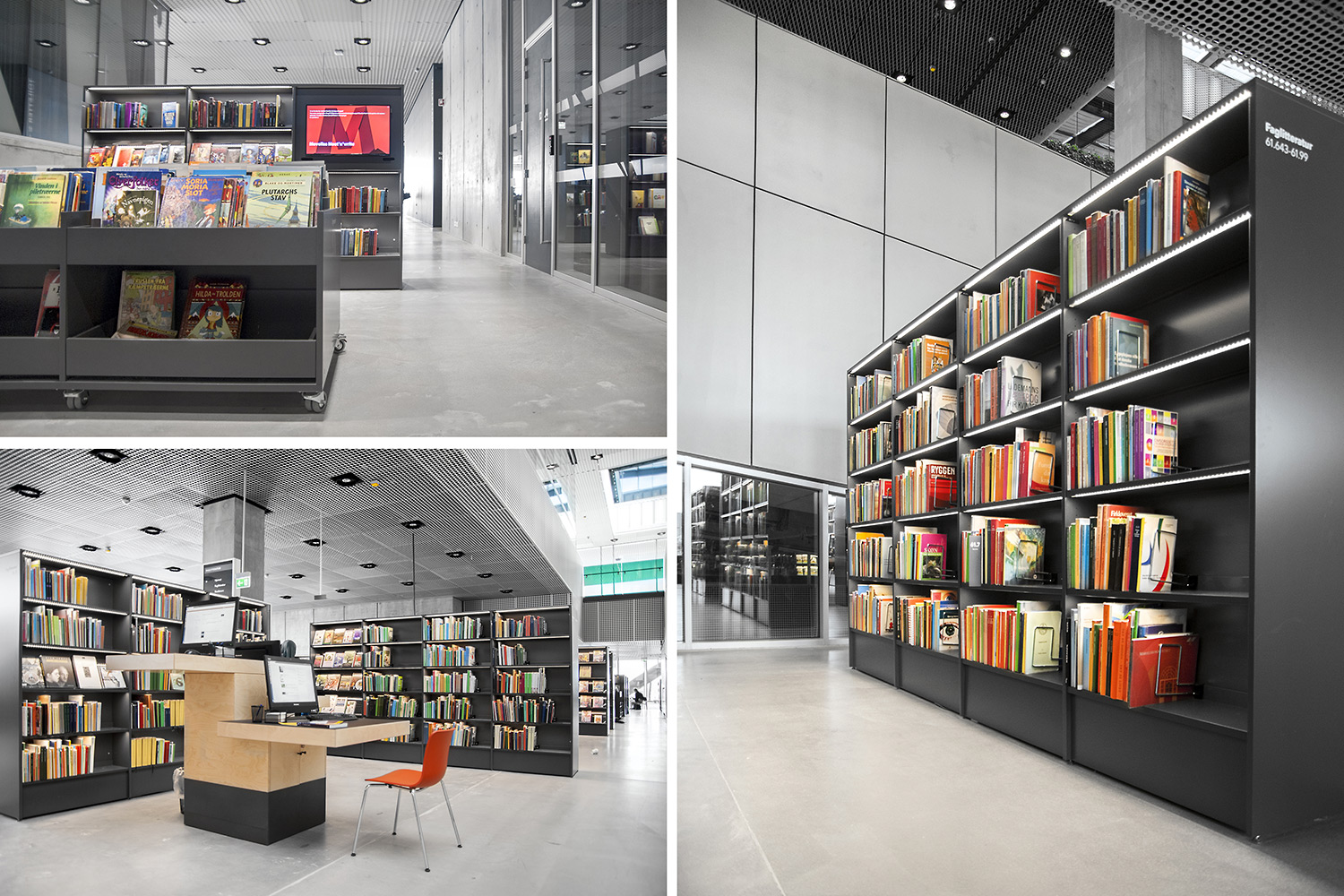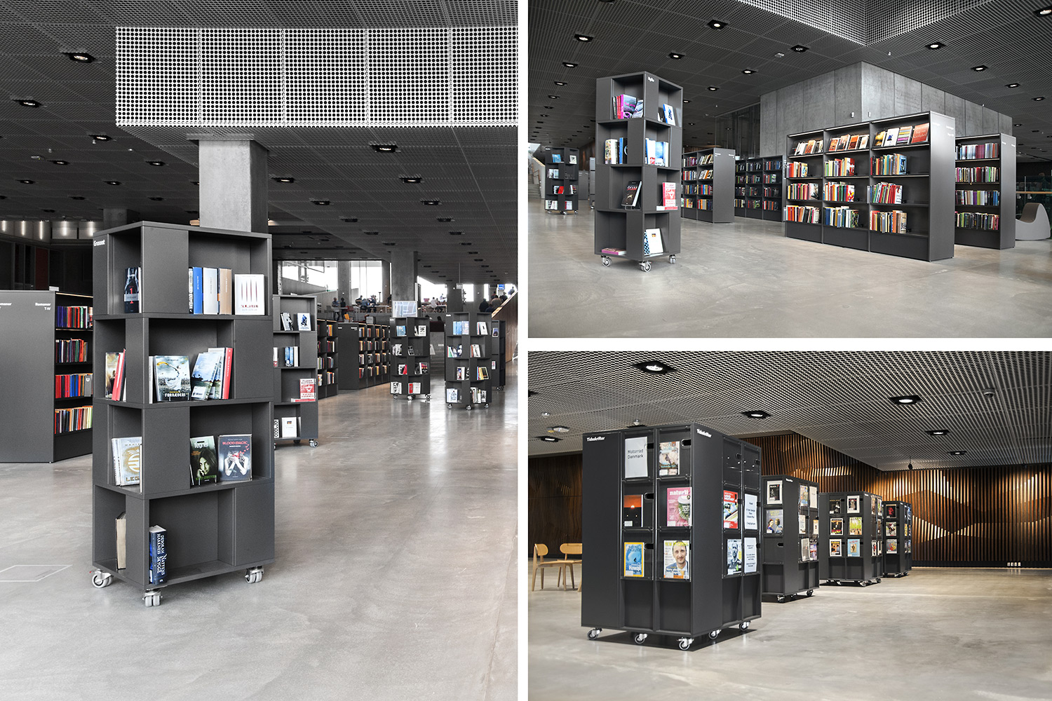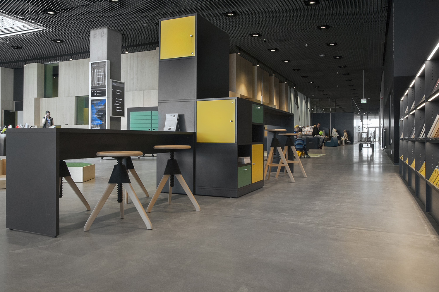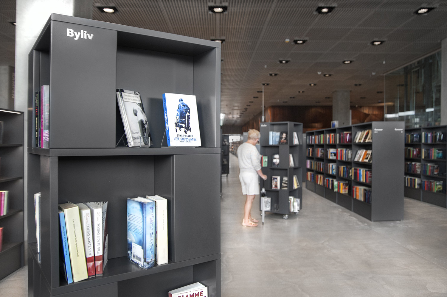 Unsere Schwestergesellschaft Lammhults Biblioteksdesign A/S hat den Großteil des Mobiliars für die Bibliothek im Dokk1 geliefert, sowohl Standard- als auch Sonderlösungen. Die Architektur des Gebäudes ist innen und außen als Kreuzfahrtschiff gestaltet. Dieses Design findet sich in der Innenarchitektur, Ausstattung und Möblierung wieder. Da es die Anforderung gab, so wenig Möbeltypen wie möglich in der Bibliothek einzusetzen, fand eine Fusion unserer bekannten Systeme Ordrup und Frontline Square statt – und Ordrup Square war geboren.