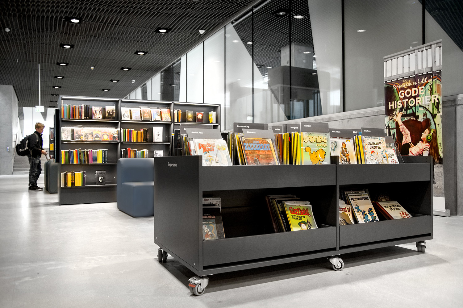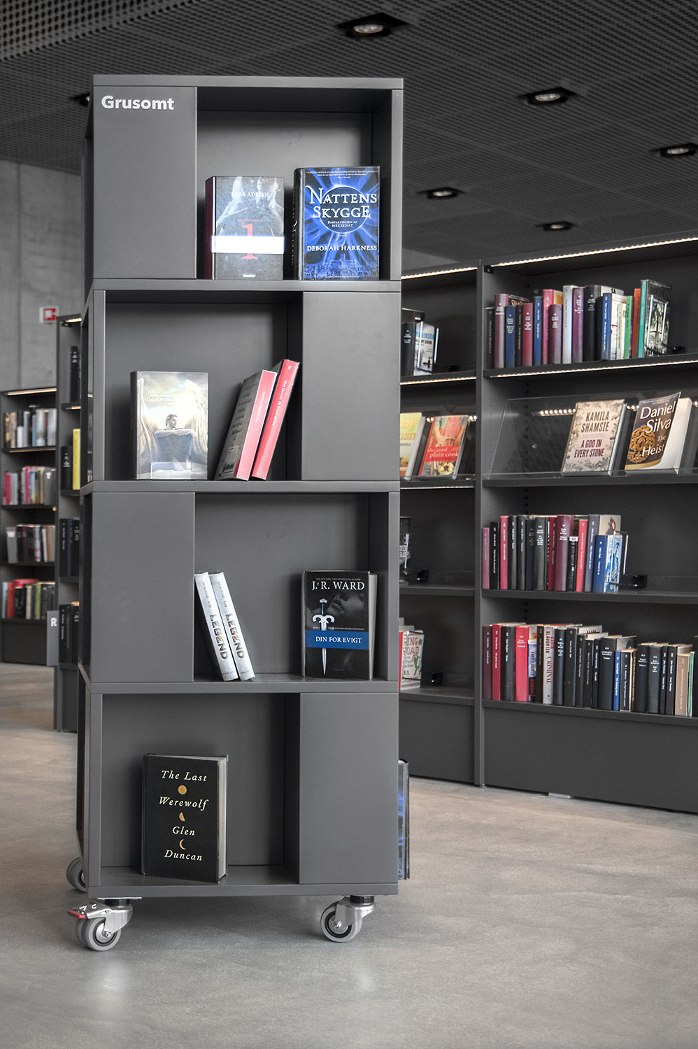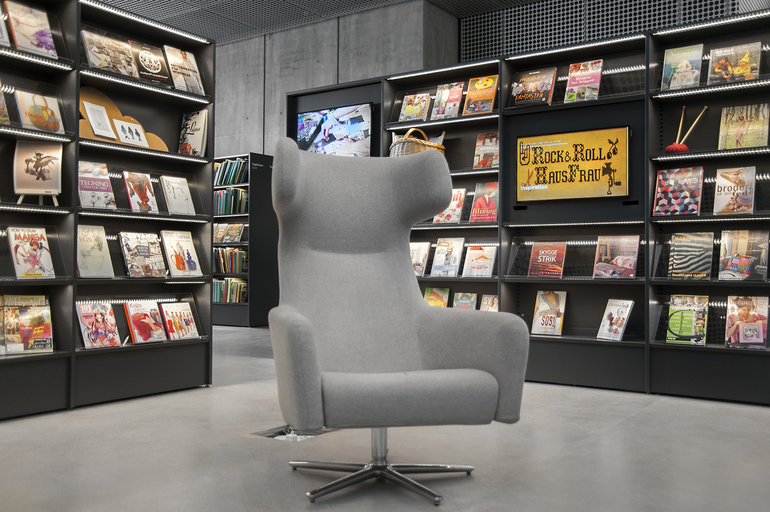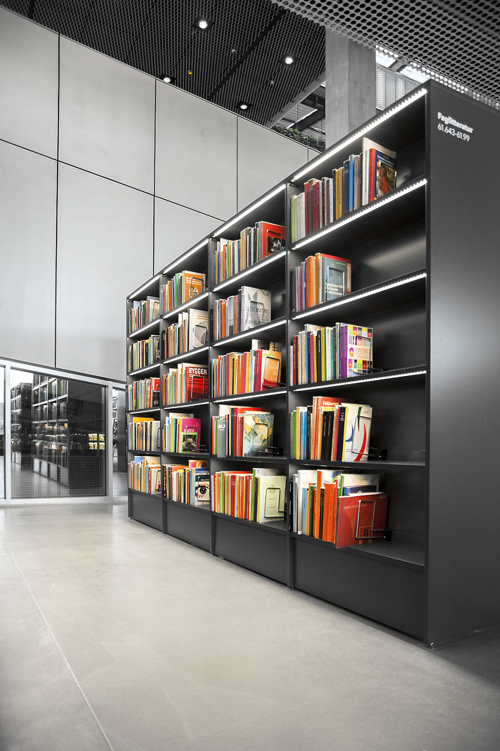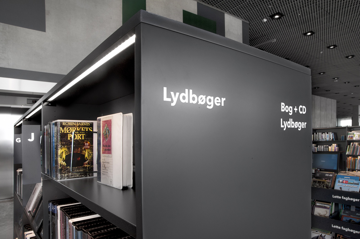 Unsere Schwestergesellschaft Lammhults Biblioteksdesign A/S hat den Großteil des Mobiliars für die Bibliothek im Dokk1 geliefert, sowohl Standard- als auch Sonderlösungen. Die Architektur des Gebäudes ist innen und außen als Kreuzfahrtschiff gestaltet. Dieses Design findet sich in der Innenarchitektur, Ausstattung und Möblierung wieder. Da es die Anforderung gab, so wenig Möbeltypen wie möglich in der Bibliothek einzusetzen, fand eine Fusion unserer bekannten Systeme Ordrup und Frontline Square statt – und Ordrup Square war geboren.