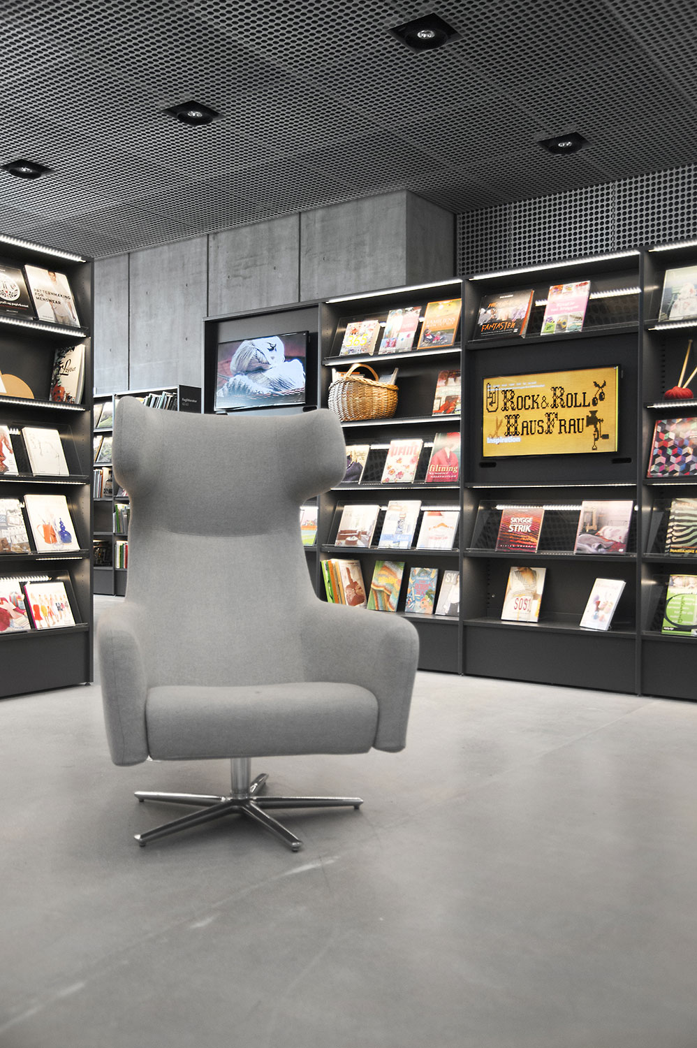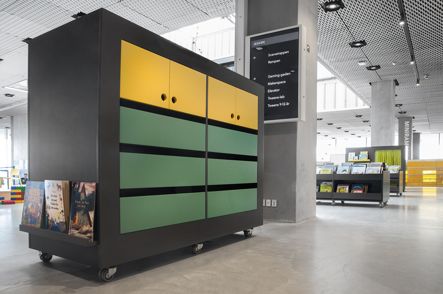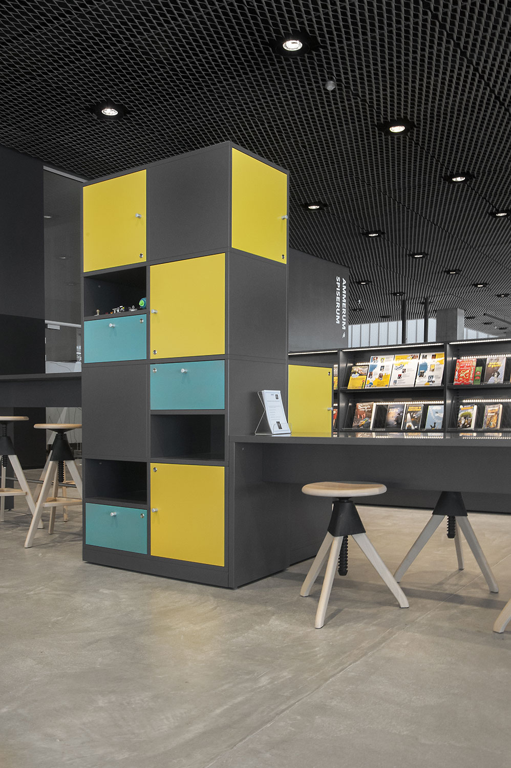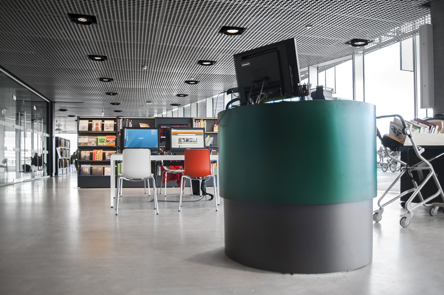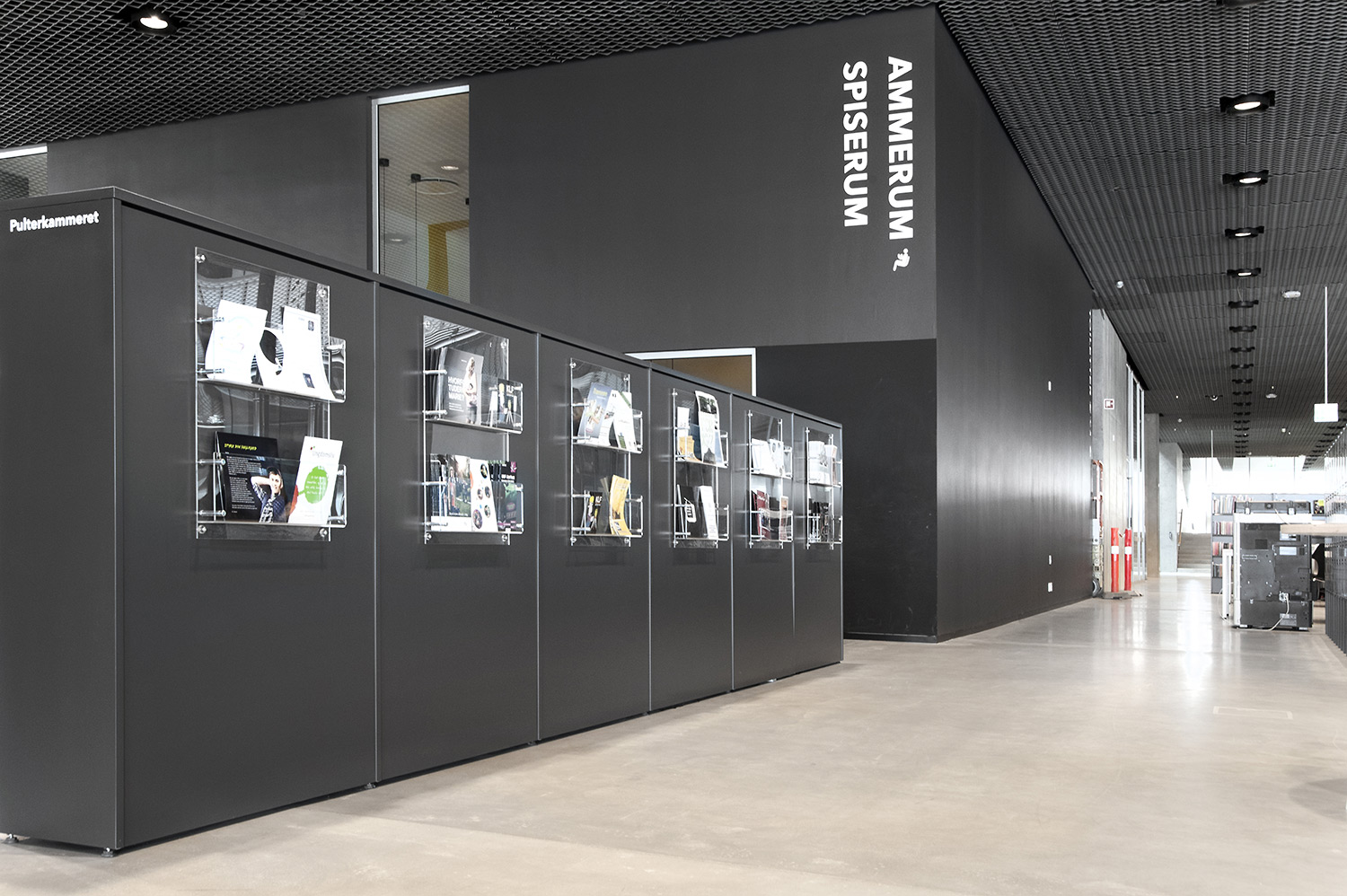 Unsere Schwestergesellschaft Lammhults Biblioteksdesign A/S hat den Großteil des Mobiliars für die Bibliothek im Dokk1 geliefert, sowohl Standard- als auch Sonderlösungen. Die Architektur des Gebäudes ist innen und außen als Kreuzfahrtschiff gestaltet. Dieses Design findet sich in der Innenarchitektur, Ausstattung und Möblierung wieder. Da es die Anforderung gab, so wenig Möbeltypen wie möglich in der Bibliothek einzusetzen, fand eine Fusion unserer bekannten Systeme Ordrup und Frontline Square statt – und Ordrup Square war geboren.