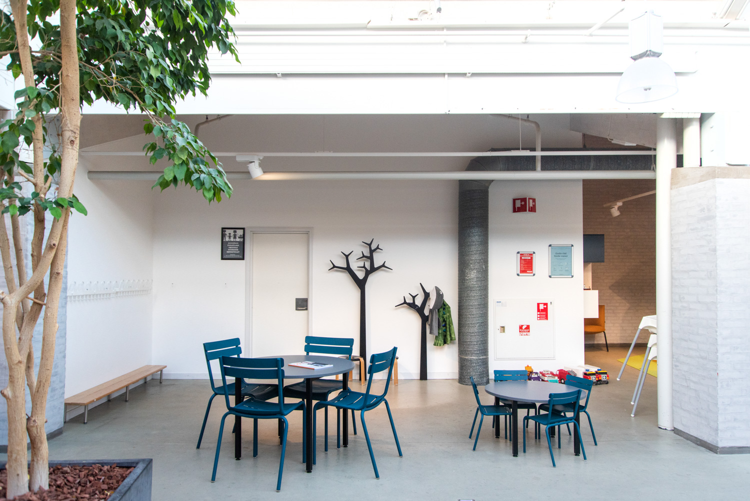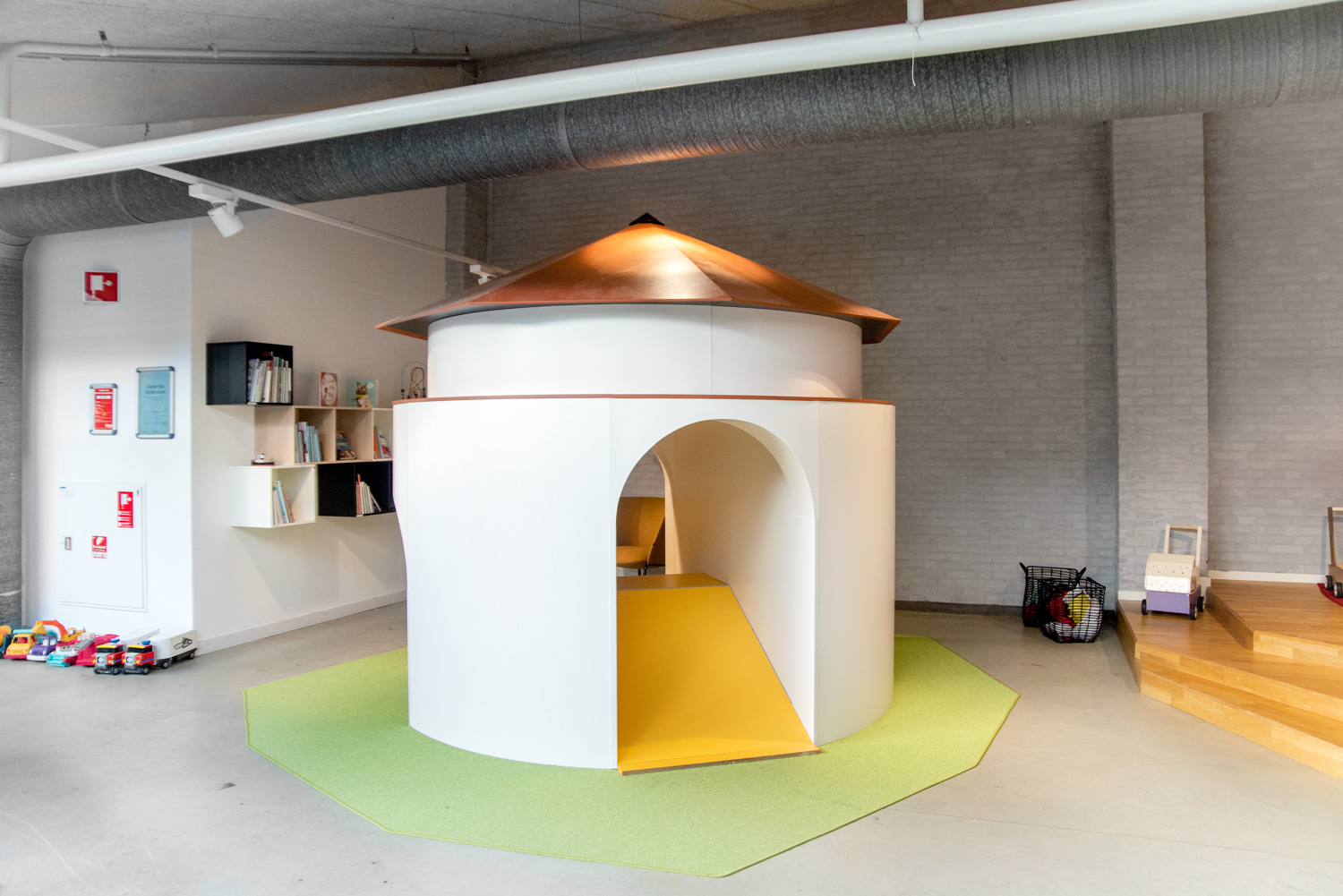 Für die kleineren Kinder lag der Fokus darauf, einen Spielbereich einzuführen, der auch die Eltern willkommen hieß. Es gibt einen Turm namens "Krudttårnet", eine Miniatur des Wahrzeichens der Stadt, auf dem Kinder gerne klettern und rutschen können. Die türkisfarbenen Lesehöhlen wurden mit Bullaugen versehen, die es wie unter Wasser aussehen lassen. Die Eltern oder Großeltern können an verschiedenen Lounge-Sitzgelegenheiten Platz nehmen und die Kinder beim Spielen genießen. Darüber hinaus verfügt die Bibliothek über neue Mittagstische und einen Kleiderschrank.