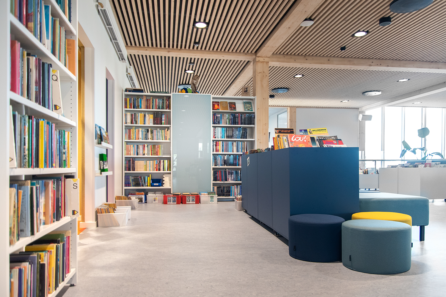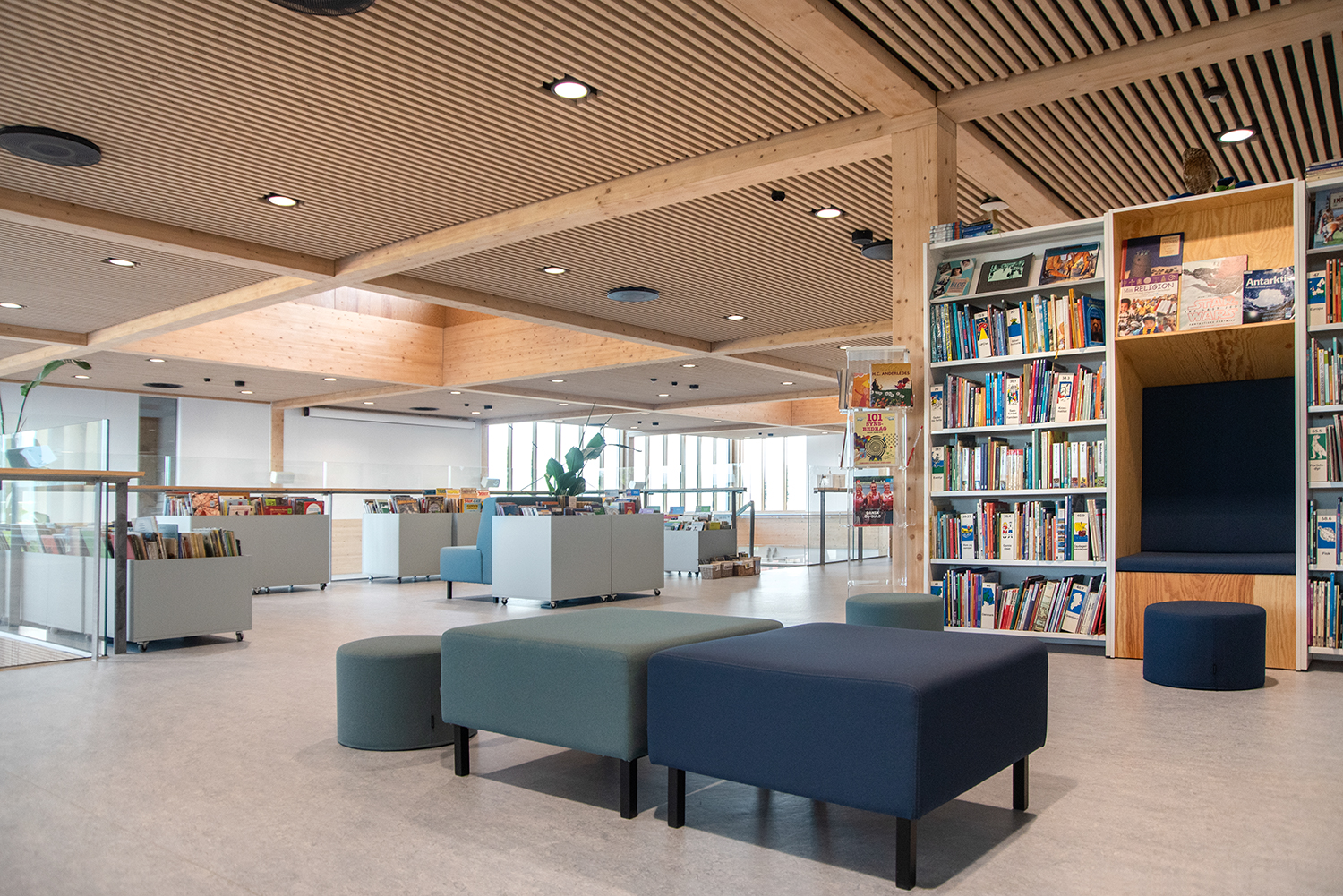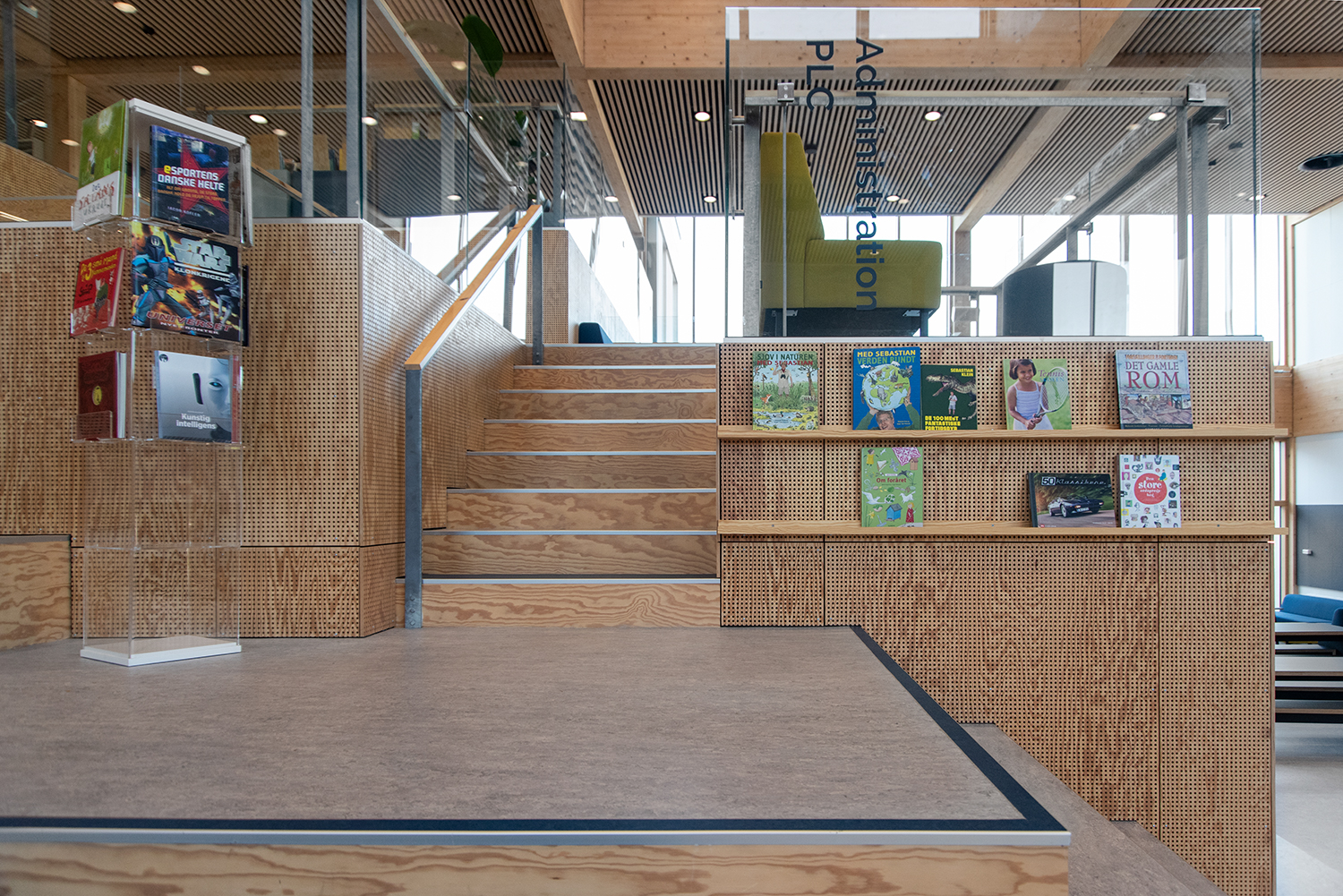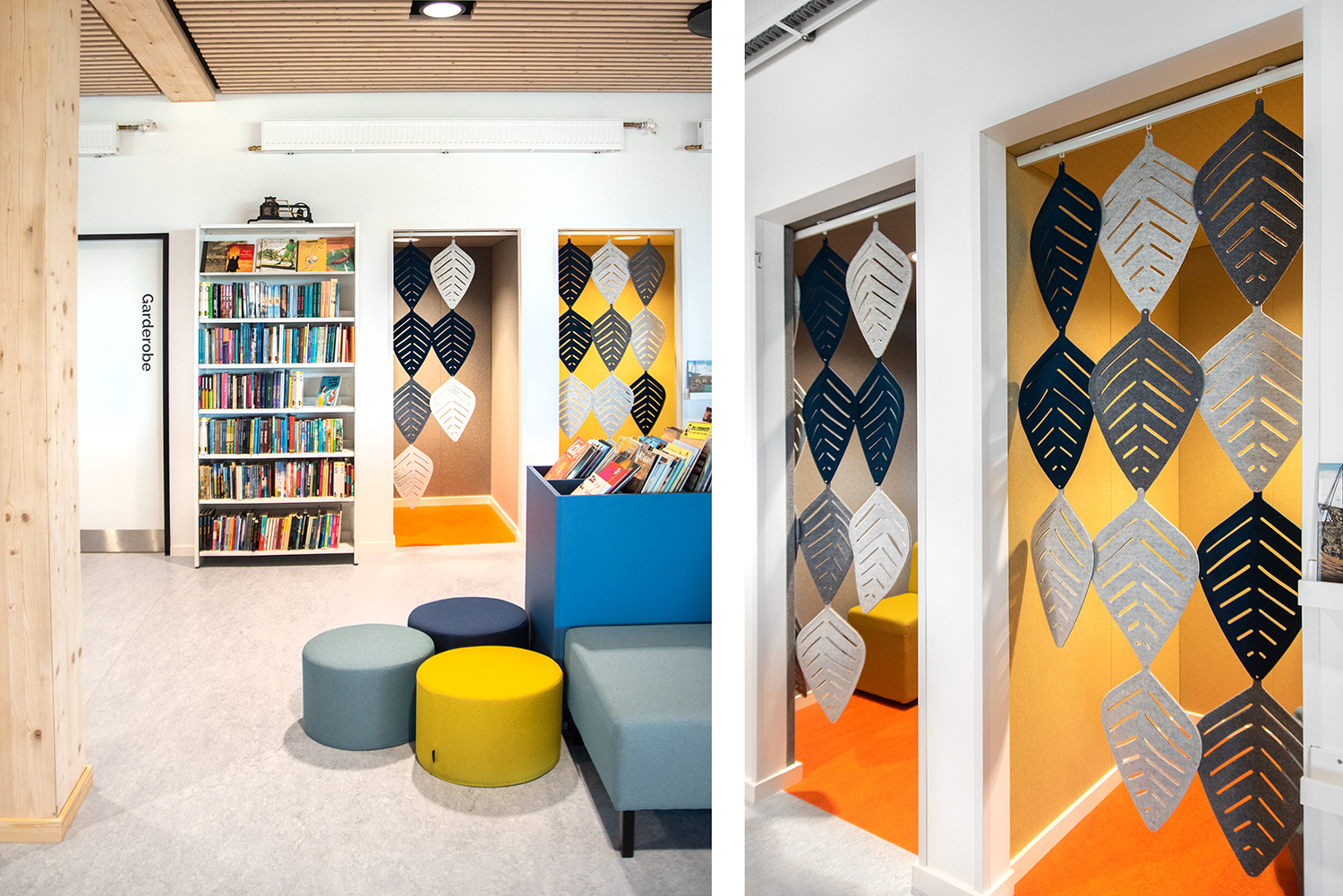 Die Visionen der Schule von Klima und Nachhaltigkeit werden durch unsere Regale und Möbel mit dem Nordic Ecolabel aus FSC-zertifiziertem Holz unterstützt. Ebenso bestehen alle Polster von Sofas und Poufs aus recycelten Materialien.