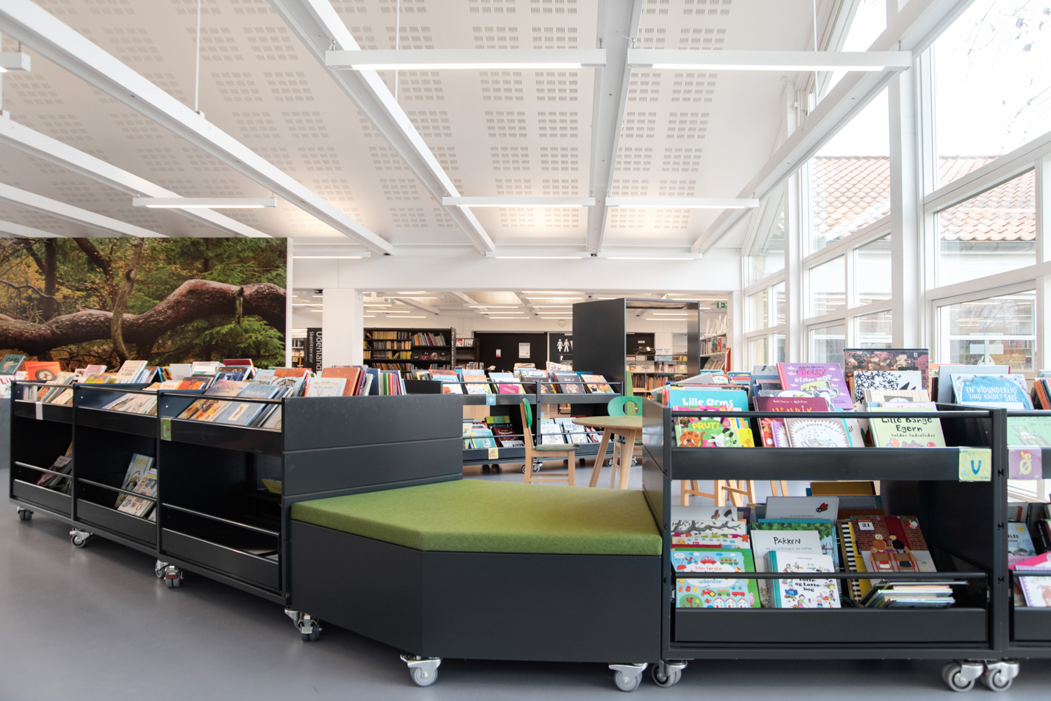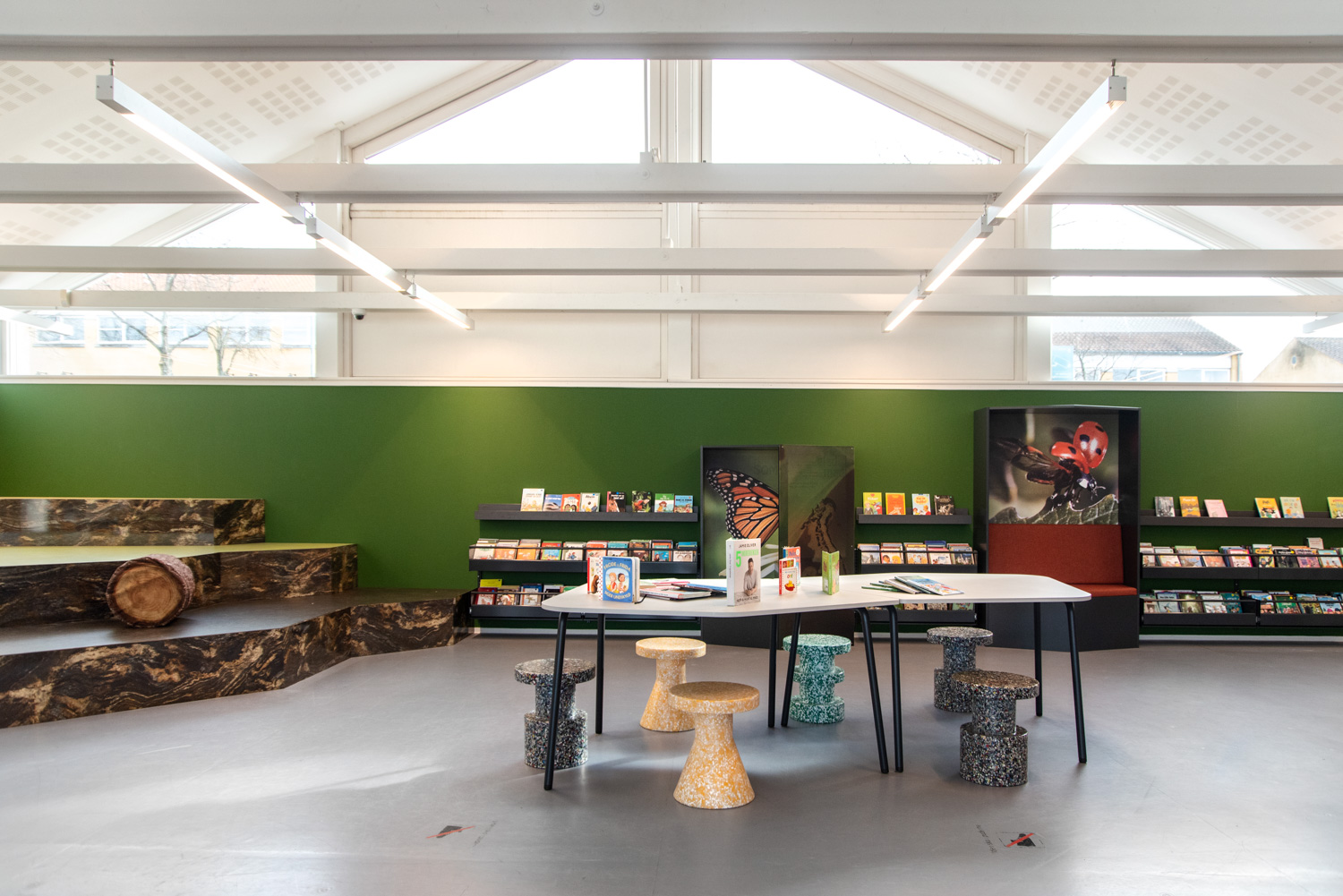 Bestehende Browser und Regalsysteme wurden mit fünfeckigen Lesehöhlen kombiniert, um organische Räume im Raum zu schaffen. Eine große Treppe zum Geschichtenerzählen mit kühlen Oberflächen ist ständig von kleinen und großen Gruppen besetzt, während die Kleinsten auf dem Sinnsteppich spielen und andere die Stille in der weichen Sitzecke genießen.