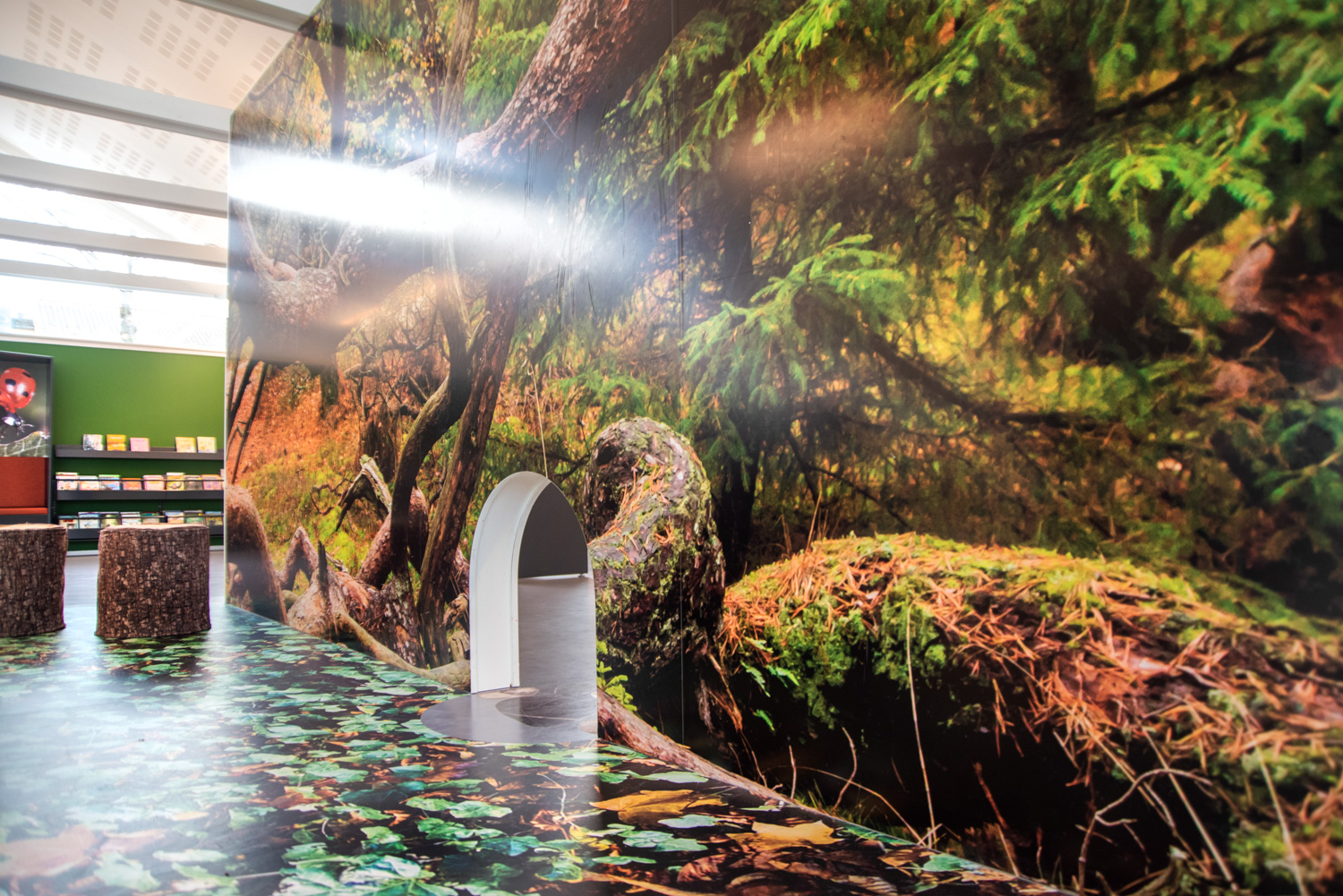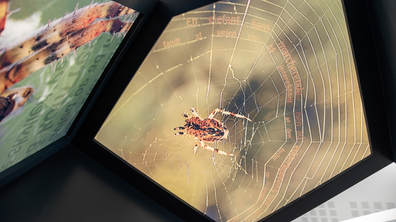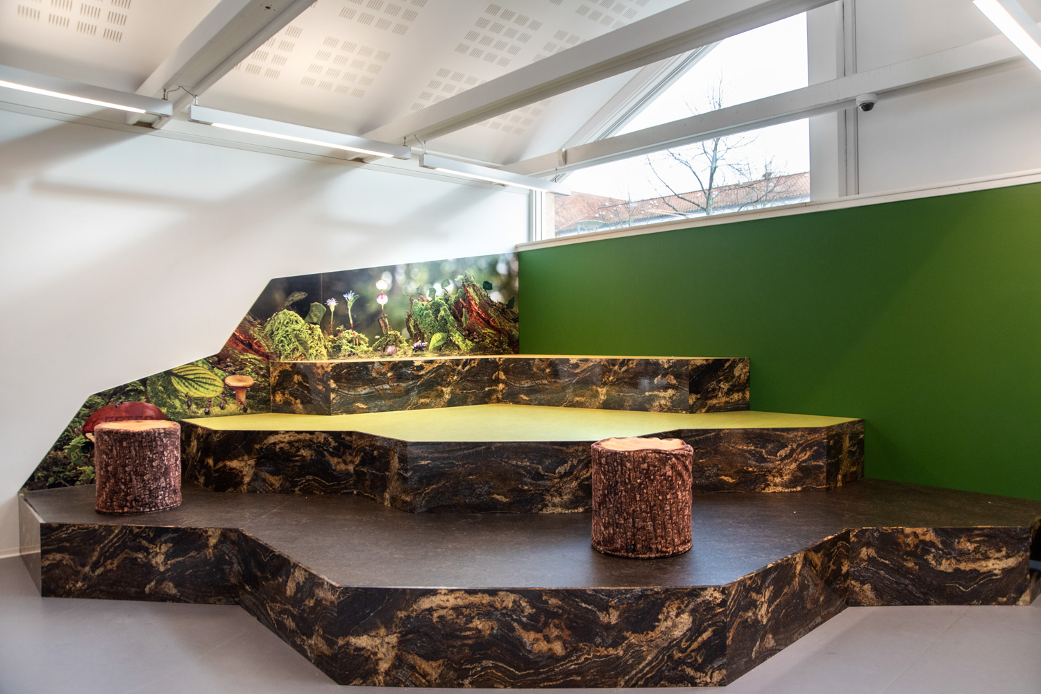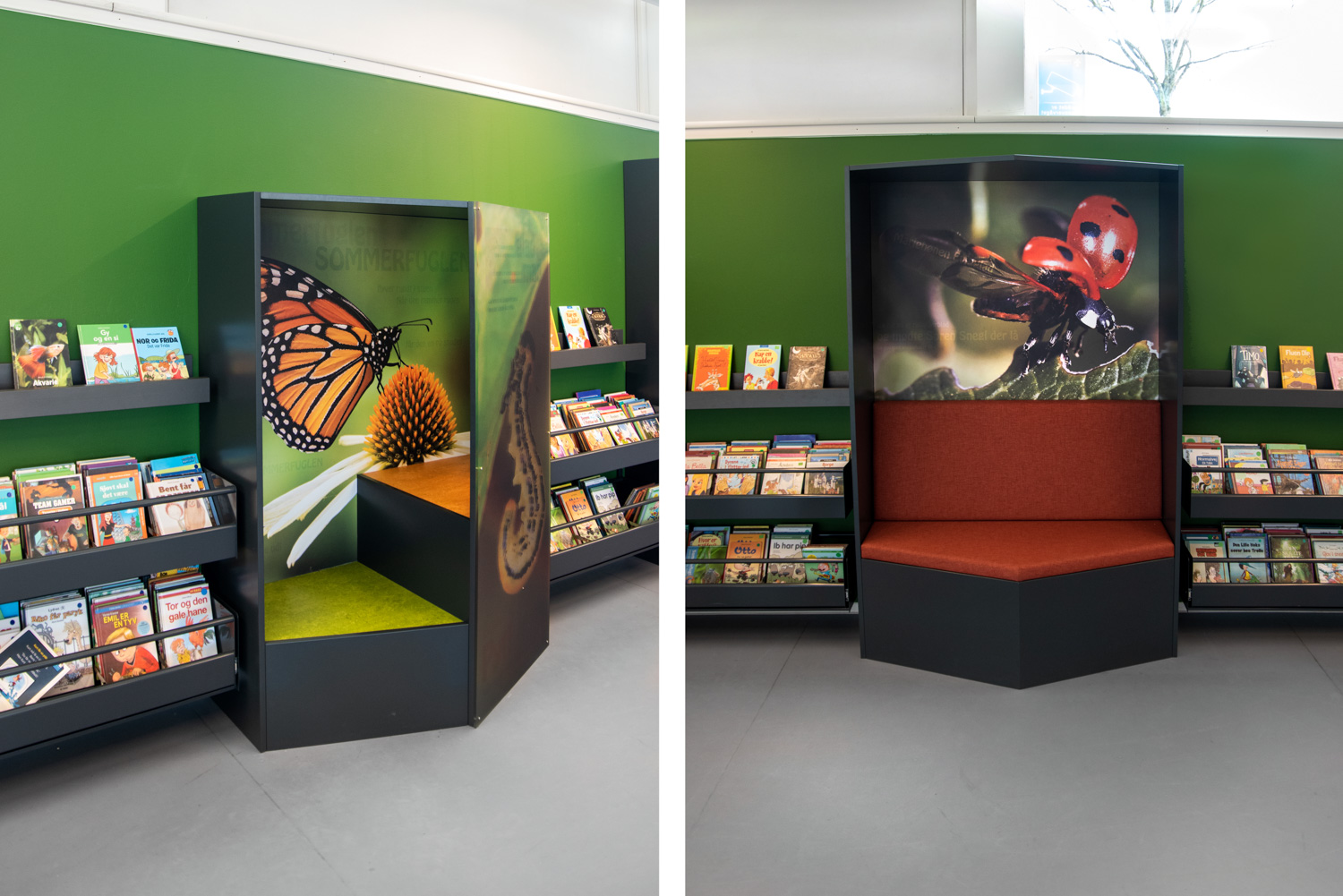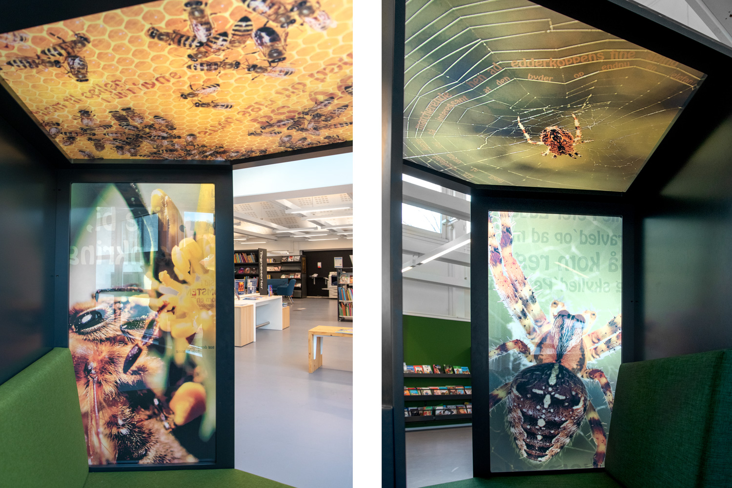 In Halsnæs Bibliothek ermöglichen die erstaunlichen Grafiken, die Insekten und die Natur zeigen, den Kindern, die Magie zu genießen und die Details aus nächster Nähe zu studieren. Sie finden bekannte Kinderlieder und "die 120 Wörter", die die Ameisen mit sich herumtragen, in die Grafik eingebaut. Auf diese Weise werden Elemente aus der Natur (biophiles Design) mit Sprachentwicklung, Leseinteresse, Immersion und Wahrnehmung kombiniert.